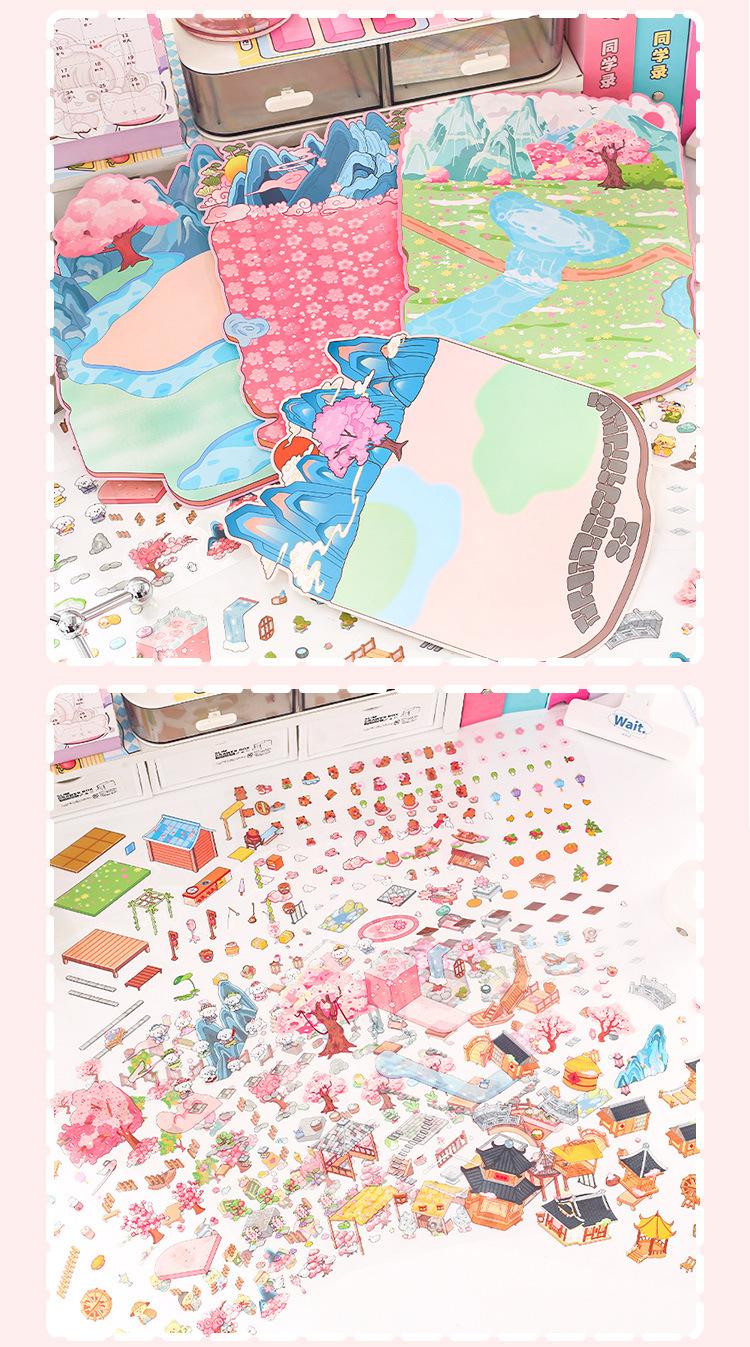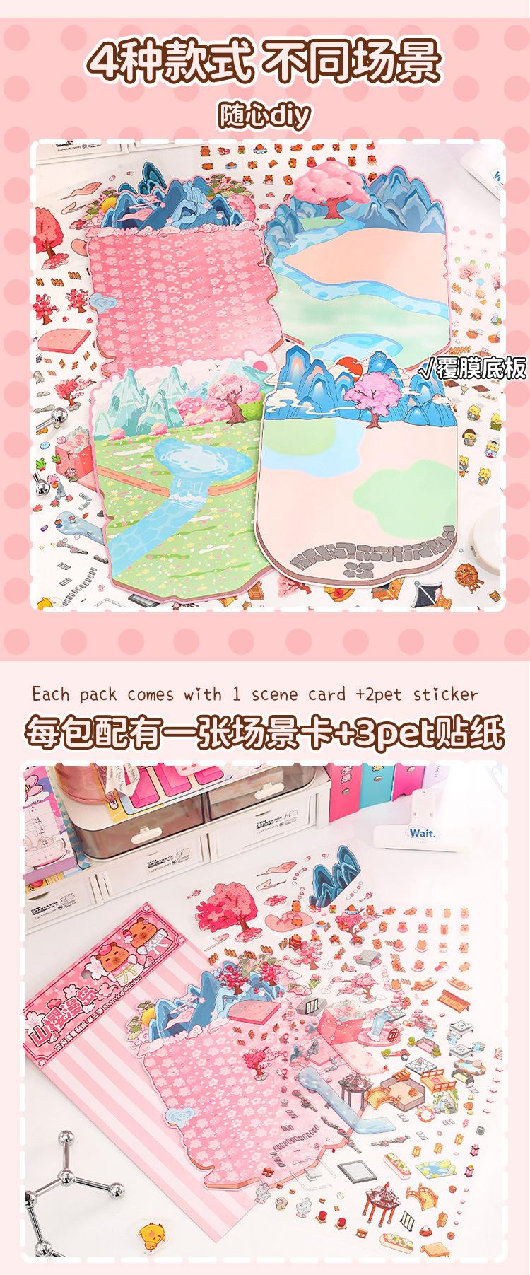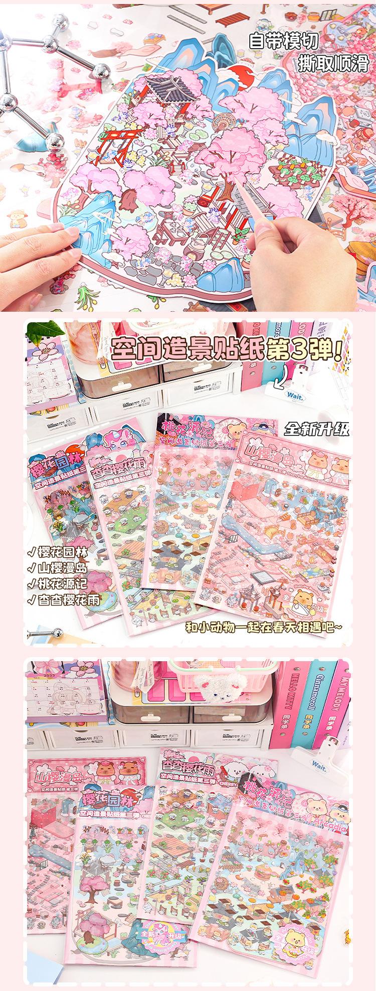 Pegatina de paisajismo espacial, tercera viñeta, flor de cerezo primaveral, paisajismo estéreo, pegatina de PET, bricolaje, escena en miniatura sin cortes