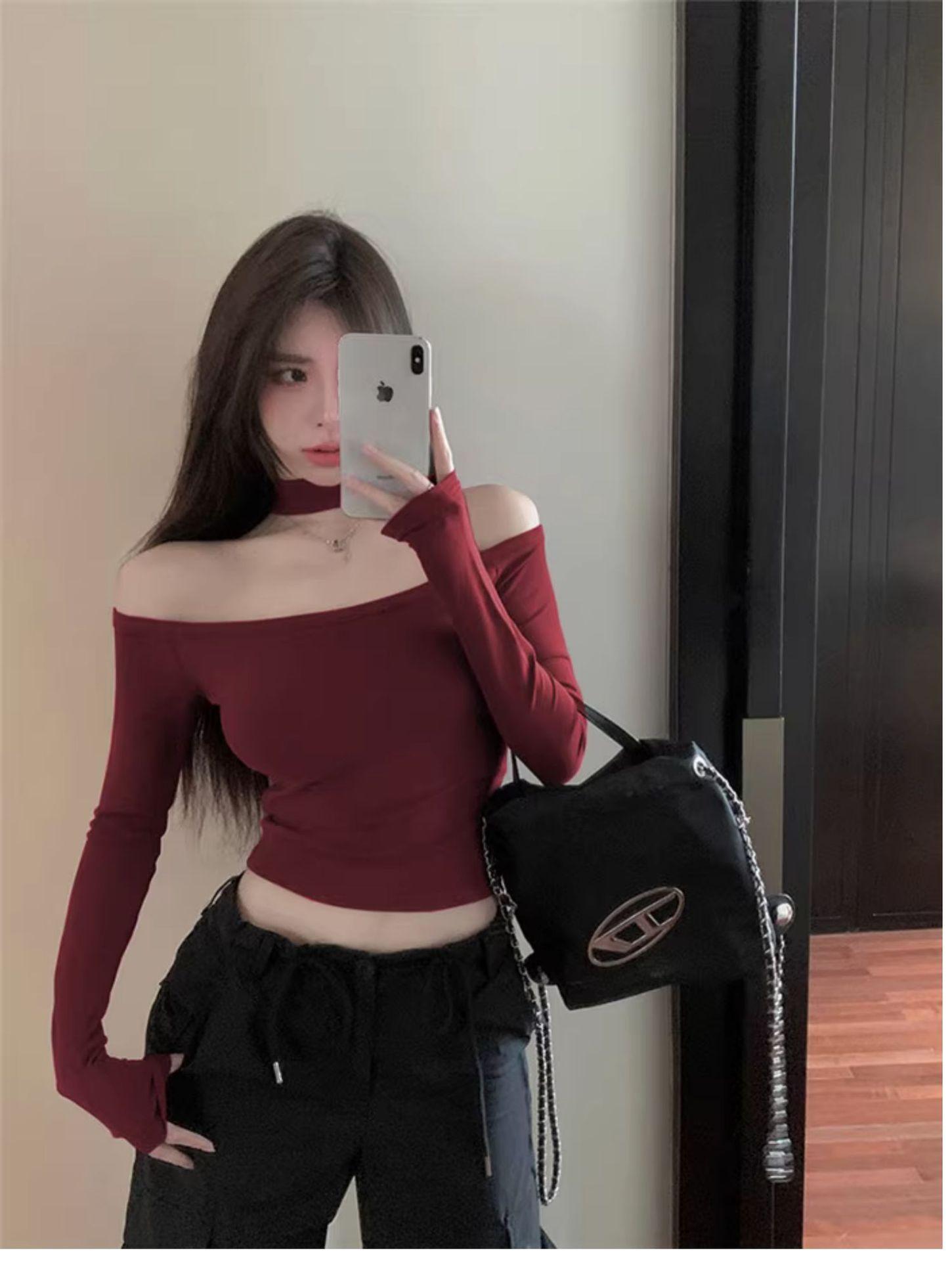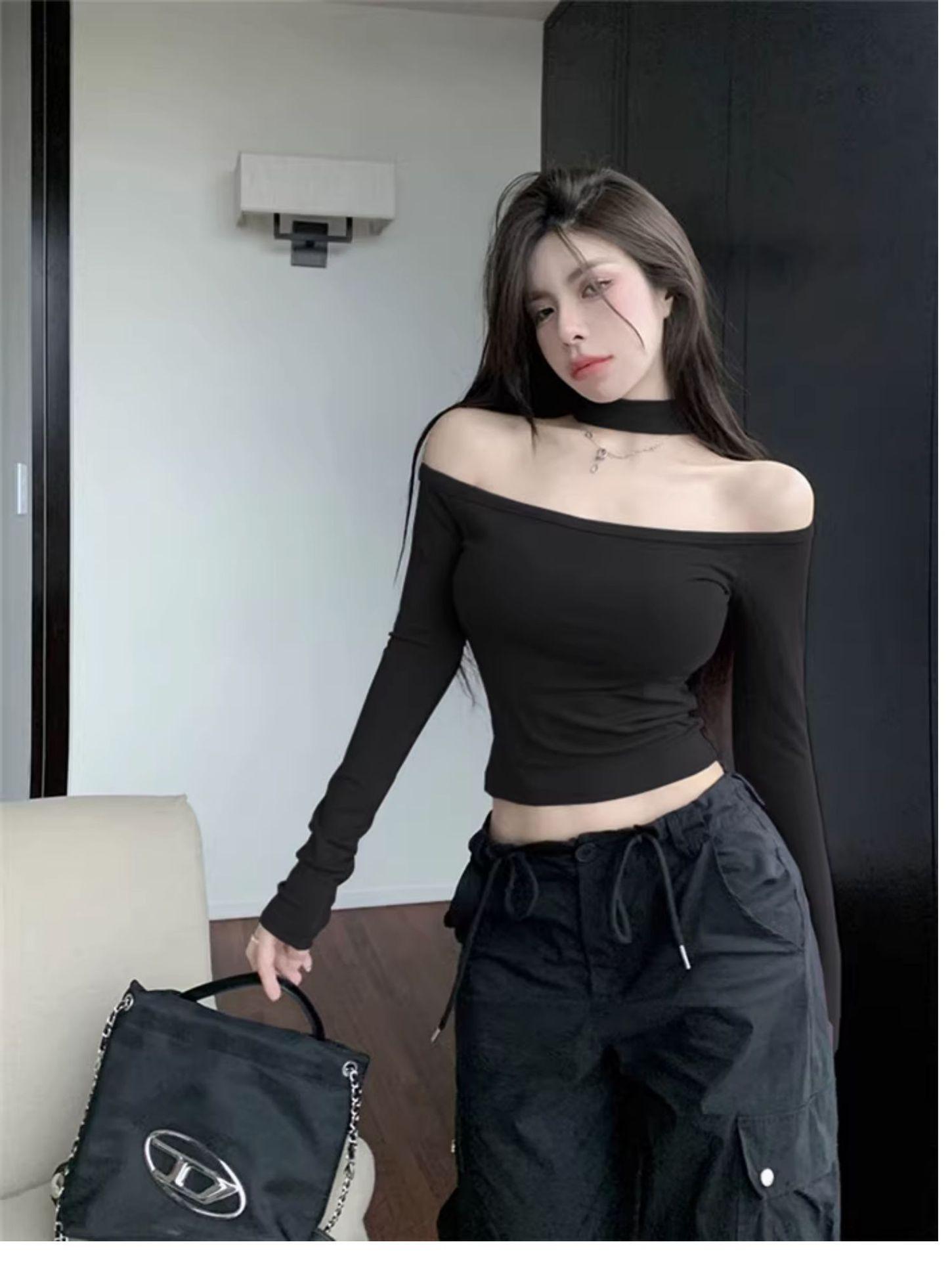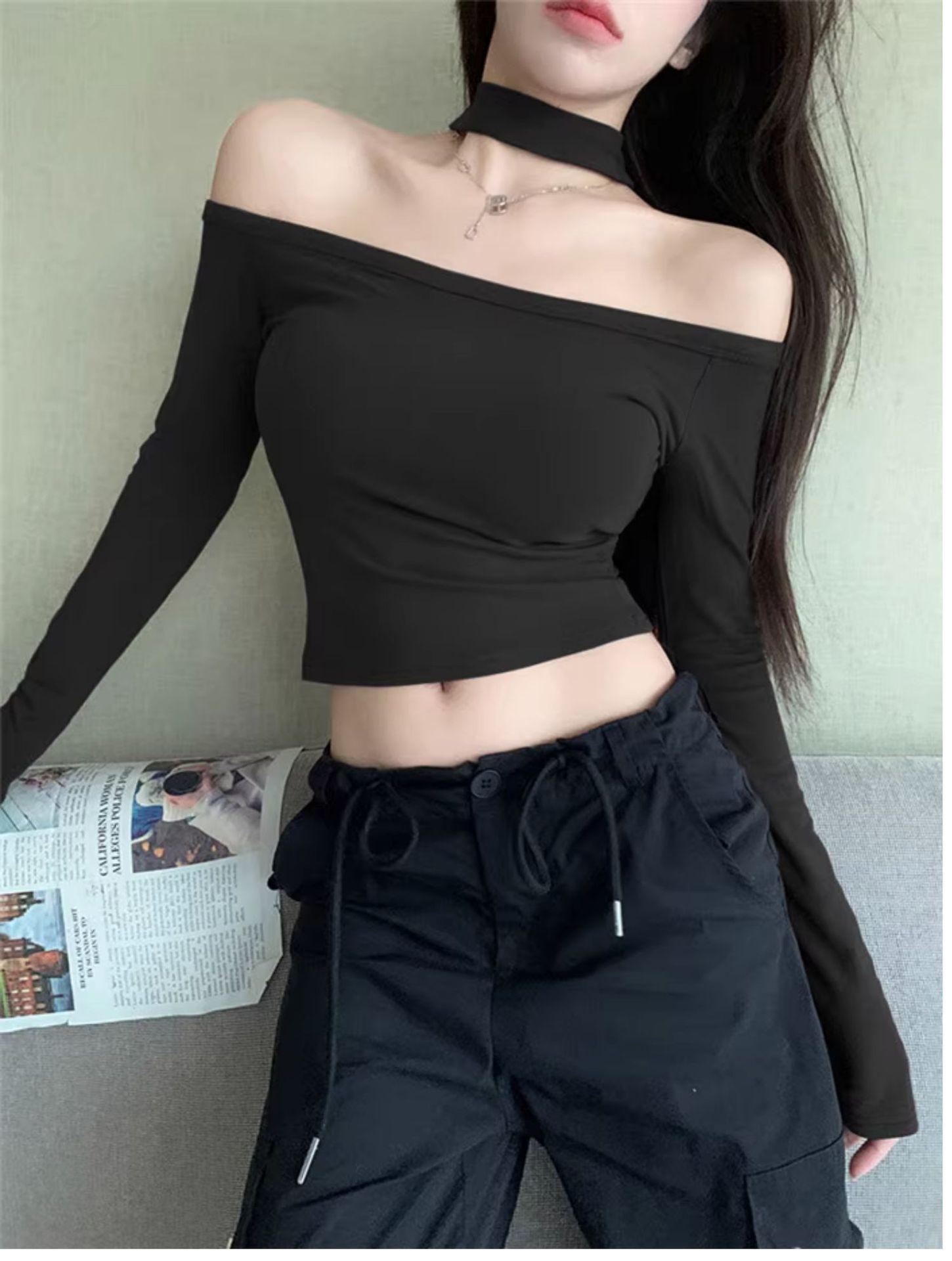 Camiseta base de manga larga con cuello halter y hombros descubiertos para chica sexy, otoño, sexy, delgada, corta, con temperamento, para mujer
