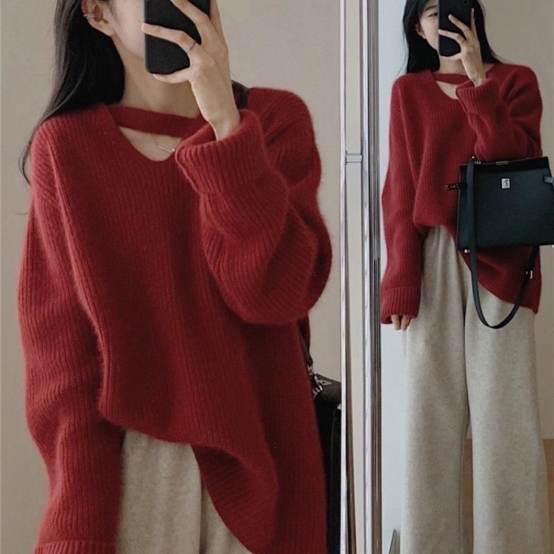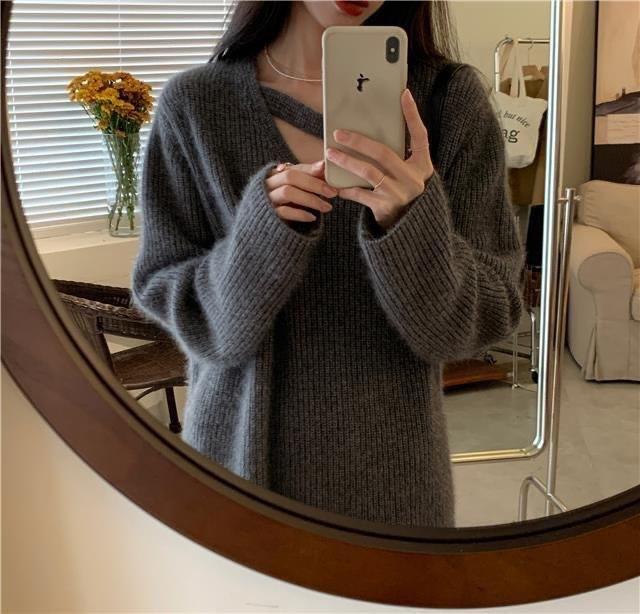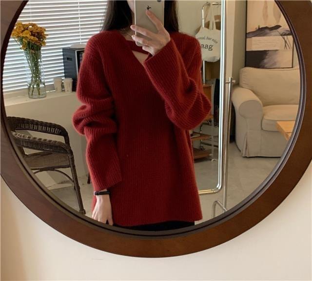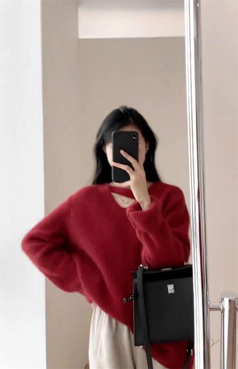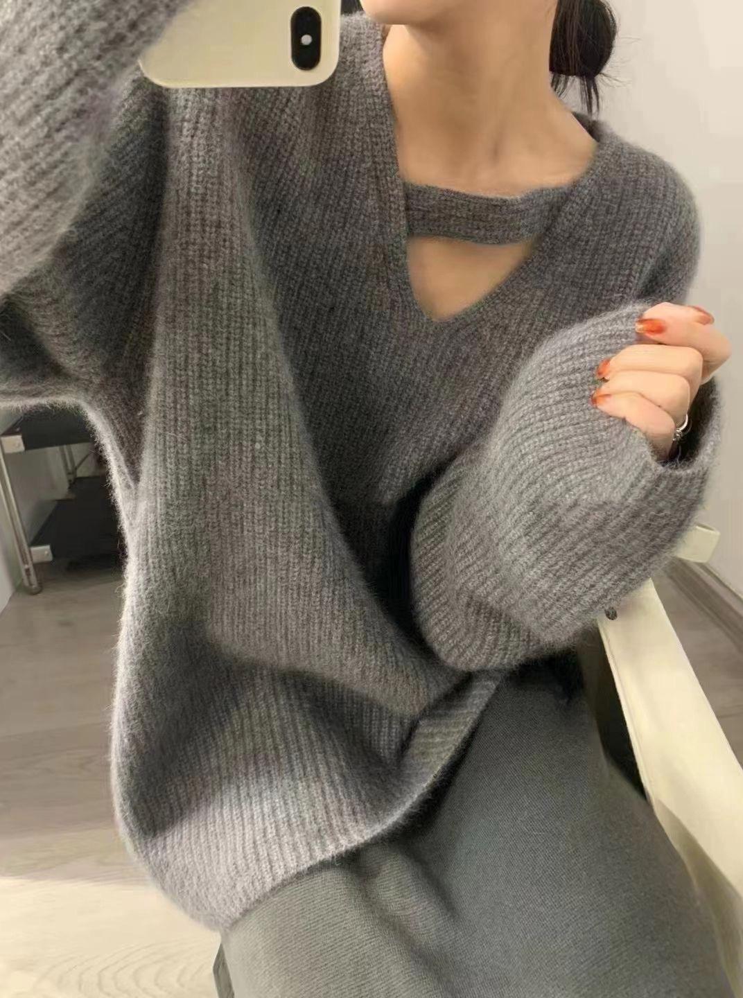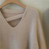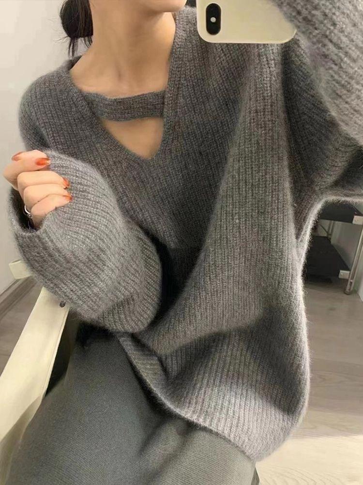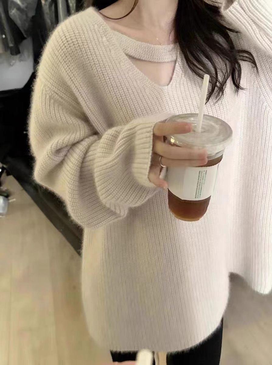 Suéter holgado de color liso con cuello en V, diseño de nicho, estilo Hong Kong, retro, elegante, combinable, otoño e invierno de 2024
