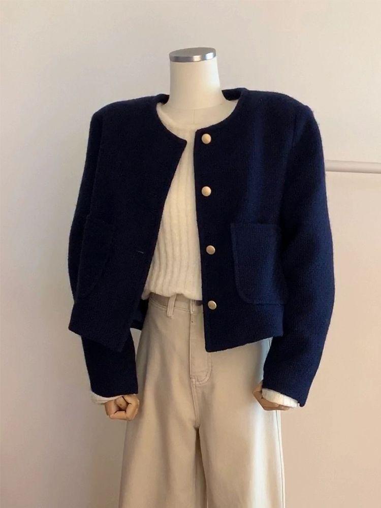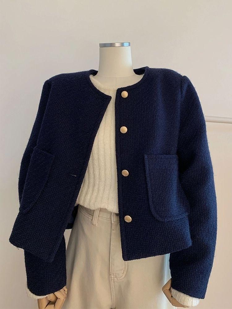 Abrigo Azul Marino Outer Wear Estilo Socialité Retro Nuevo Estilo Estilo Fragante Cuello Redondo Estilo Francés Elegante Para Ir al Trabajo Moda de Primavera y Otoño