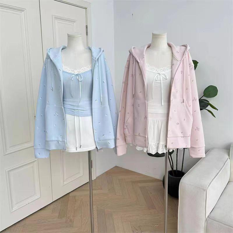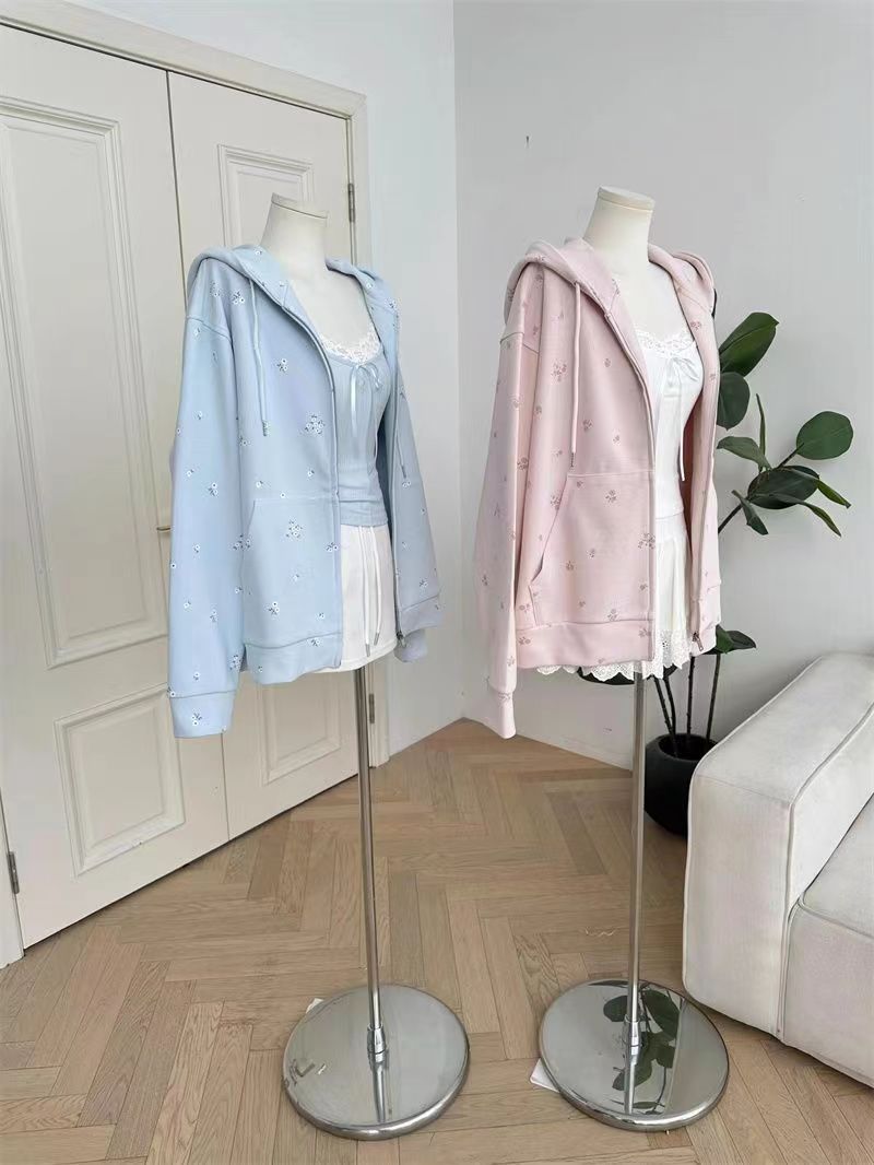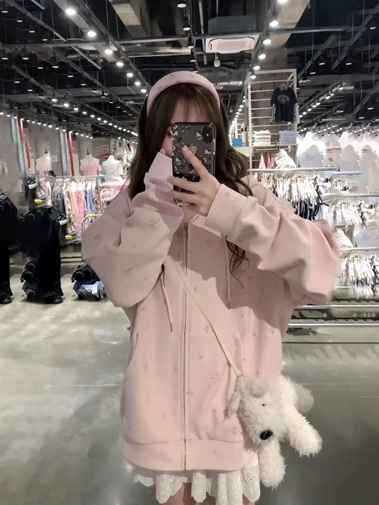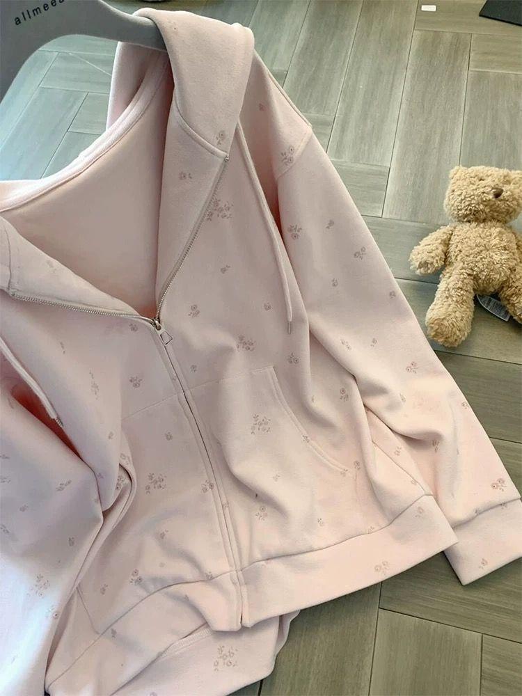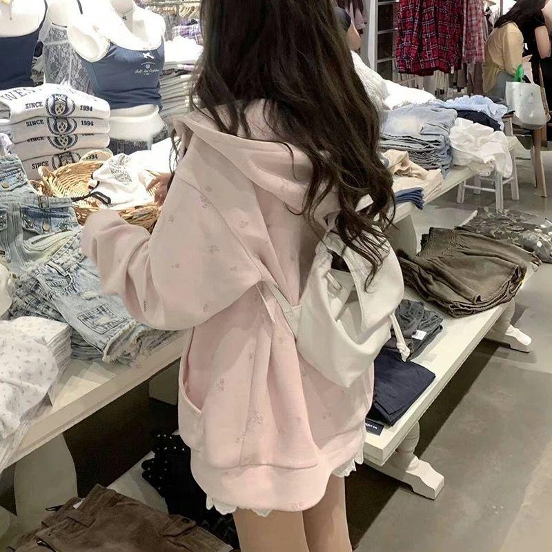 Suéter tipo cárdigan con capucha, estilo americano, floral, vintage, rosa, para mujer, primavera y otoño, holgado, diseño holgado, chaqueta con cremallera de nicho.