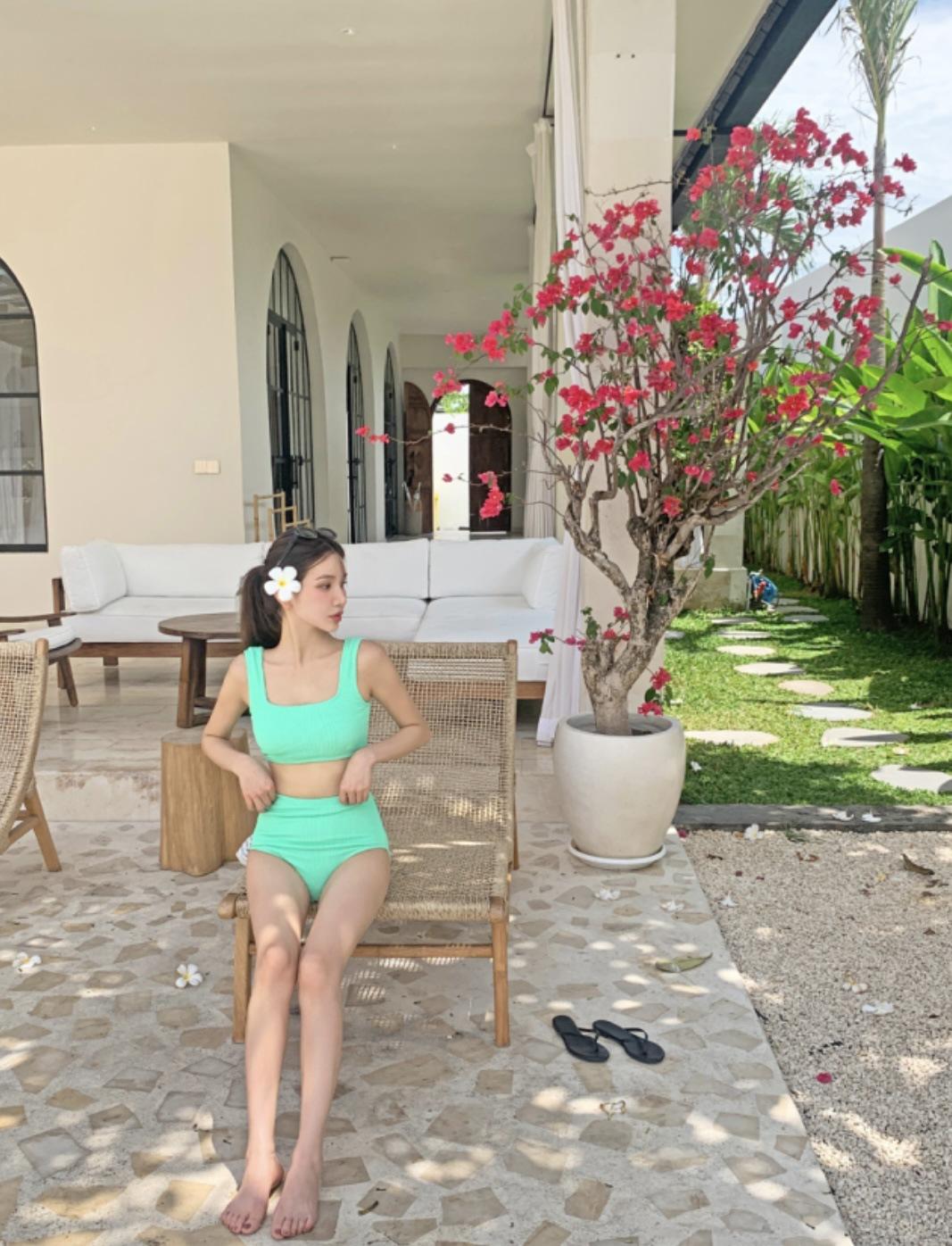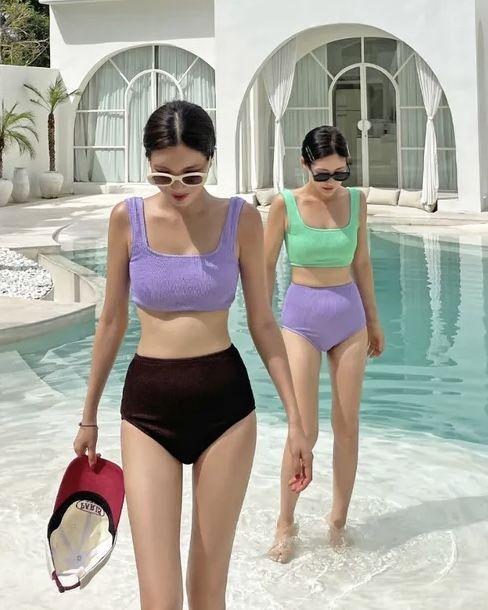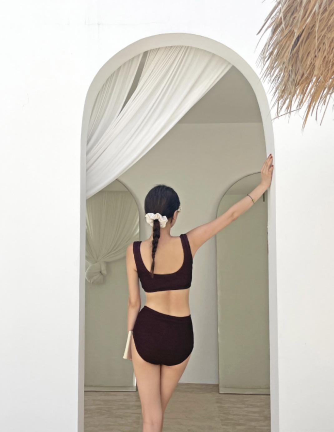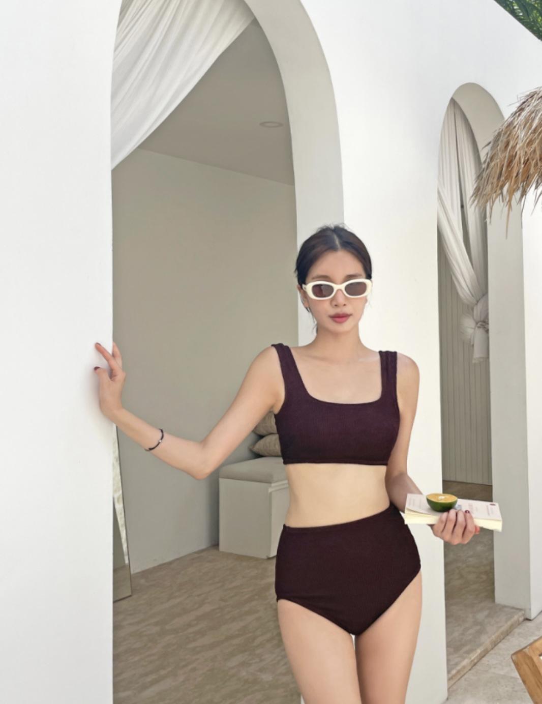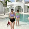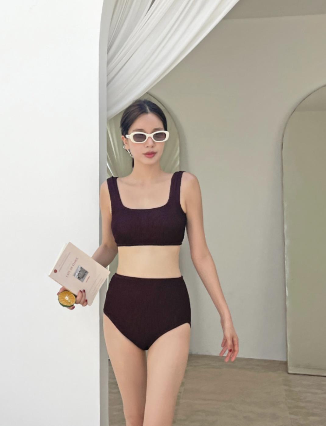 Traje de baño de estilo coreano 2025 con abertura en contraste de color sólido, bikini de cintura alta con tirantes para mujer, bikini para vacaciones de primavera.