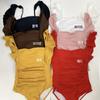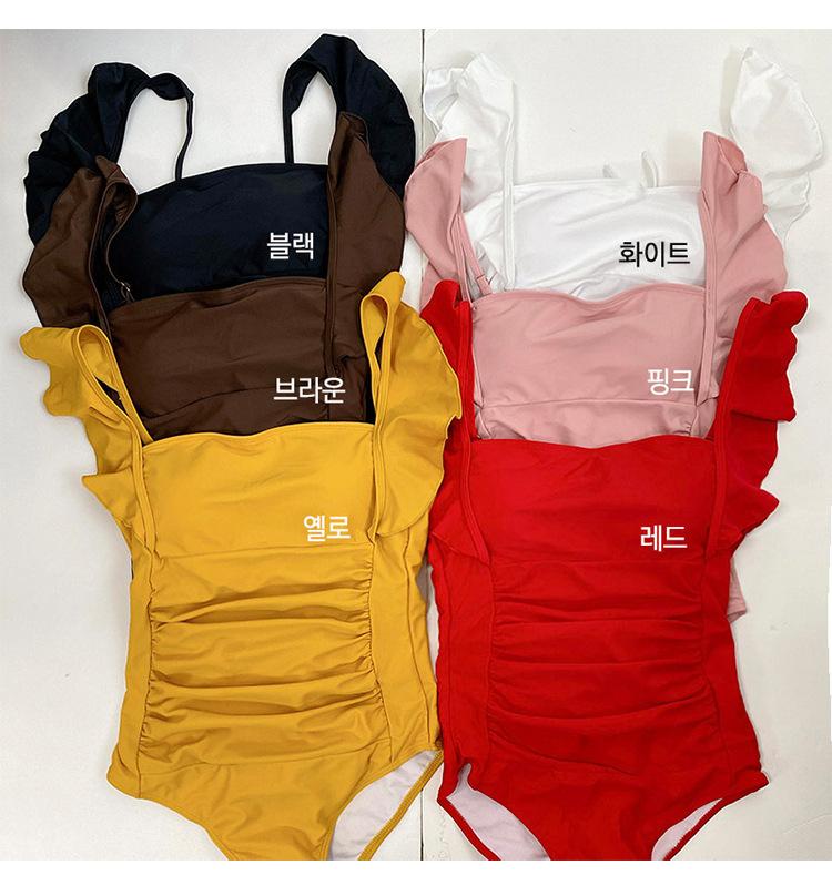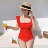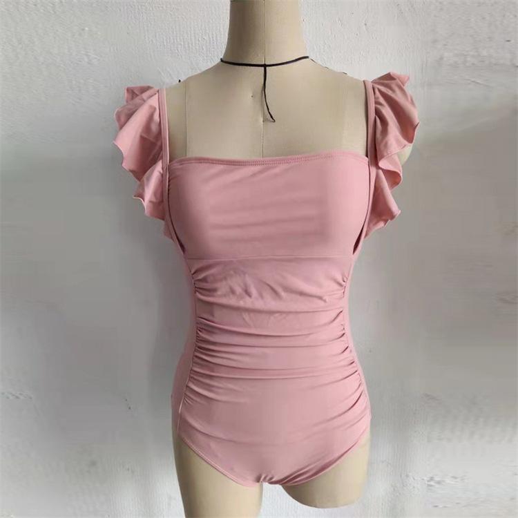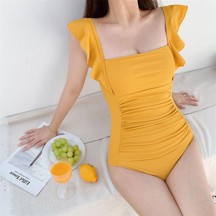 Traje de baño nuevo de color sólido 2025 para mujer, de una pieza, con hombro de oreja de madera, cuello cuadrado, fresco, delgado, elástico, moda, traje de baño para aguas termales