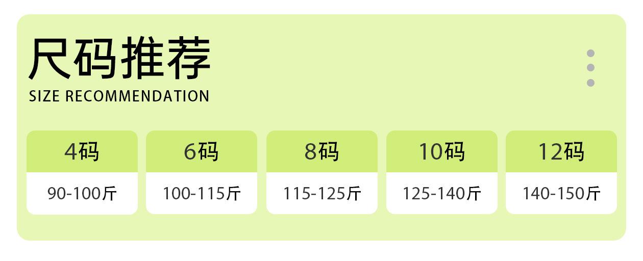 4( 45-50kg ), 6( 50-57.5kg ), 8( 57.5-62.5kg ), 10( 62.5-70kg ), 12( 70-75kg )