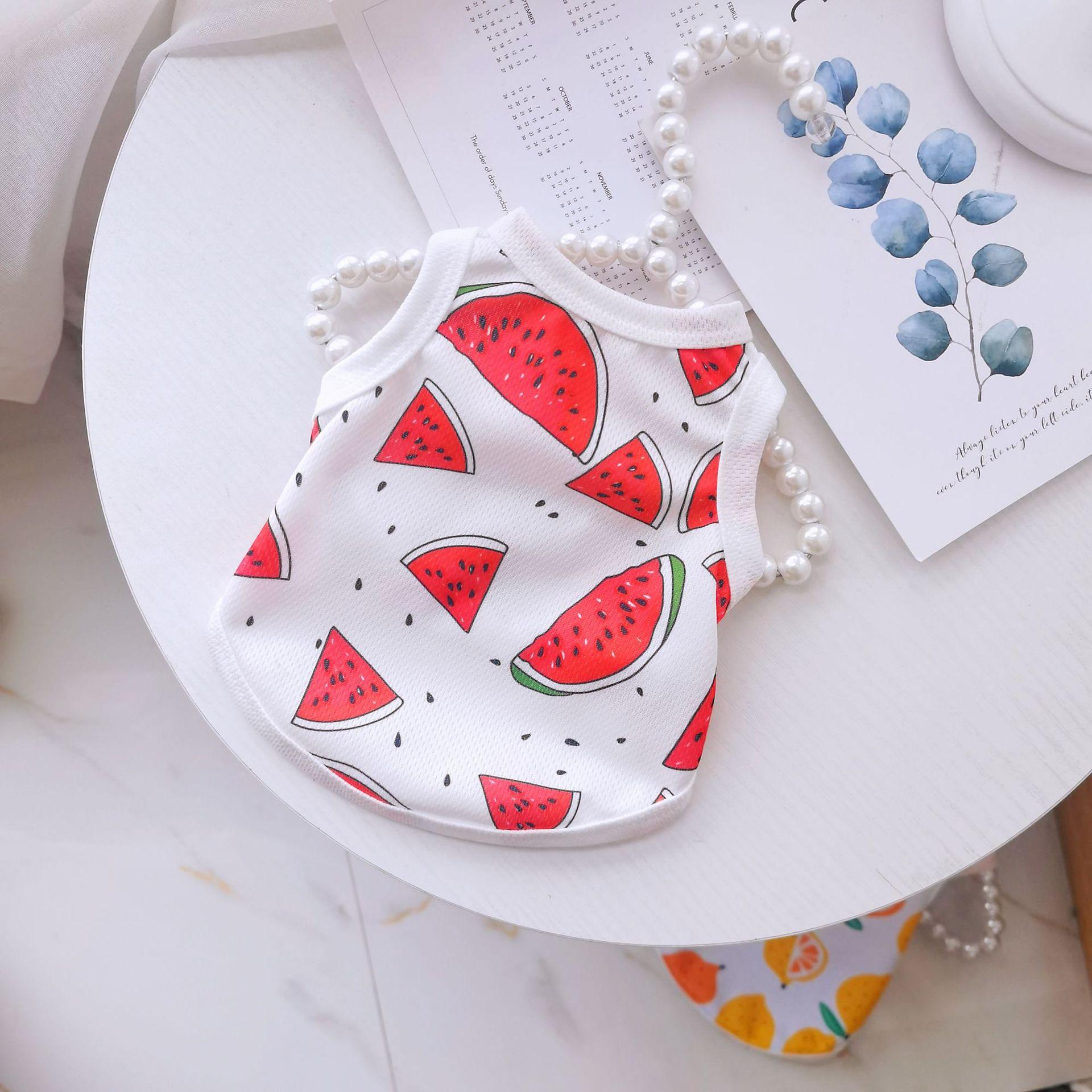 Chaleco para perro verano nuevo mascota transpirable ojo de pájaro ropa para gato lindo fruta delgado ropa fresca en stock