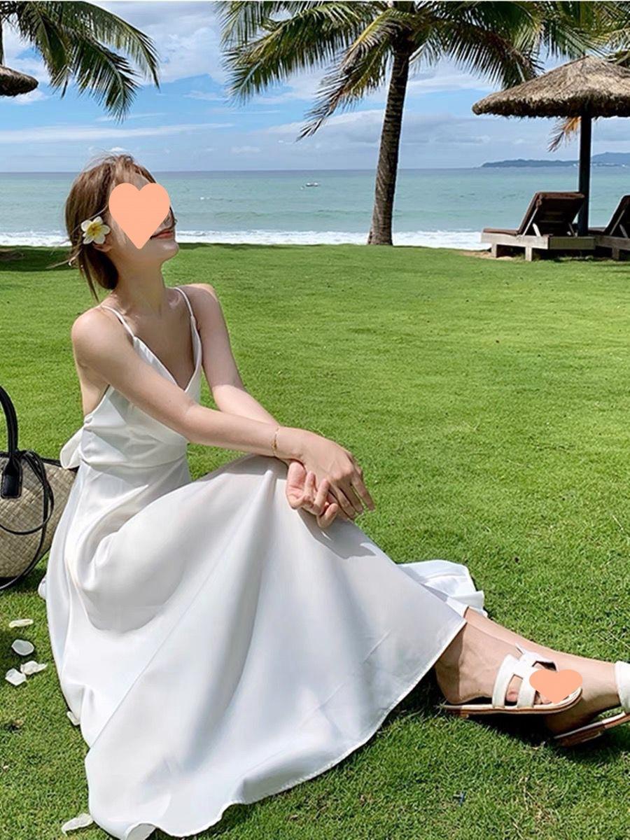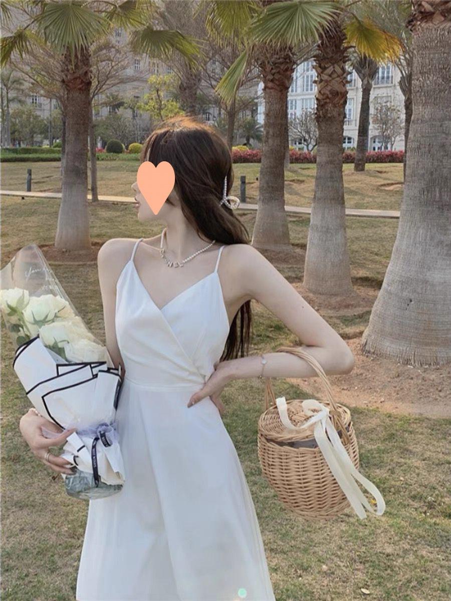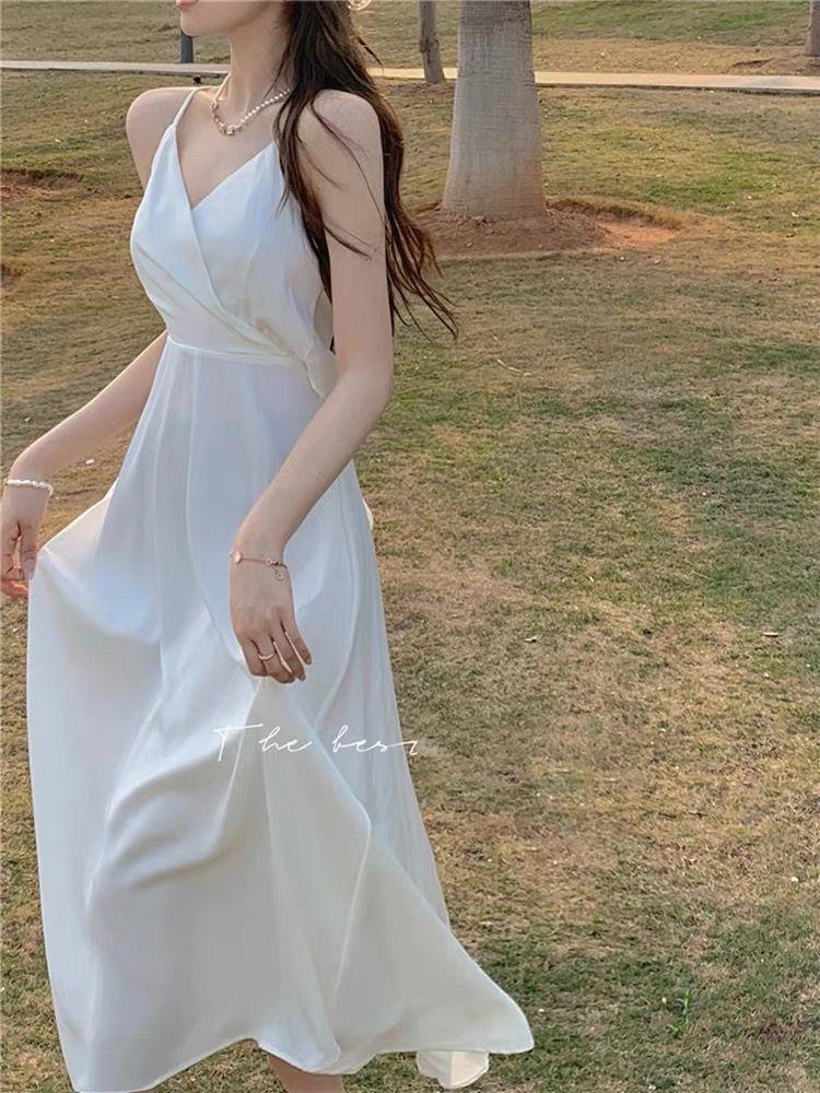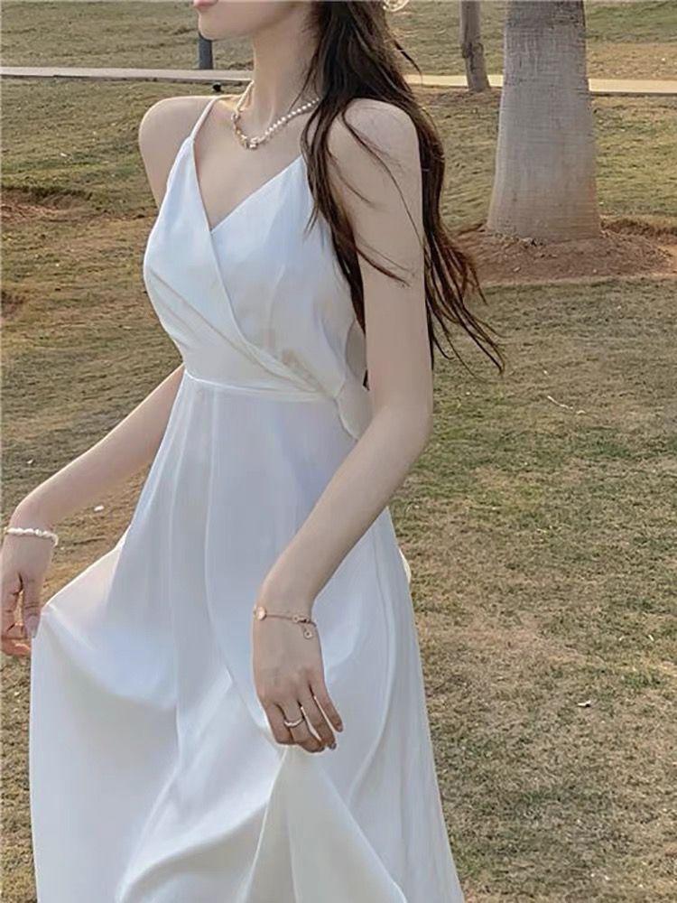 Verano 2025 Nuevo Vestido Blanco de Mujer de Largo Medio con Falda de Lazo y Cuello en V [Doble Capa con Forro]
