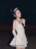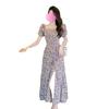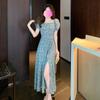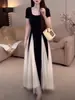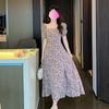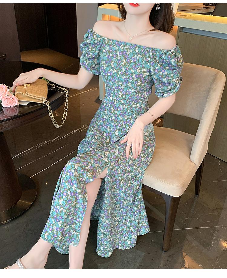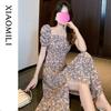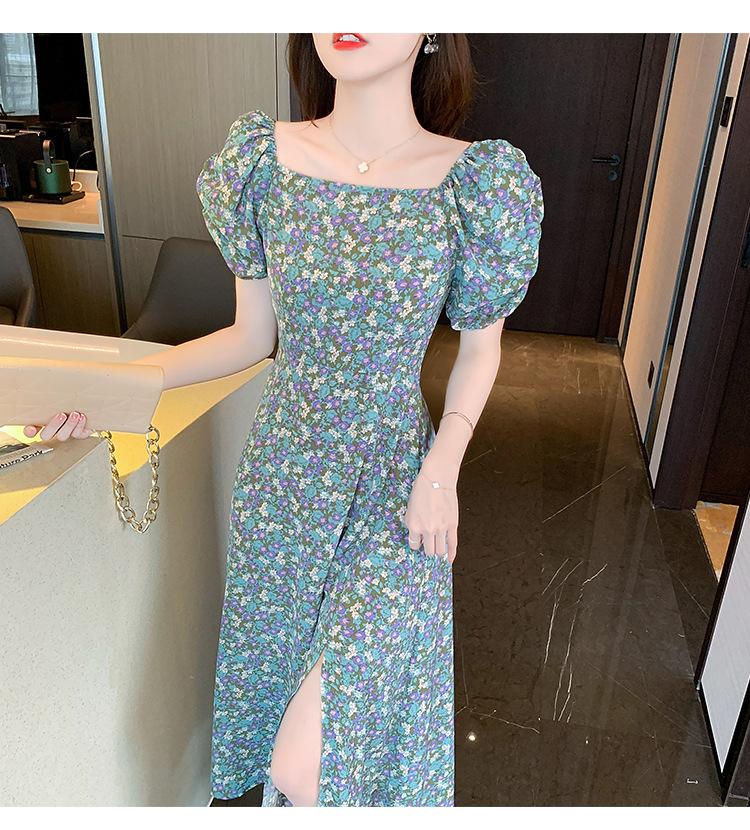 Vestido floral de estilo francés con cuello cuadrado y mangas abullonadas para mujer, elegante vestido de verano de alta gama de gasa con abertura en la cintura y largo.