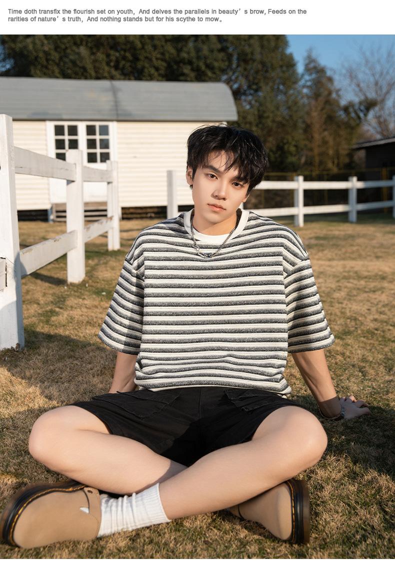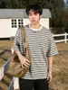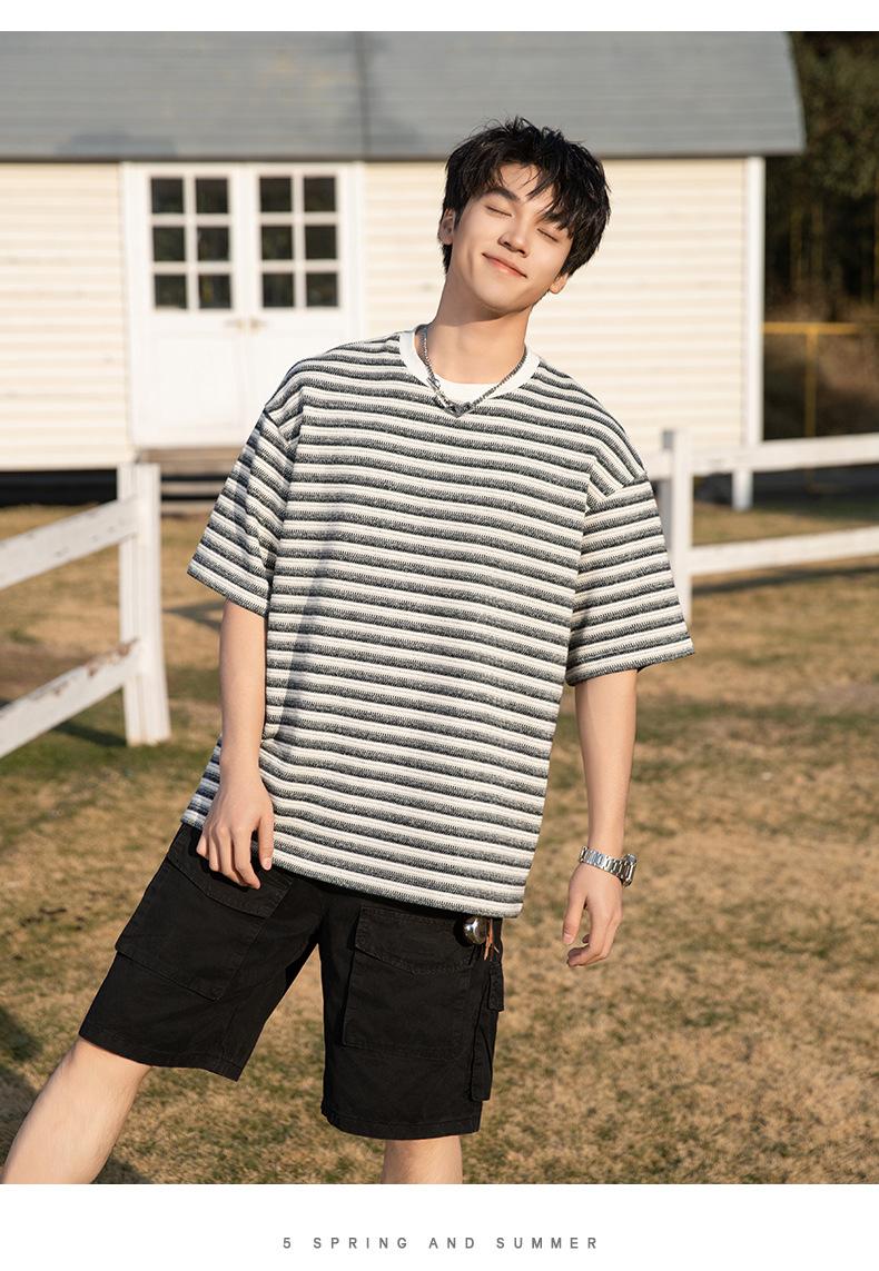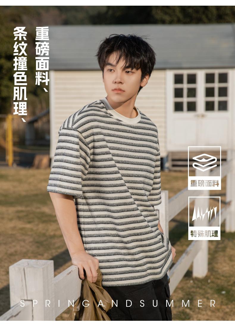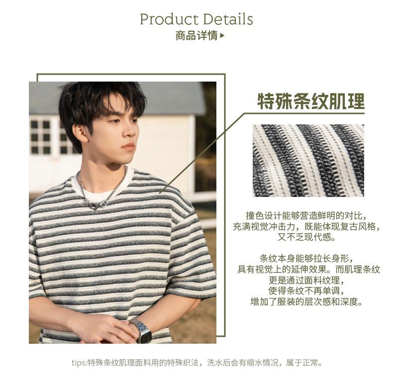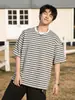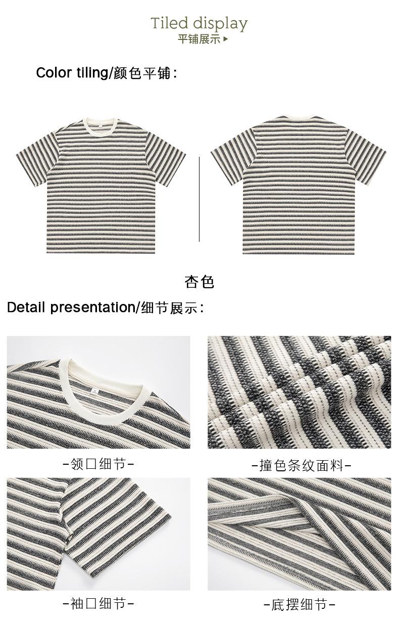Playera de Manga Corta Rayas de Contraste Pesado 310g para Hombre Verano Casual Suelta Moderna Marca Retro Texturizada Q