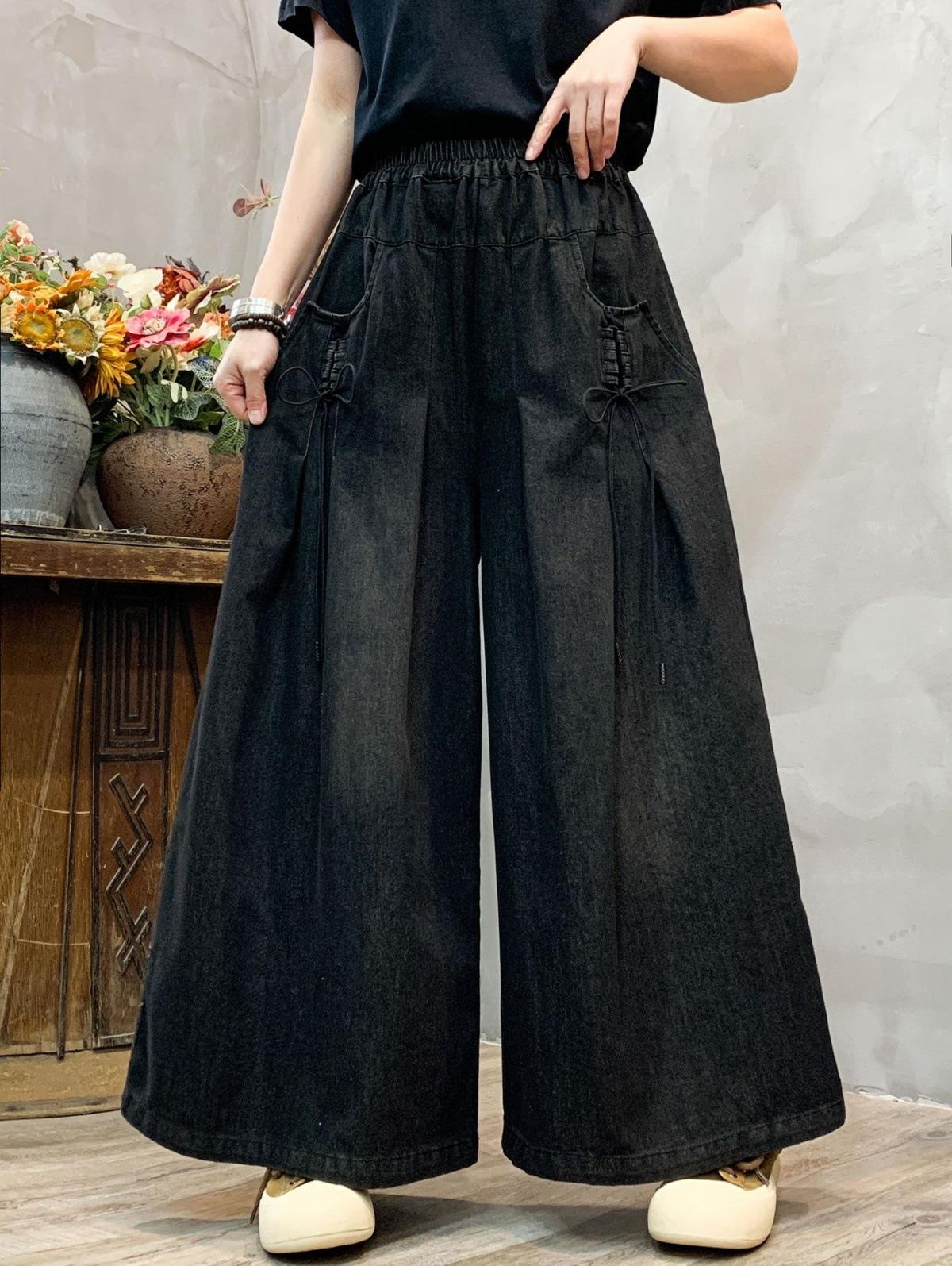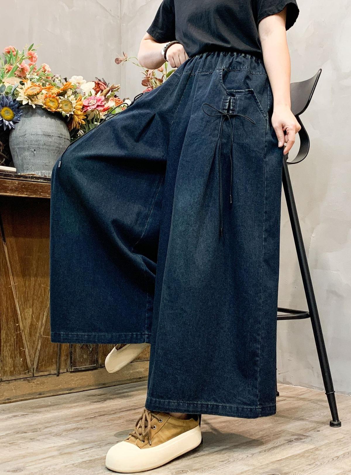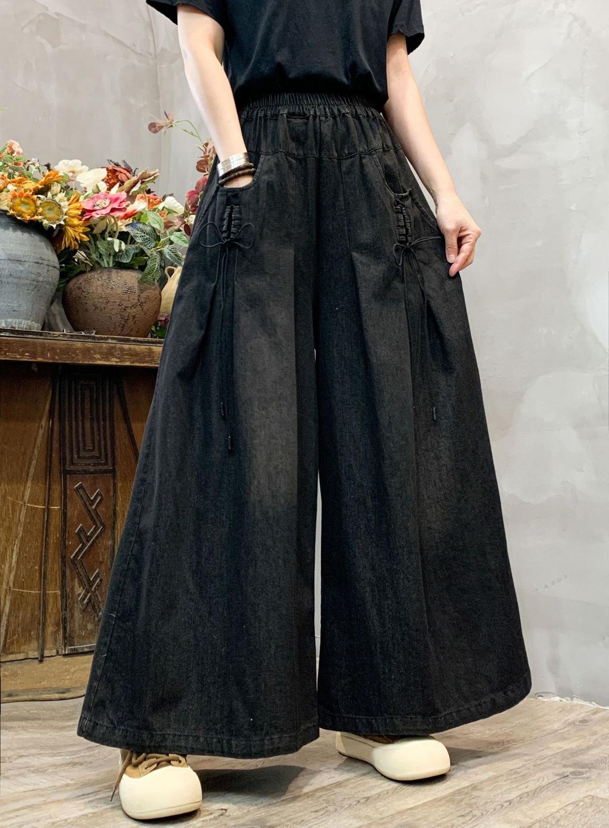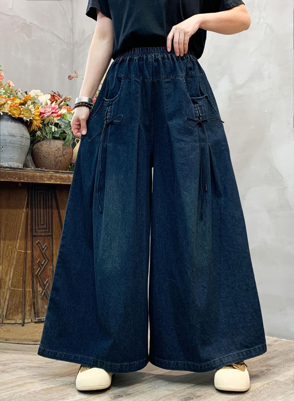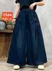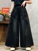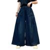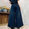 Primavera y Otoño Nuevo Elástico Cintura Alta Plisado Denim Pantalones Pierna Ancha Mujer Talla Grande Suelto Delgado Recto Faldas Pantalones