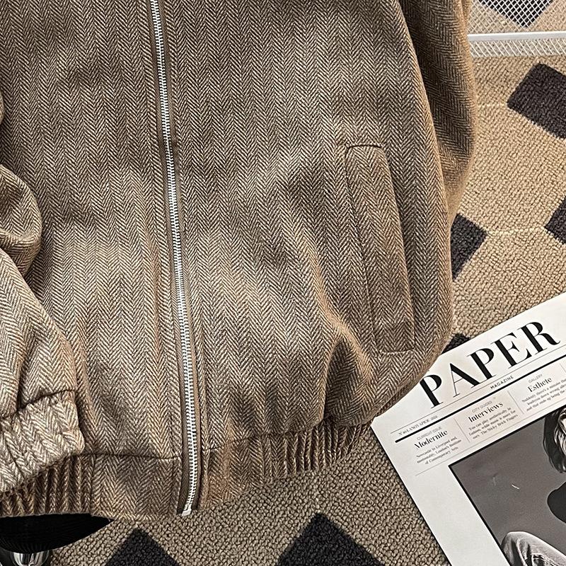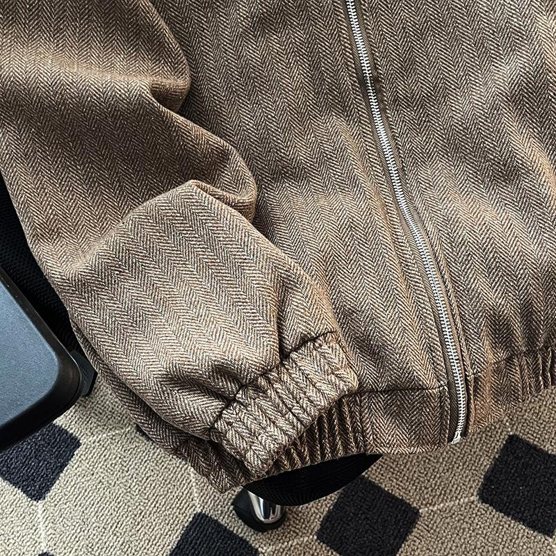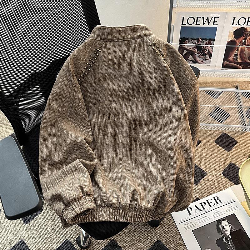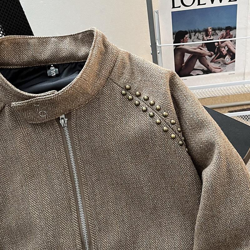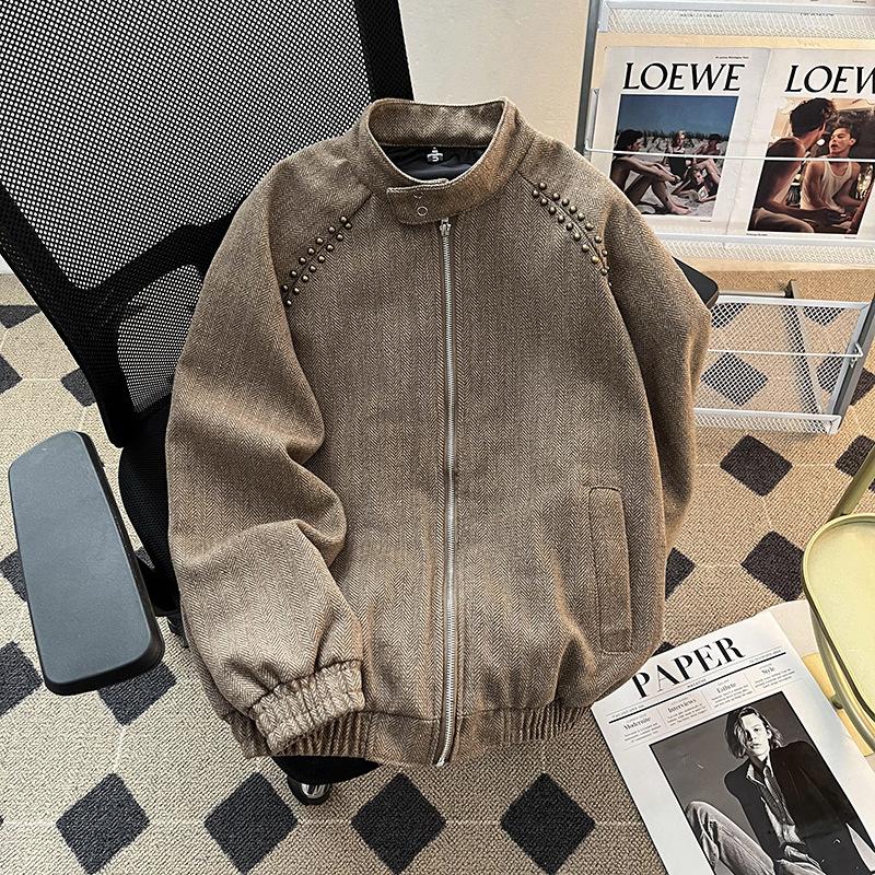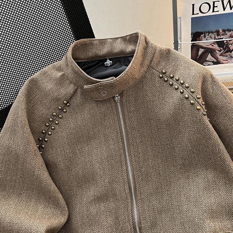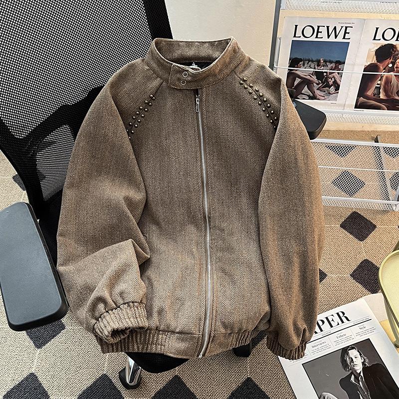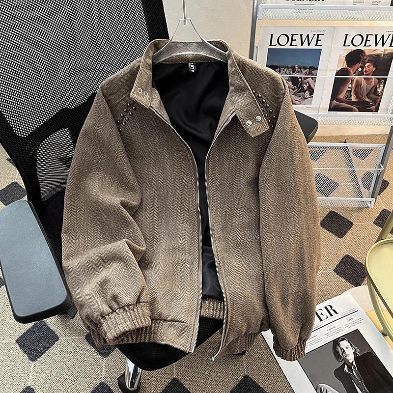 Chaqueta informal retro de estilo americano para hombre, primavera y otoño 2025, diseño de nicho, estilo antiguo, con remaches, cuello vertical suelto.