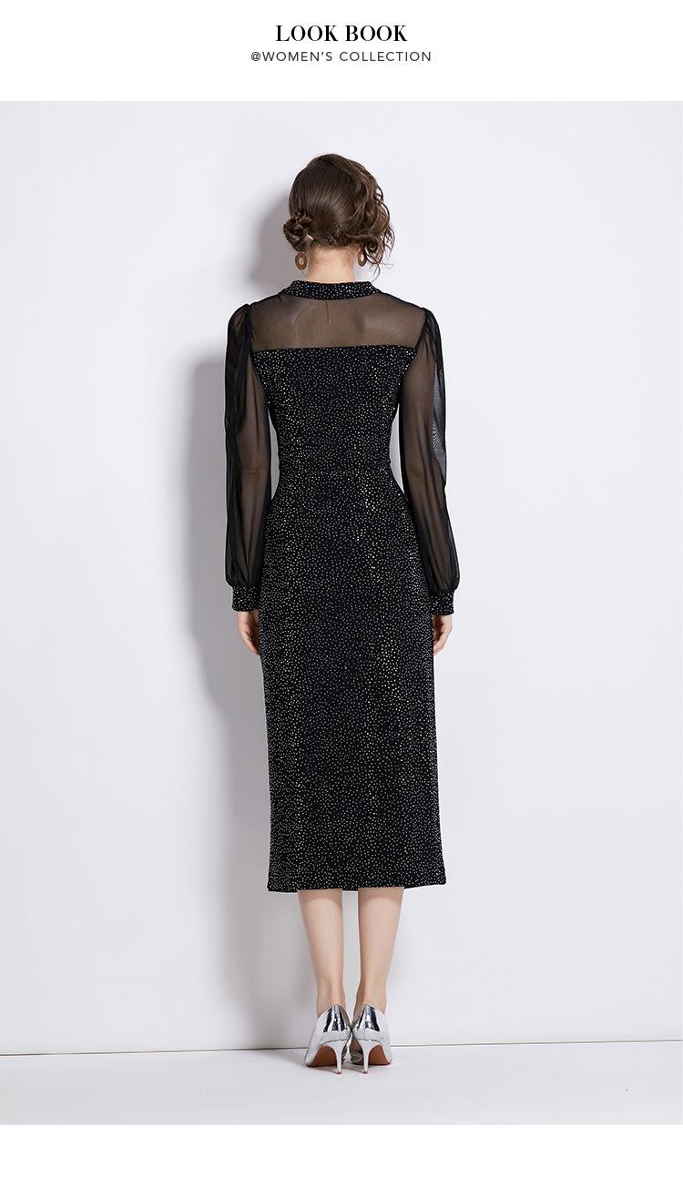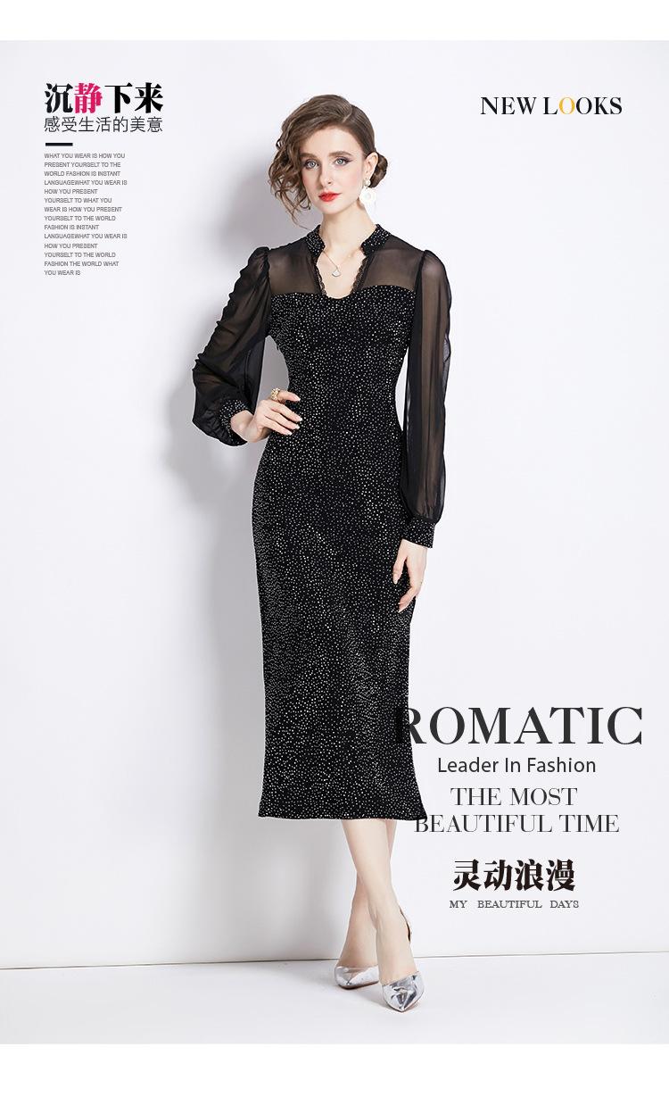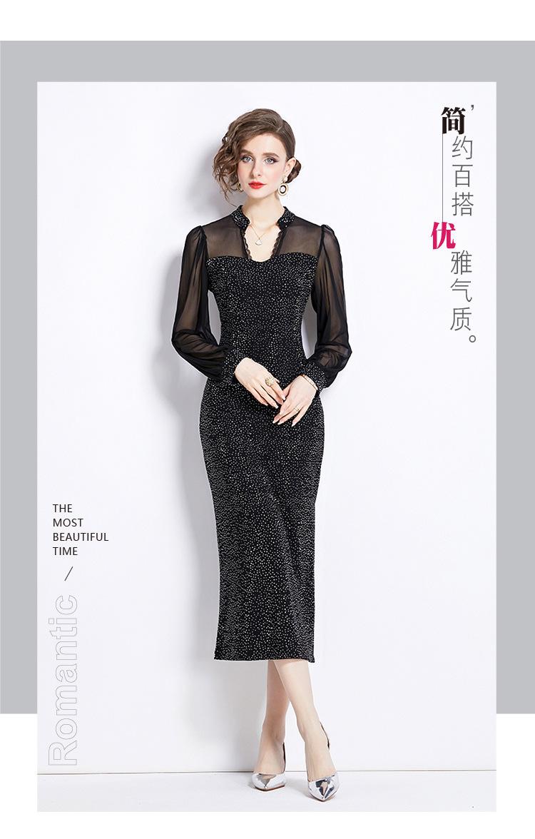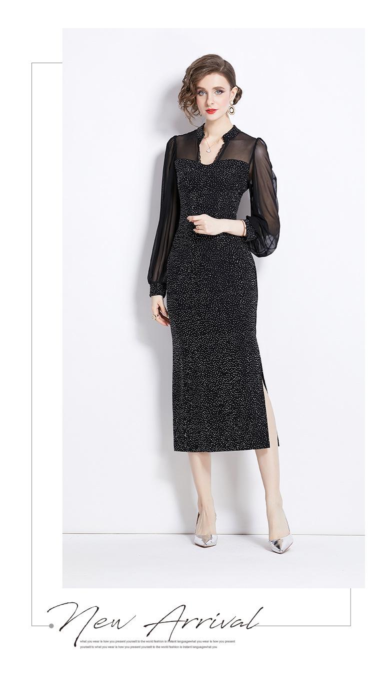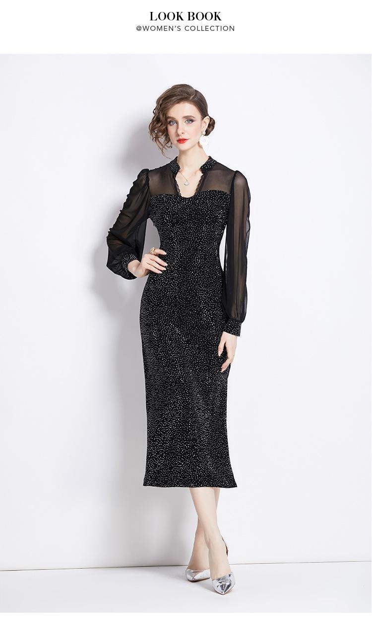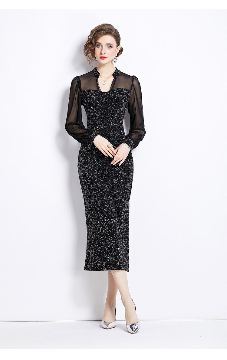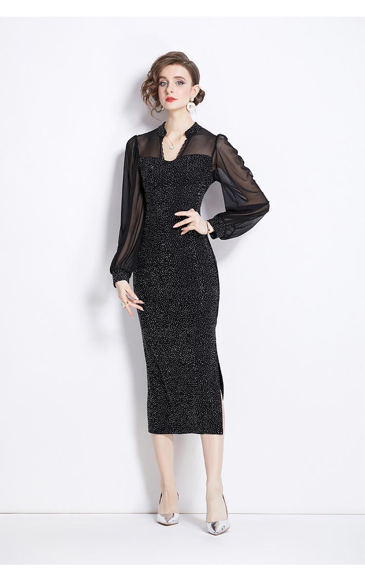 Vestido Falda Estilo Socialité Cuello V Manga Larga Diamante Caliente Vestido Negro Mujer Primavera y Verano 2024 Nuevo Estilo
