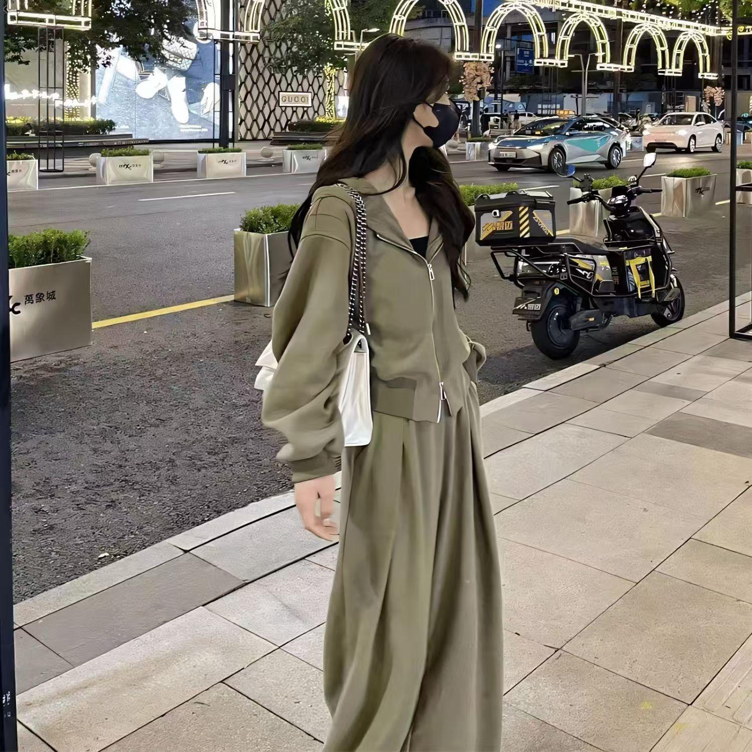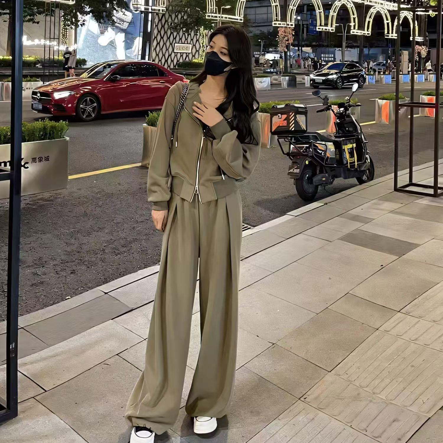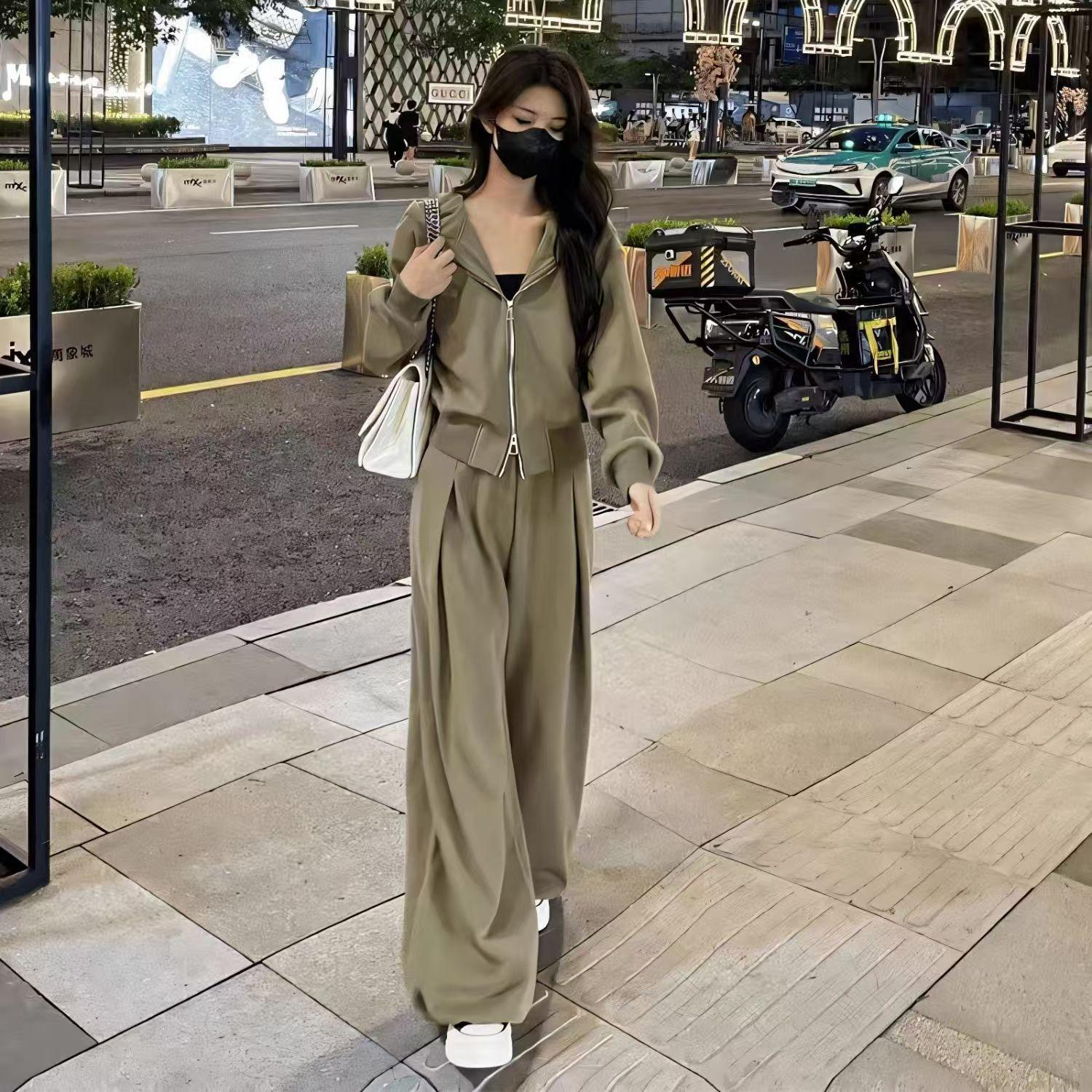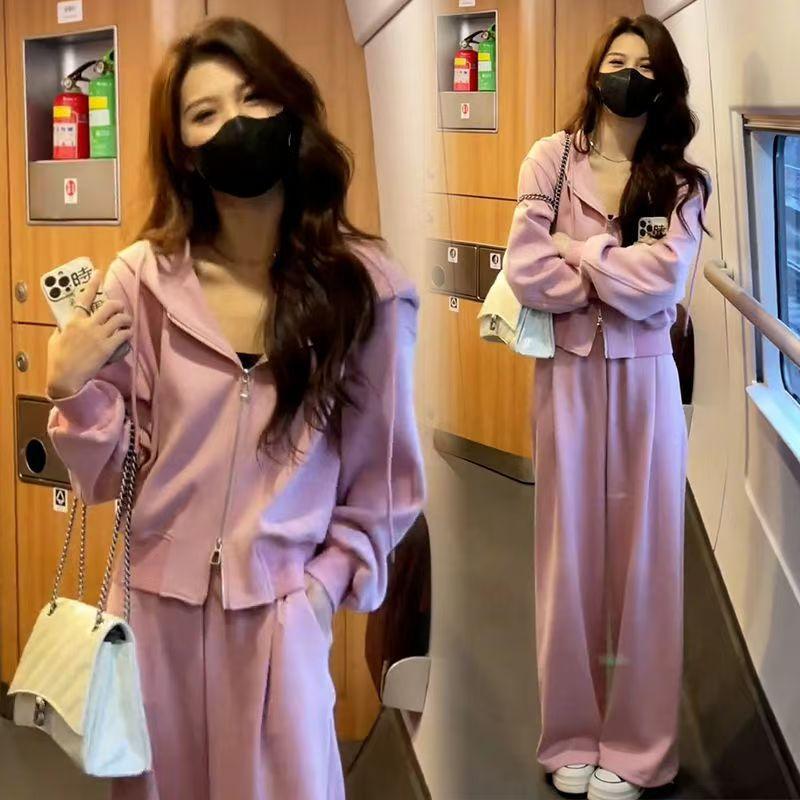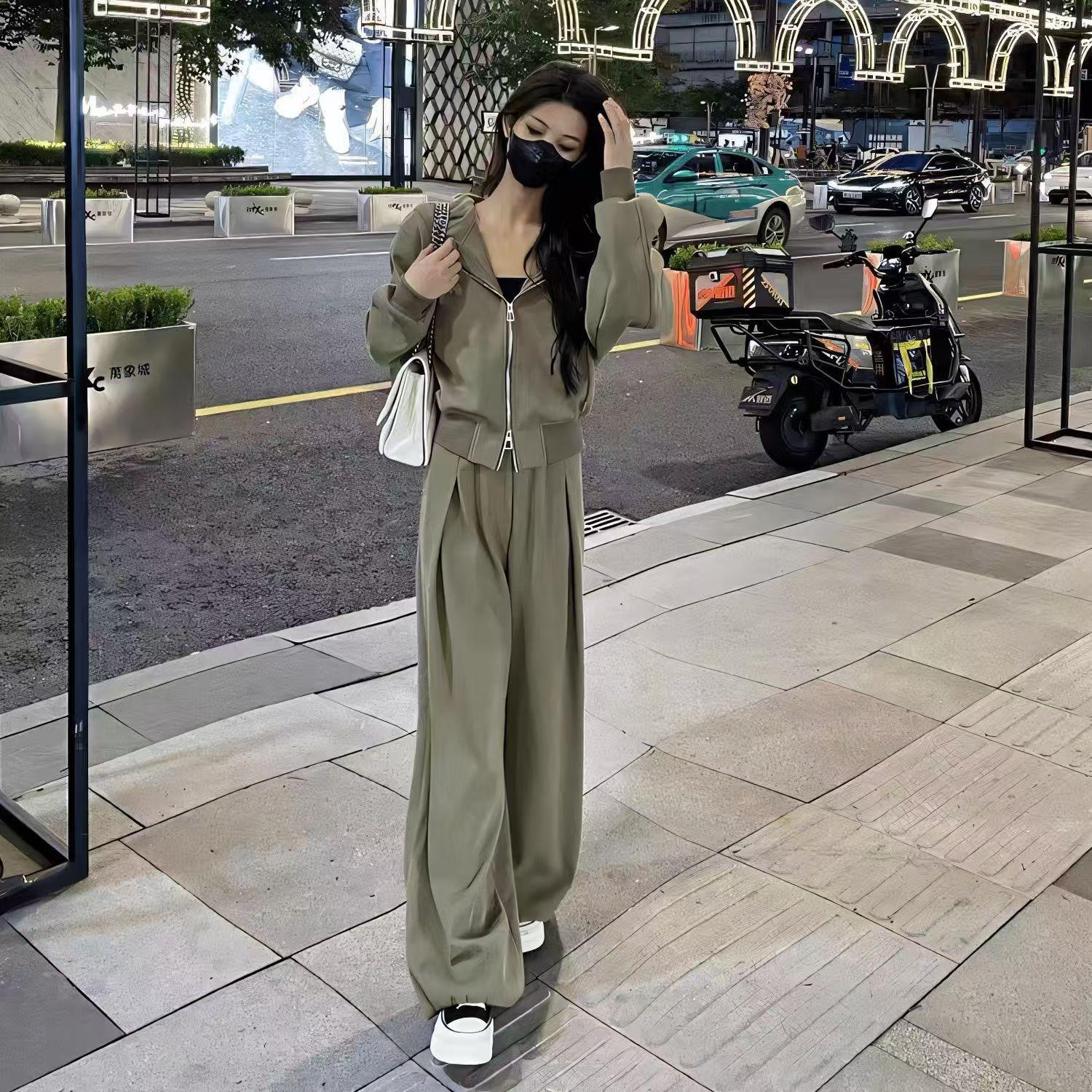 2024 Primavera y Otoño Nuevo Traje Deportivo Casual con Capucha de Celebridad de Internet para Mujer, Pantalones Slim de Cintura Alta y Pierna Ancha, Traje de Dos Piezas