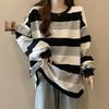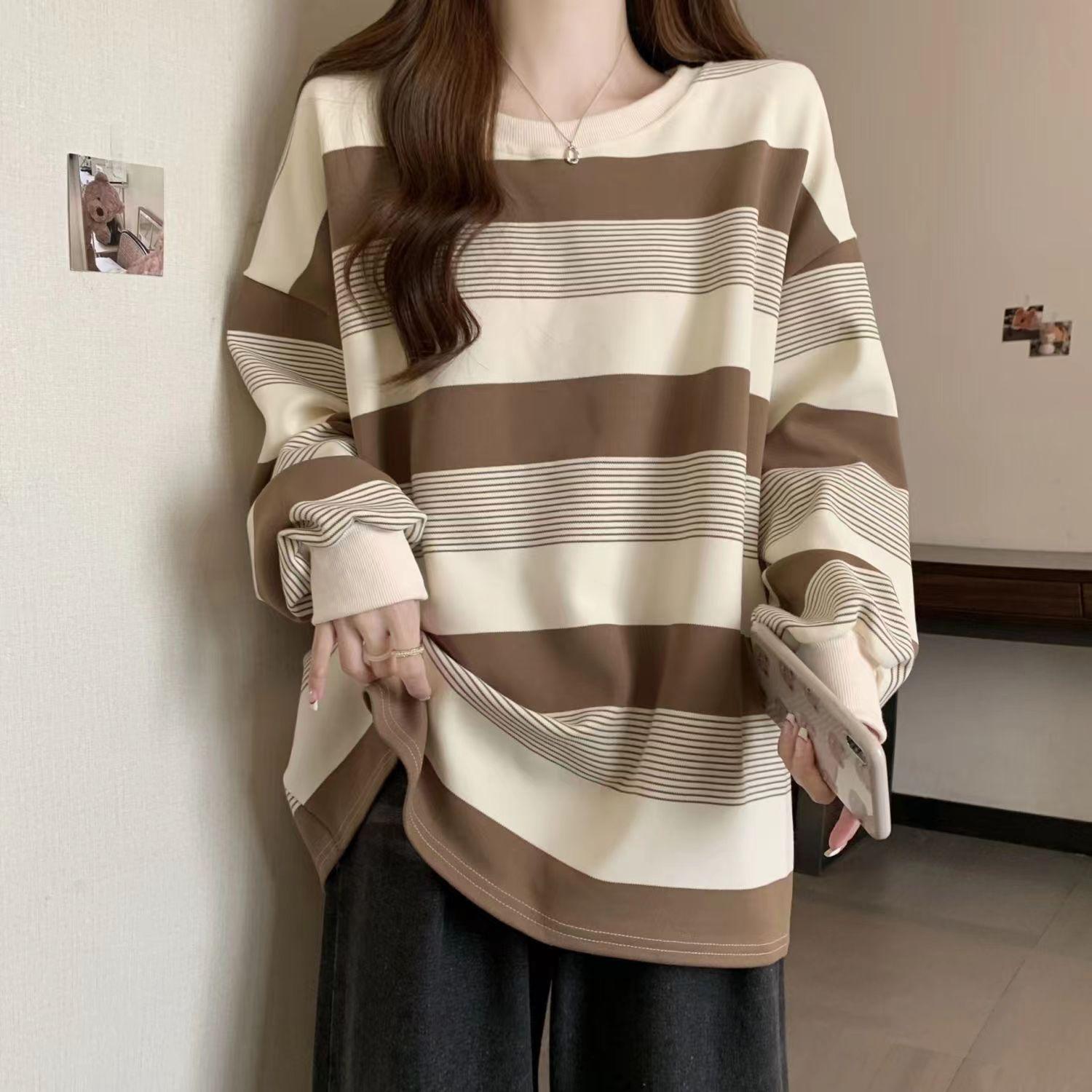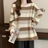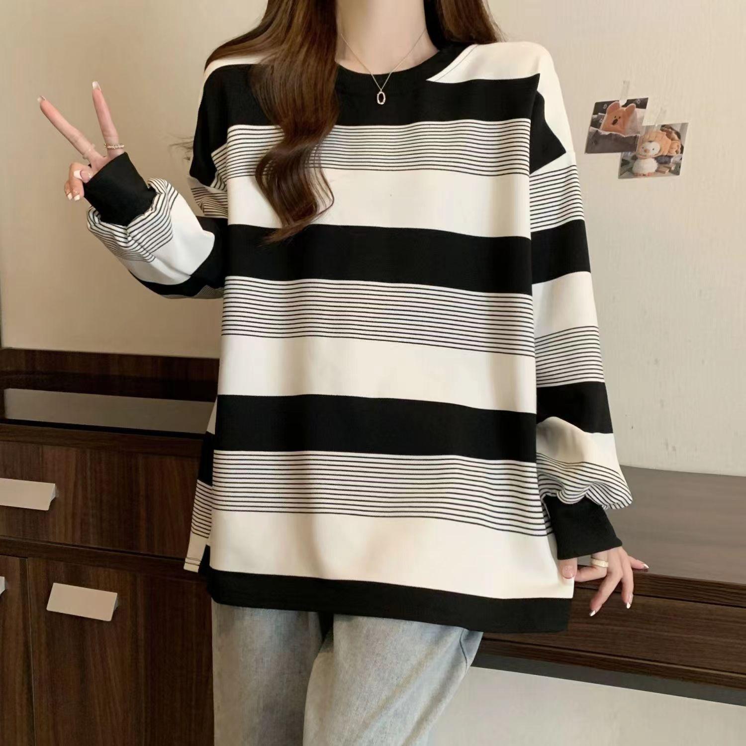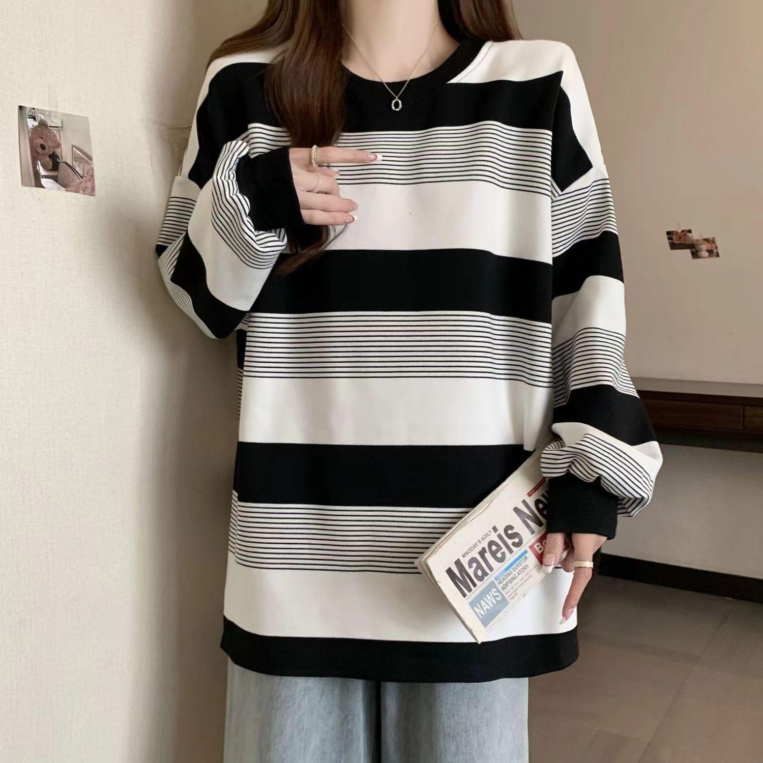 Otoño 2024 Foto Real talla grande chica gordita Coreano Suelto Simple Joker Rayado Cuello Redondo Suéter Camiseta Top Moda Mujer