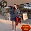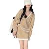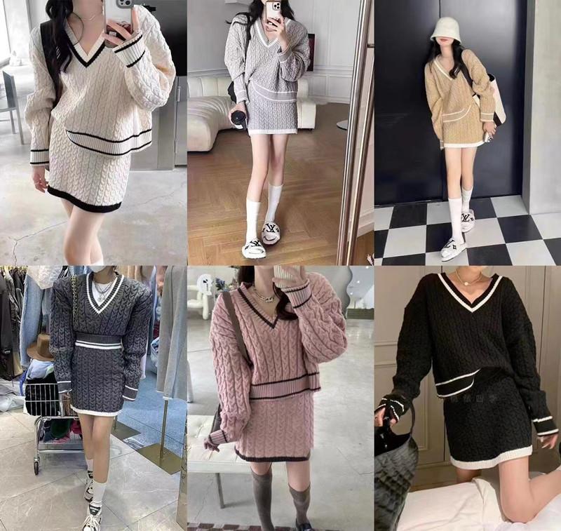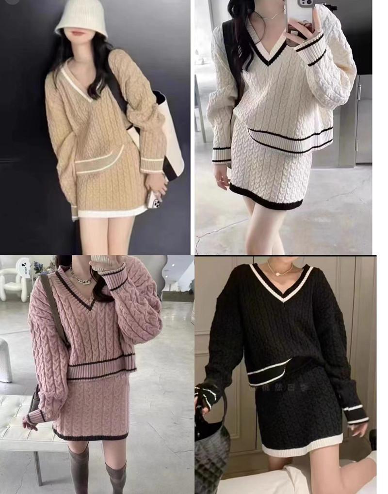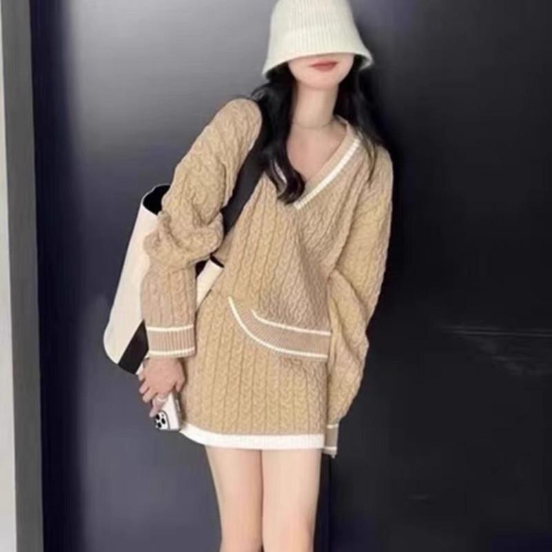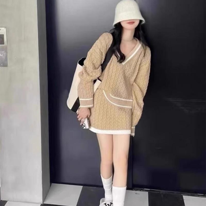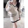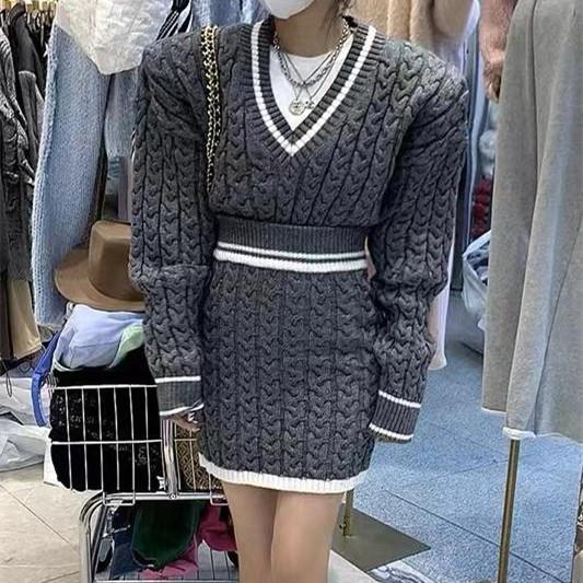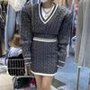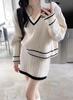 Conjunto de dos piezas de suéter con estampado de cáñamo, cintura alta, falda de punto y contraste de color, estilo vintage, con cuello en V, holgado y viento, para otoño e invierno