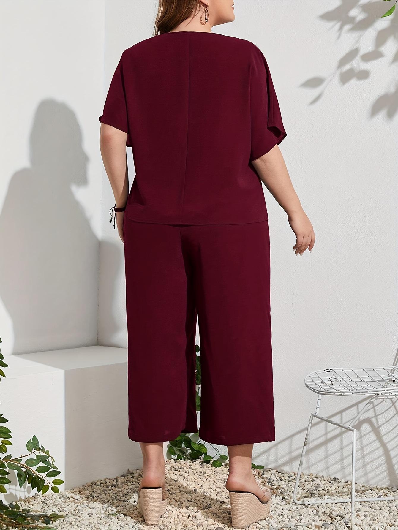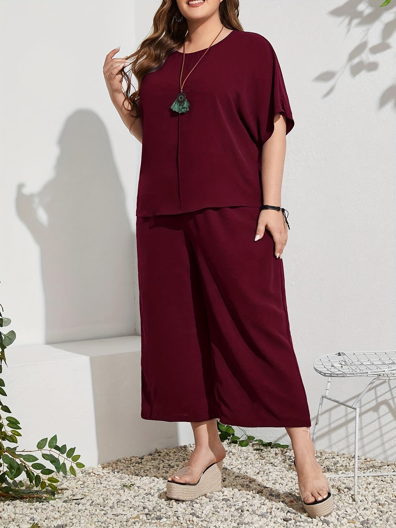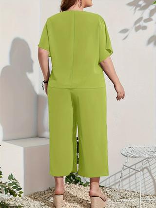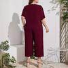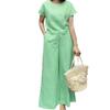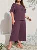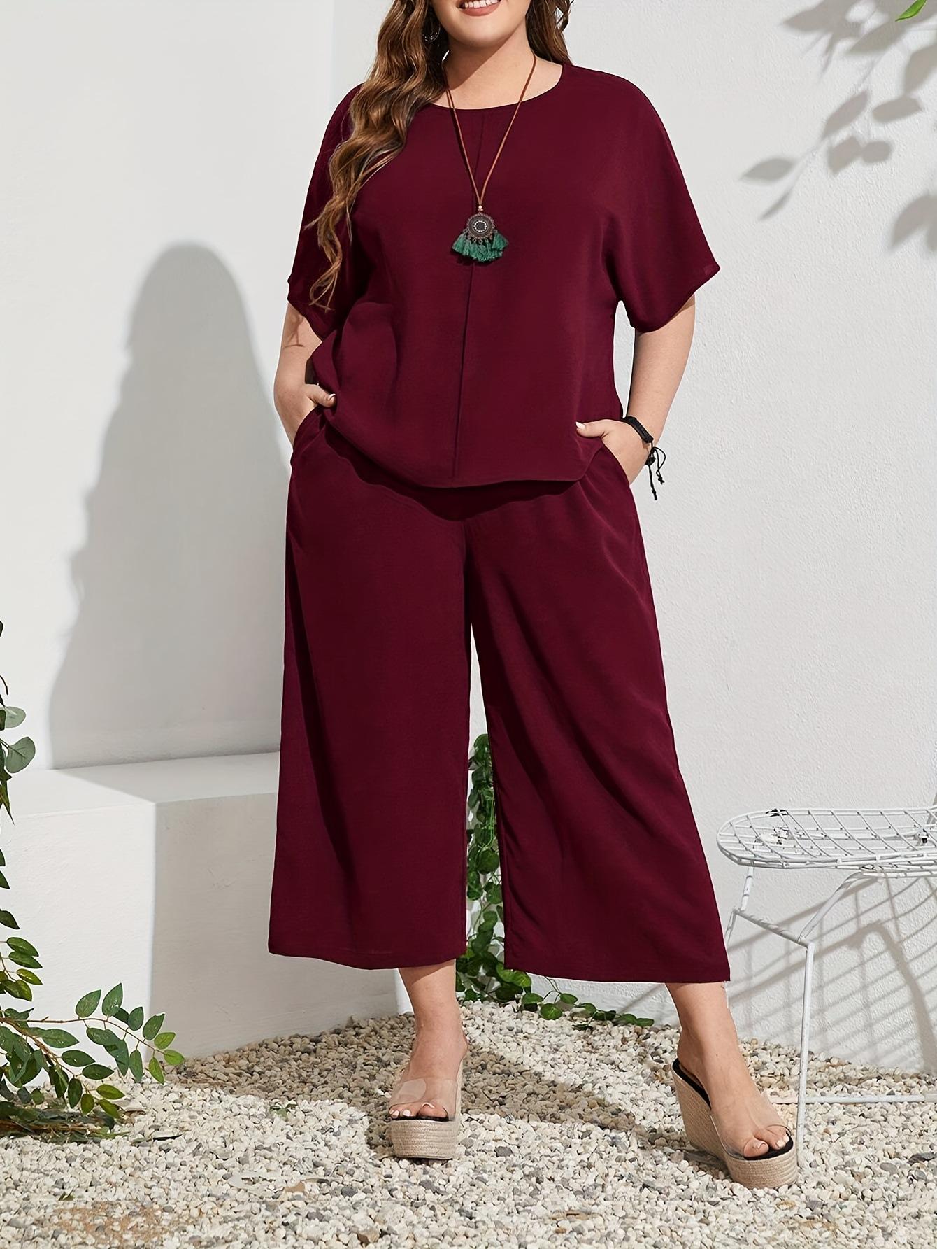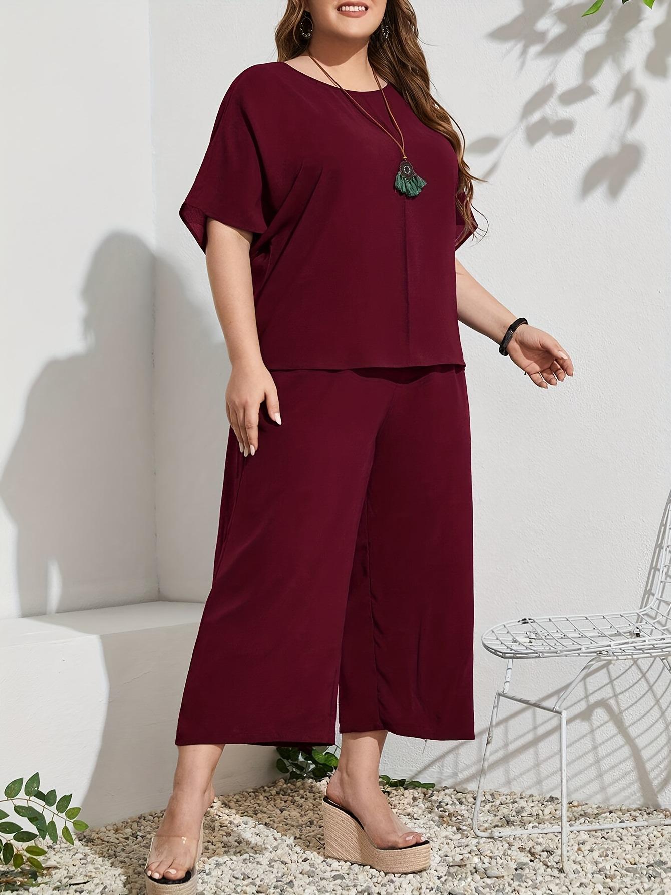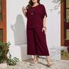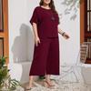 Moda Femenina Transfronteriza Europea y Americana Verano Popular Talla Grande Color Puro Cuello Redondo Top Pantalones de Pierna Ancha Conjunto Casual de Dos Piezas
