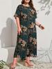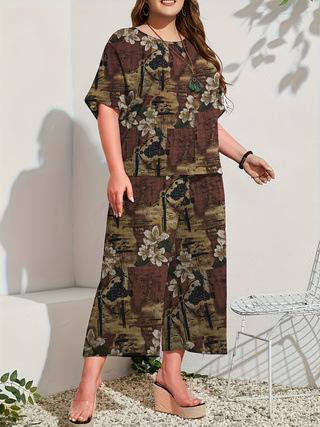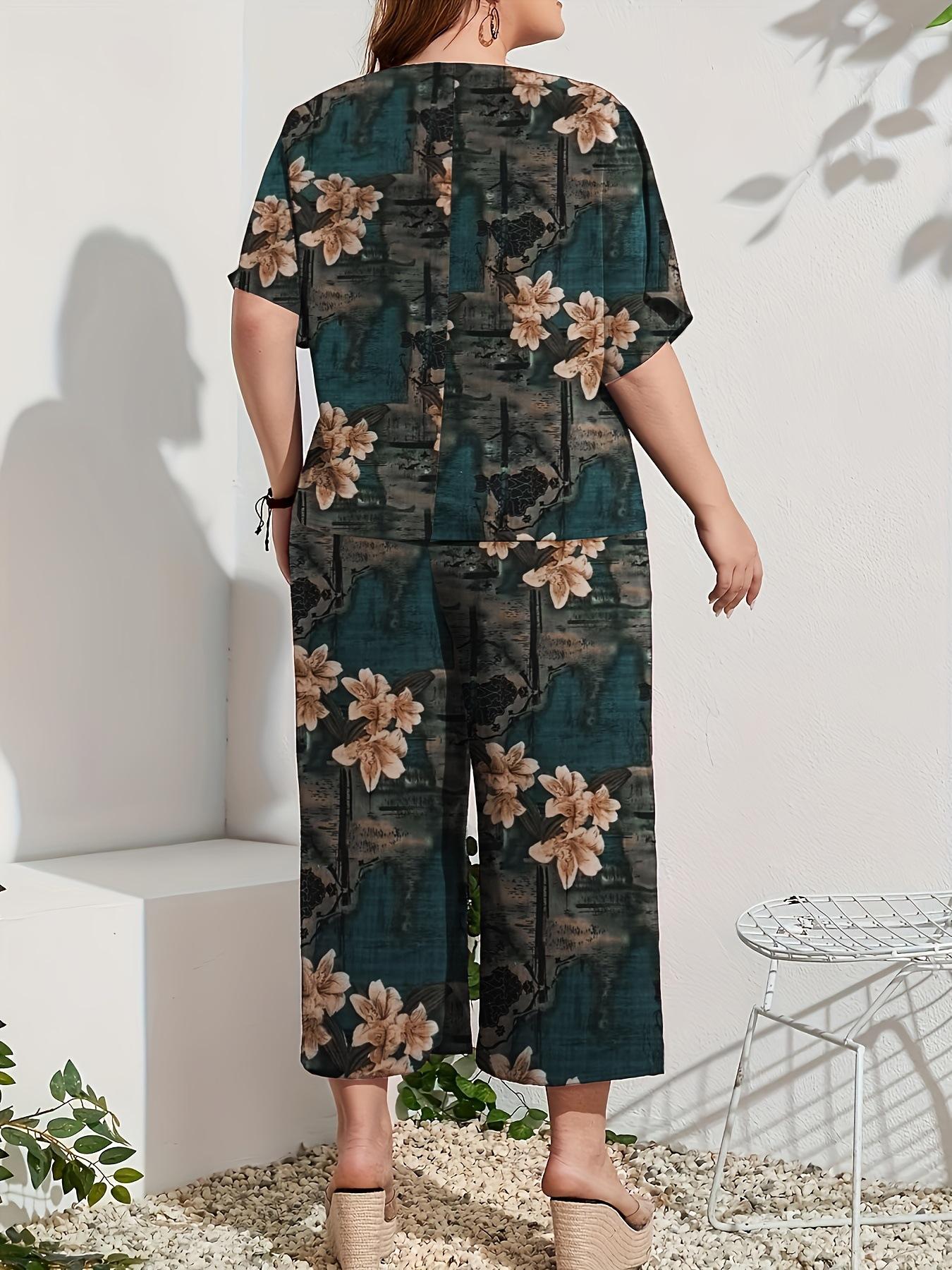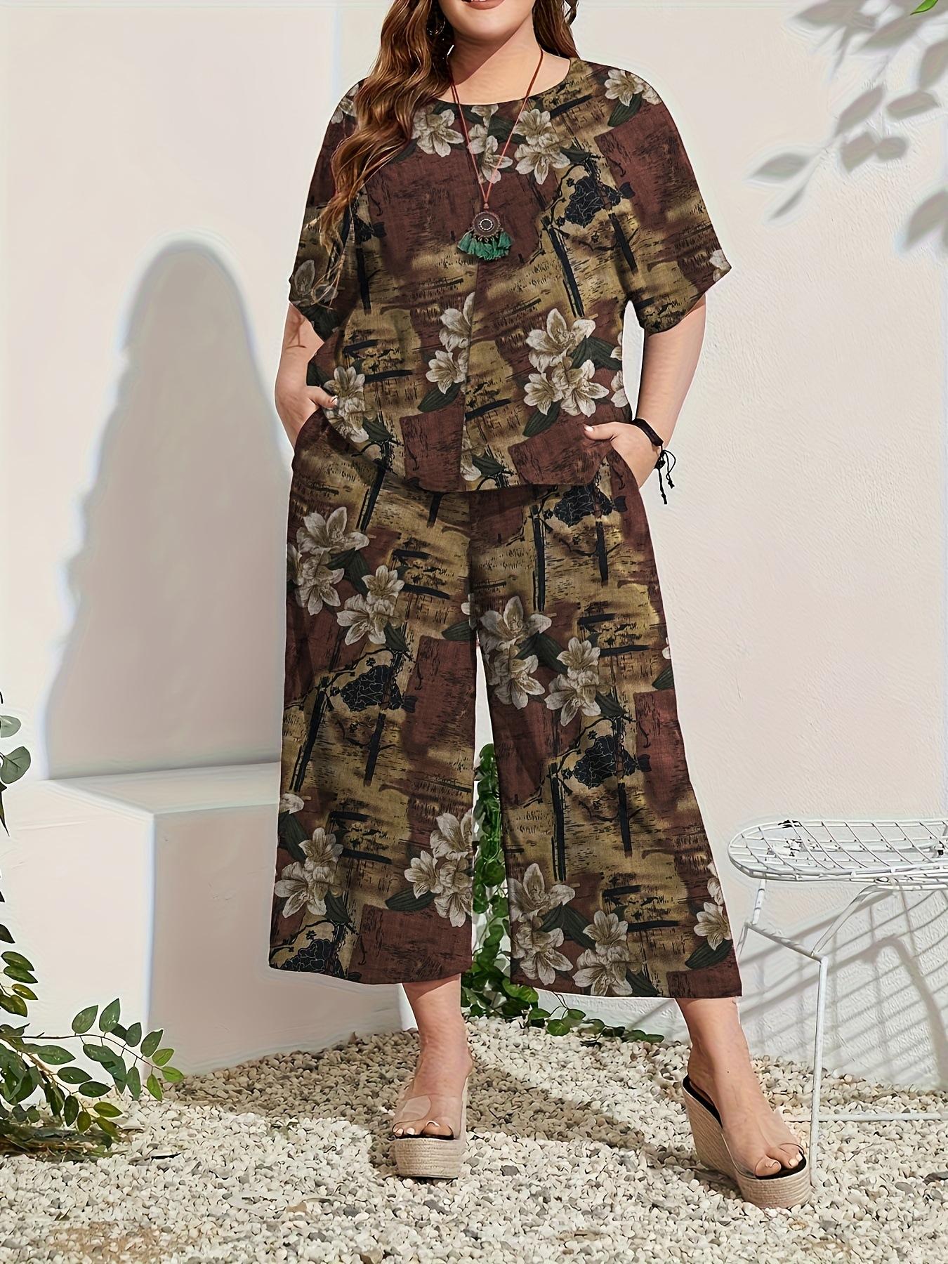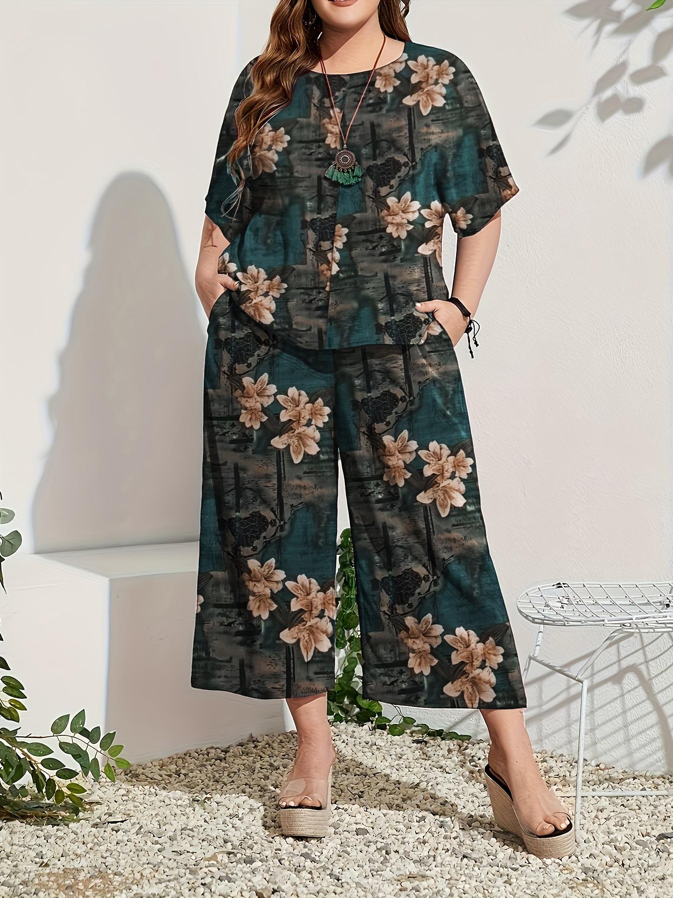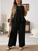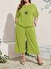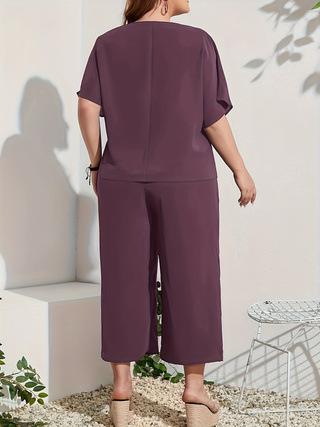 Moda Femenina Transfronteriza Europea y Americana Verano Popular Talla Grande Color Puro Cuello Redondo Top Pantalones de Pierna Ancha Conjunto Casual de Dos Piezas