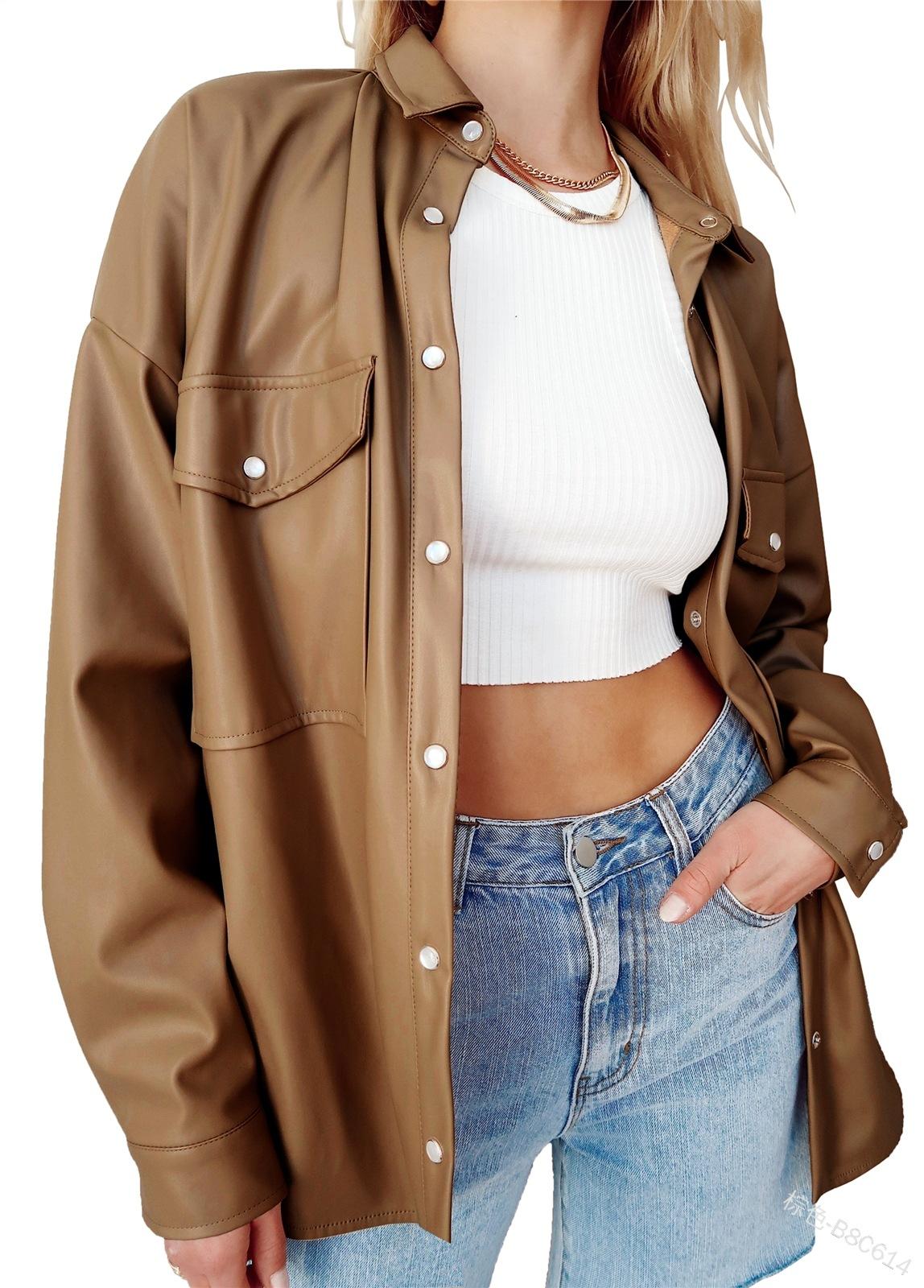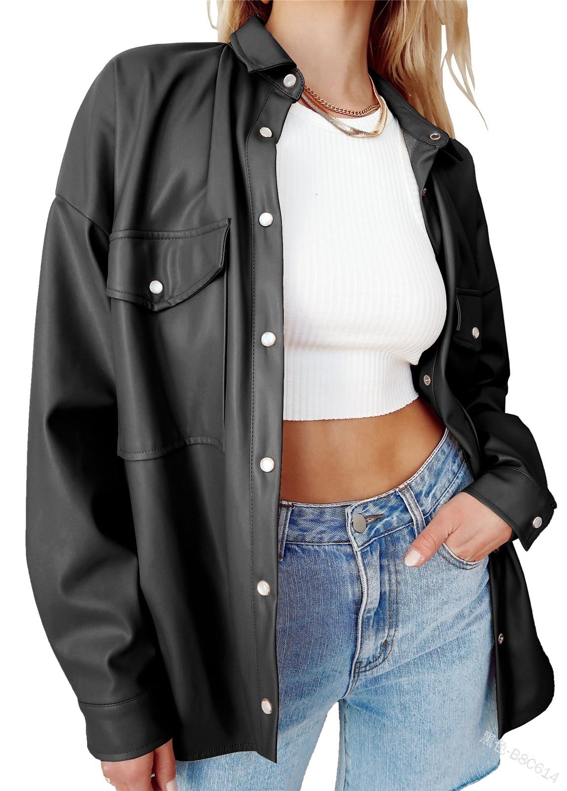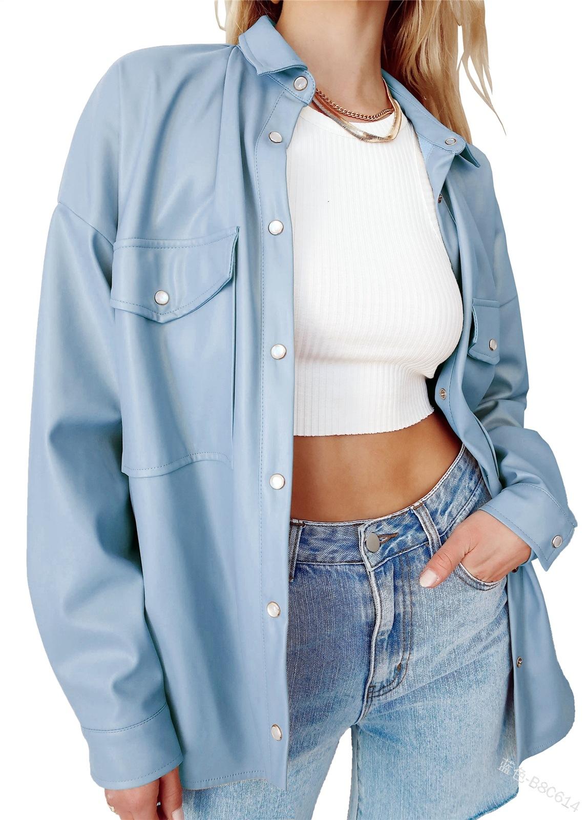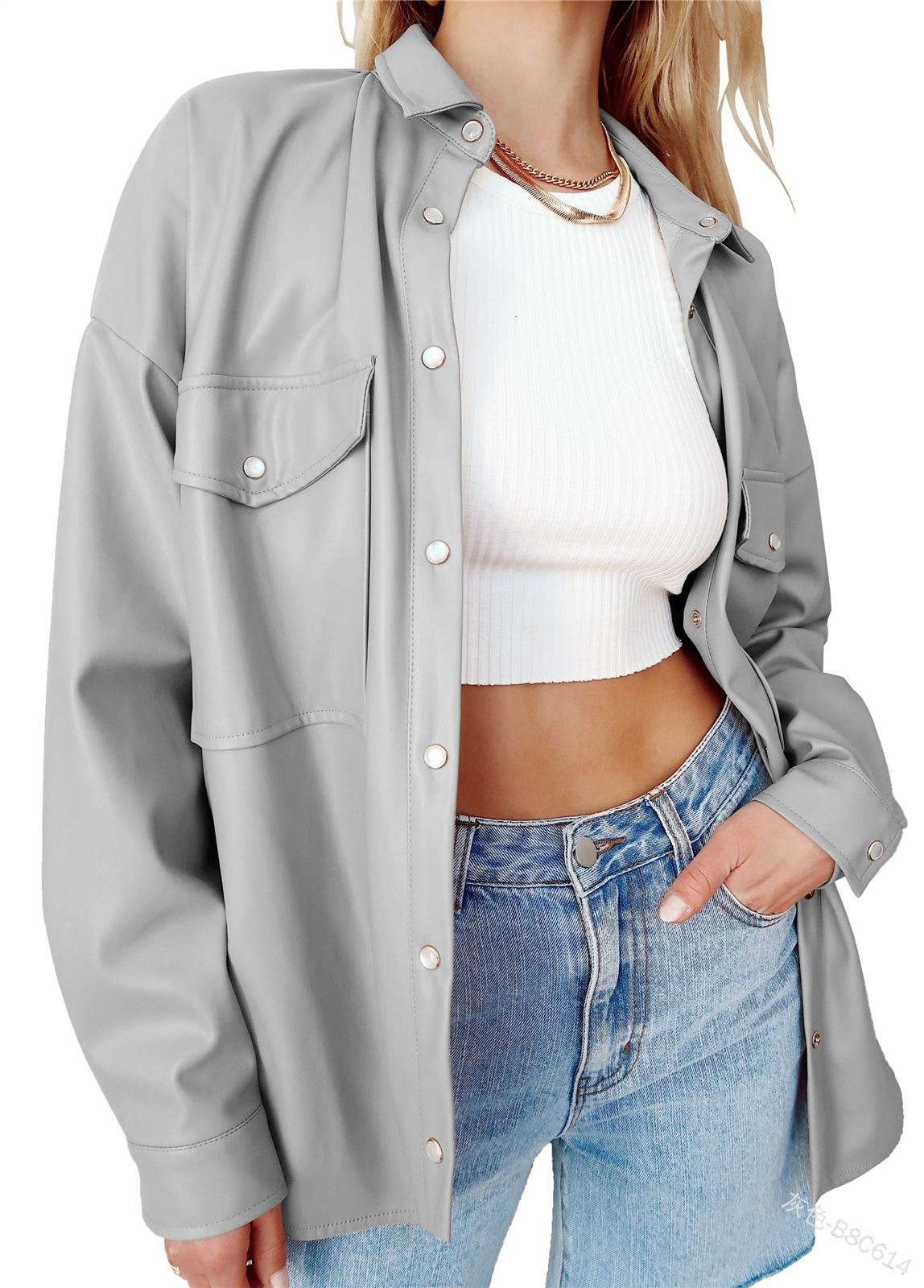 Camisa de solapa de color sólido de Amazon transfronteriza, chaqueta de PU para mujer, nueva moda casual, tops de un solo botón para mujer, peso: 415-505 gramos