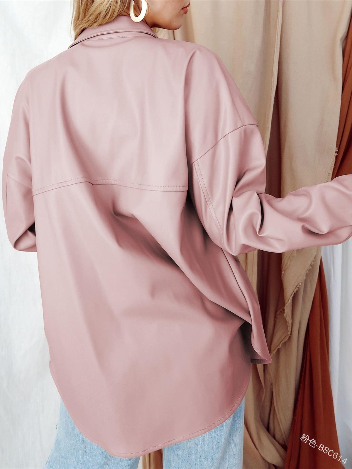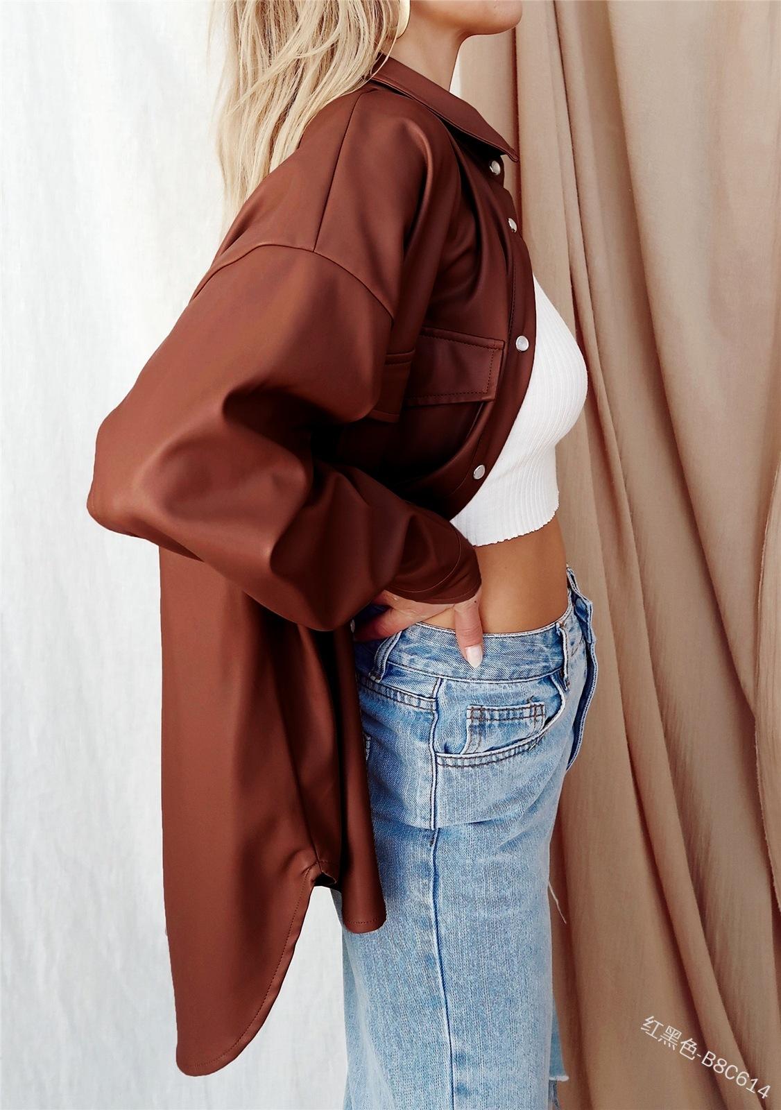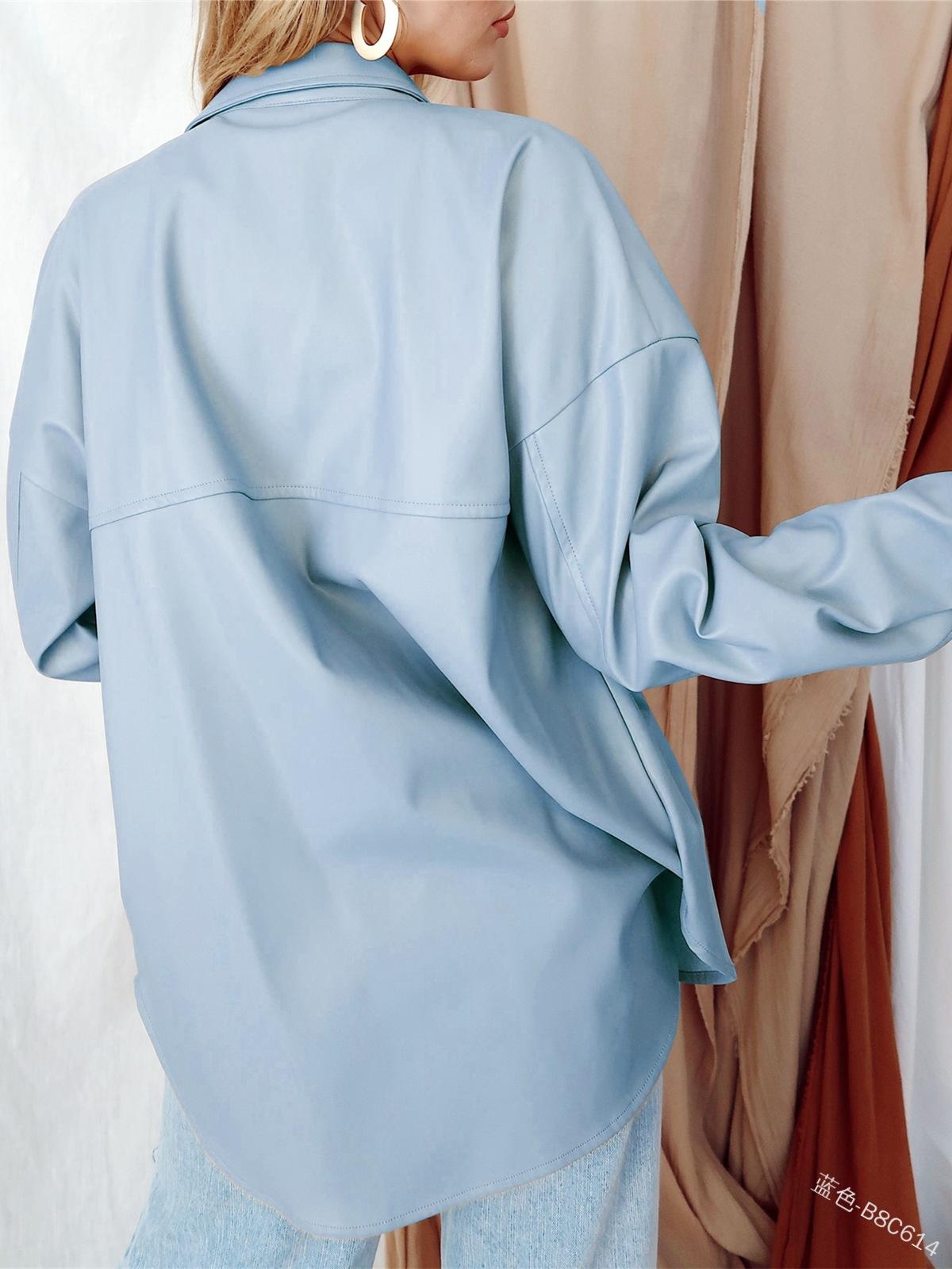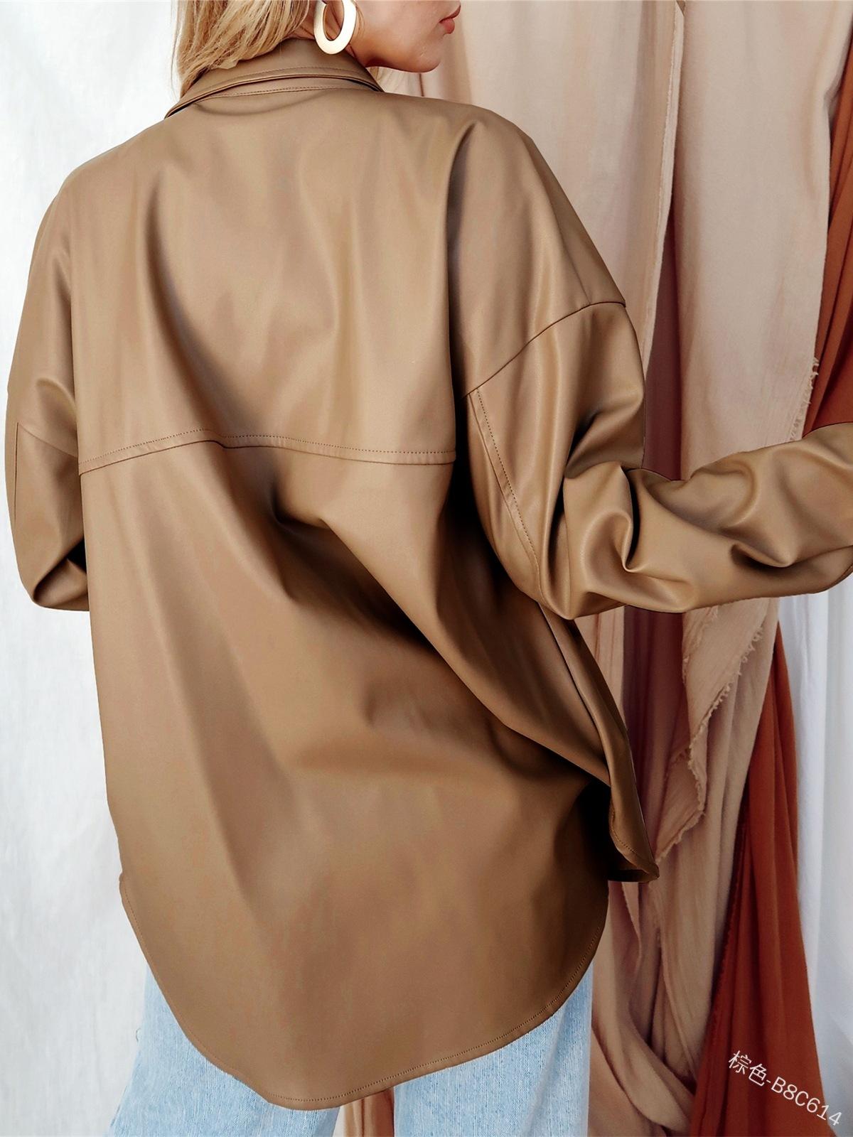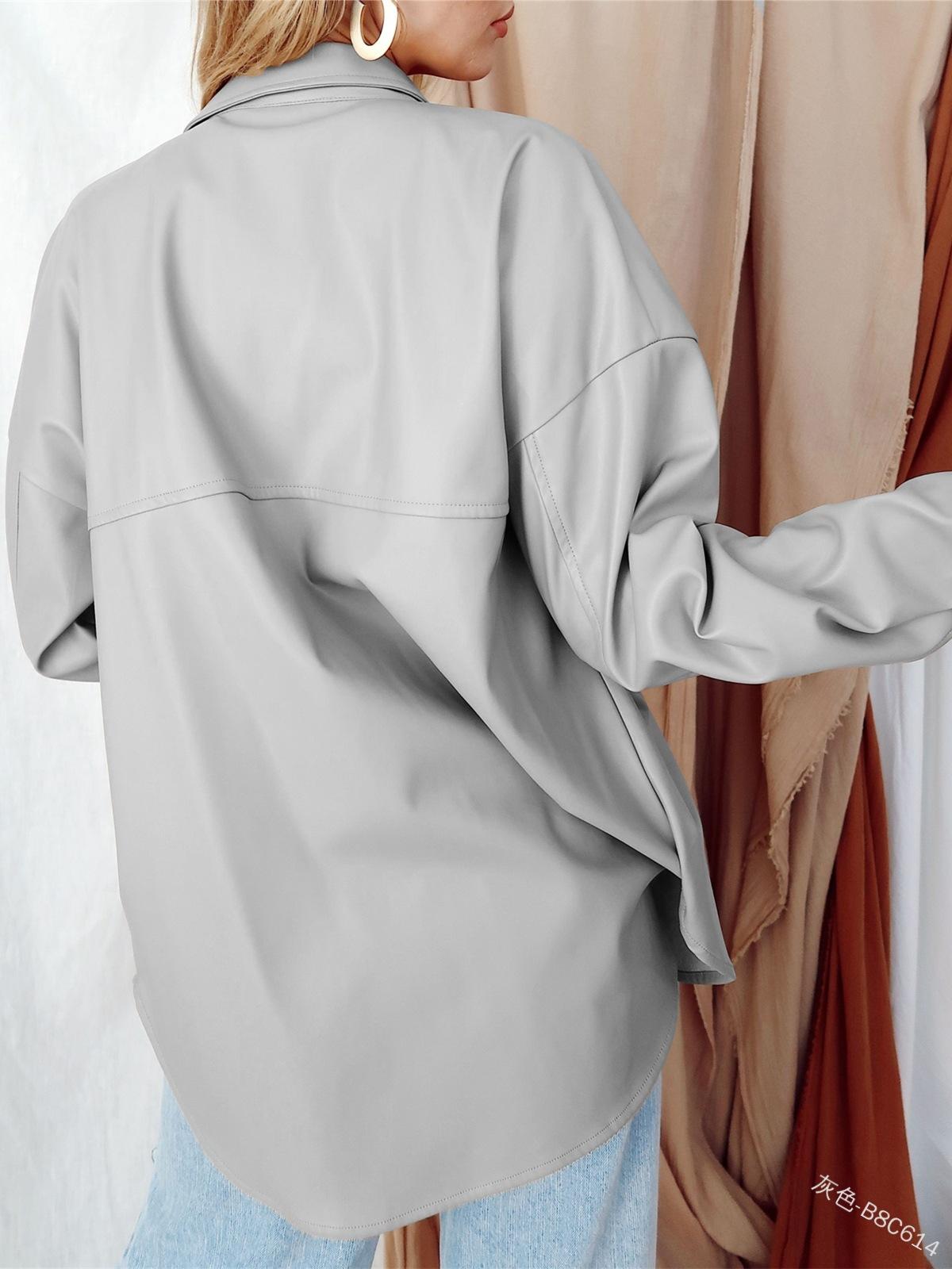 Camisa de solapa de color sólido de Amazon transfronteriza, chaqueta de PU para mujer, nueva moda casual, tops de un solo botón para mujer, peso: 415-505 gramos