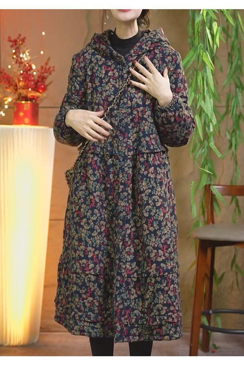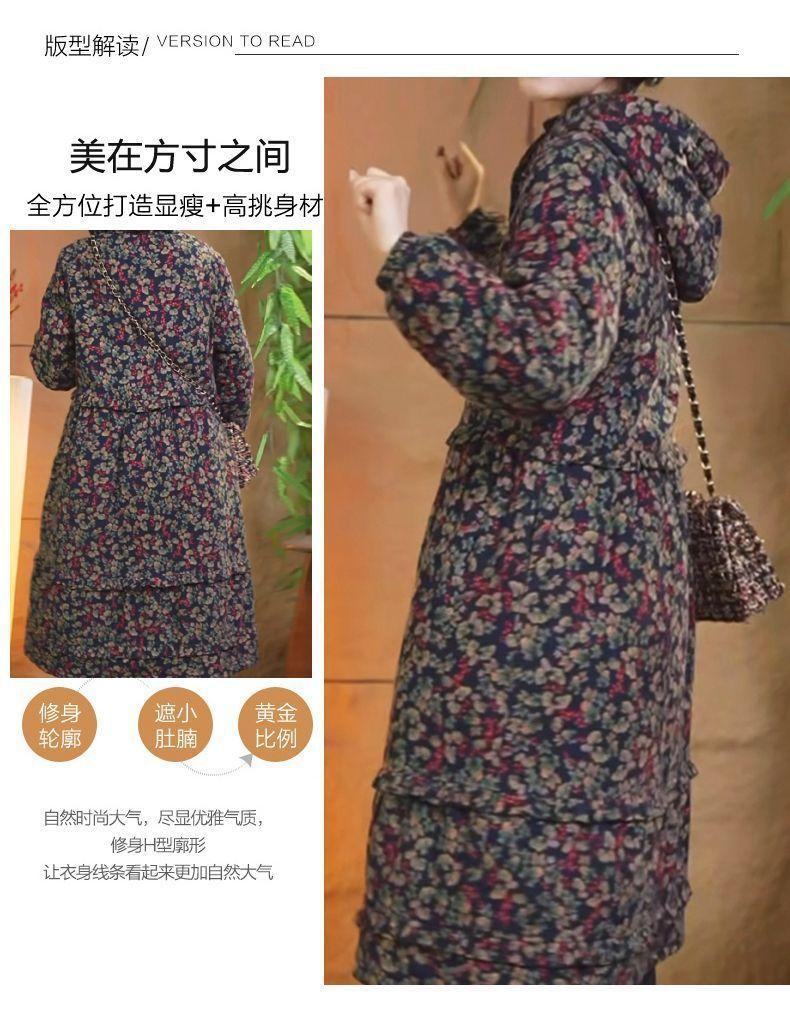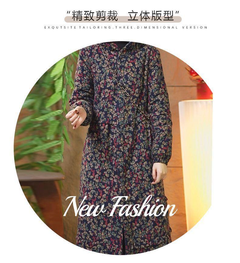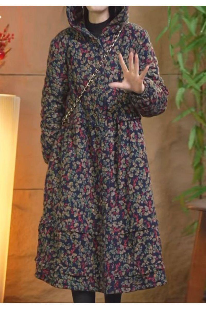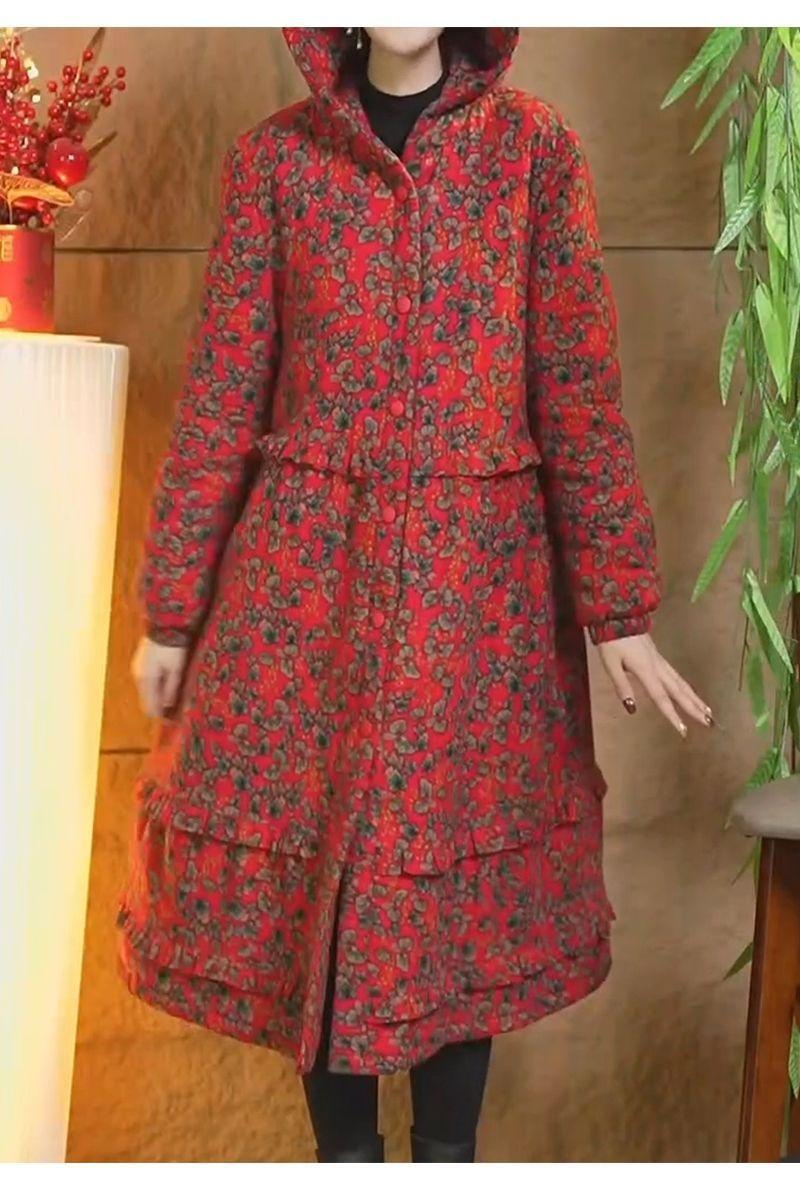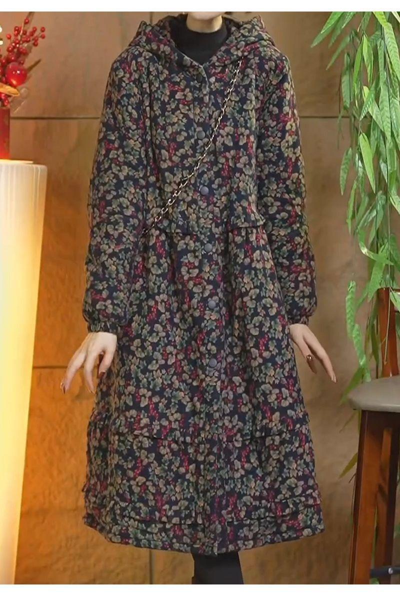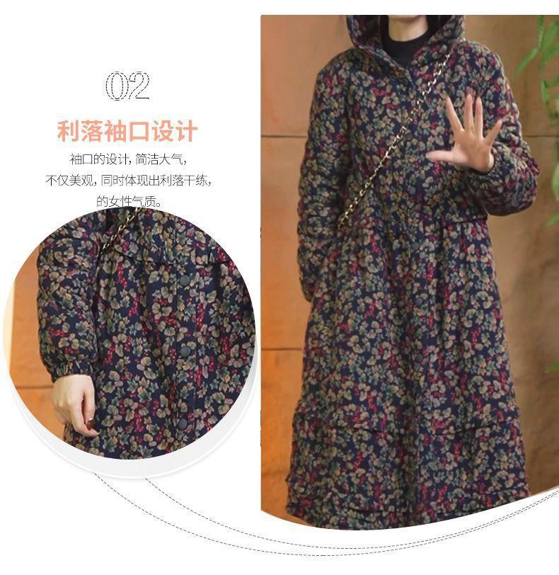 Abrigo acolchado de algodón cálido con capucha y estampado floral de alta gama para mujer 2023 Invierno adelgazante de longitud media para mamás