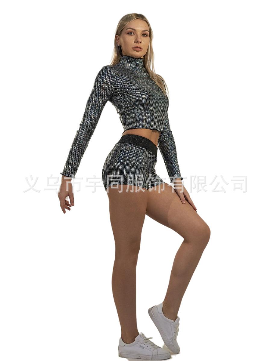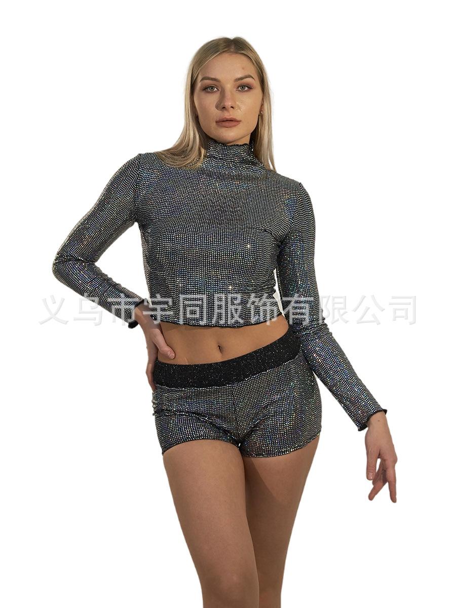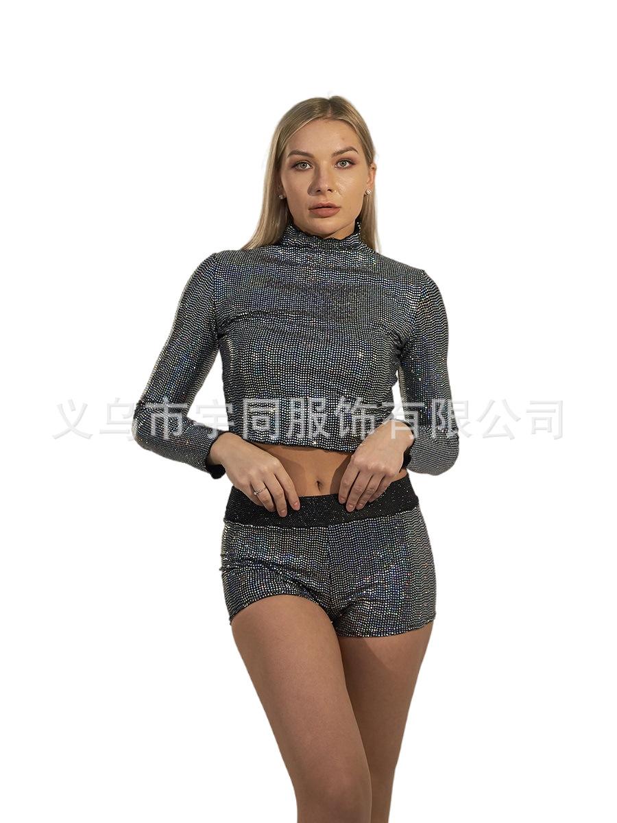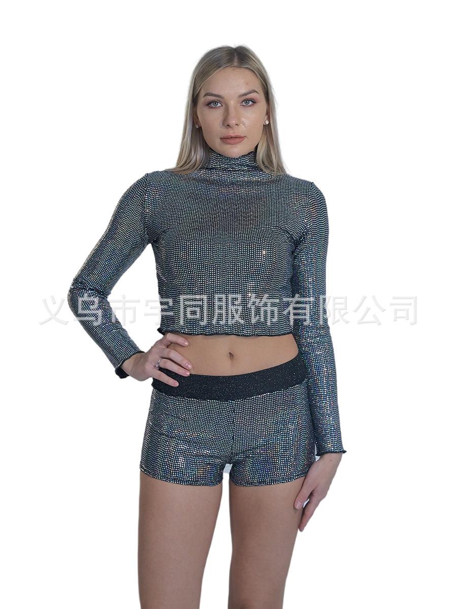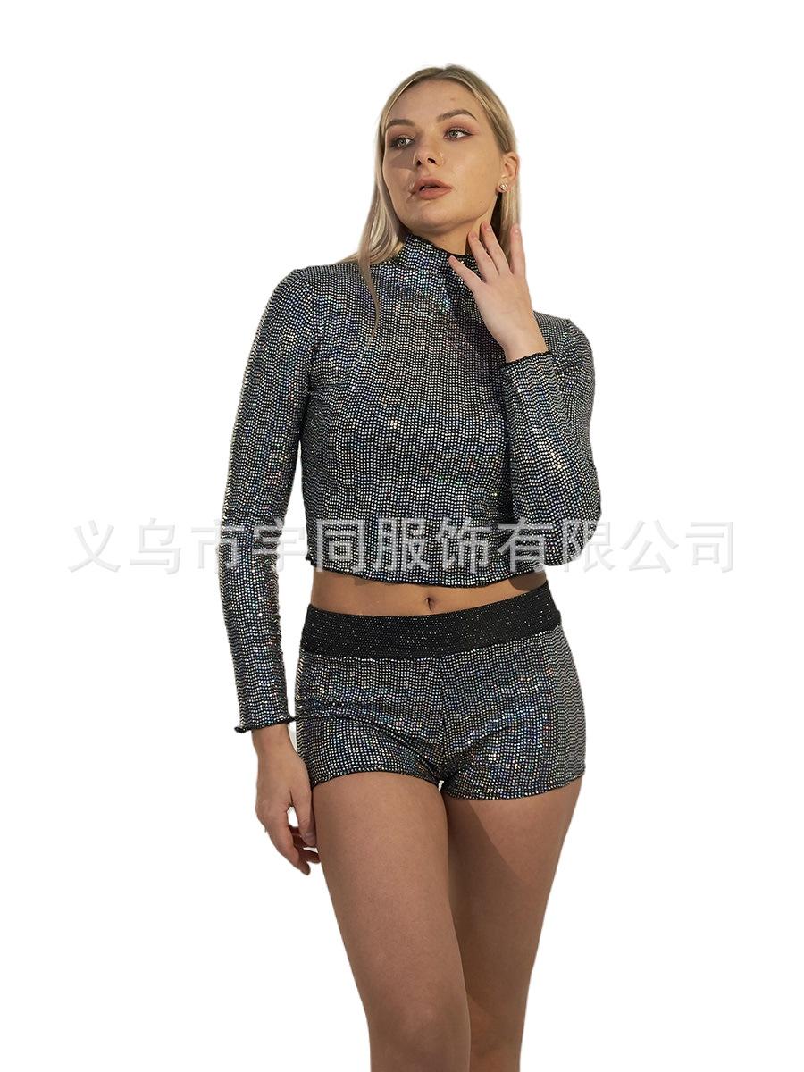 Camisa de manga larga con cuello alto para mujer, de moda de comercio exterior, con lentejuelas, para escenario, con incrustaciones de diamantes, camiseta corta ajustada hasta el ombligo.