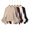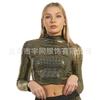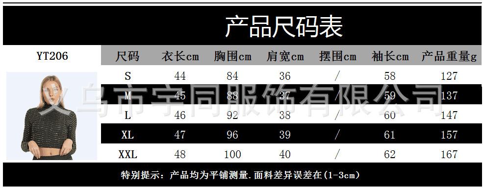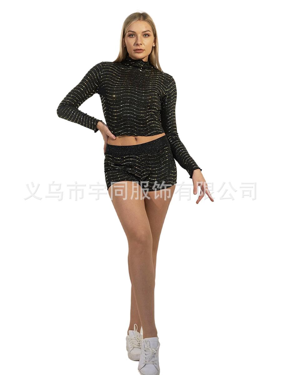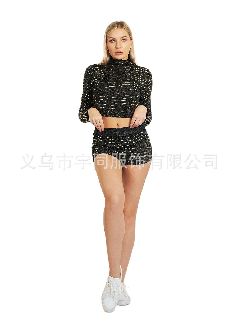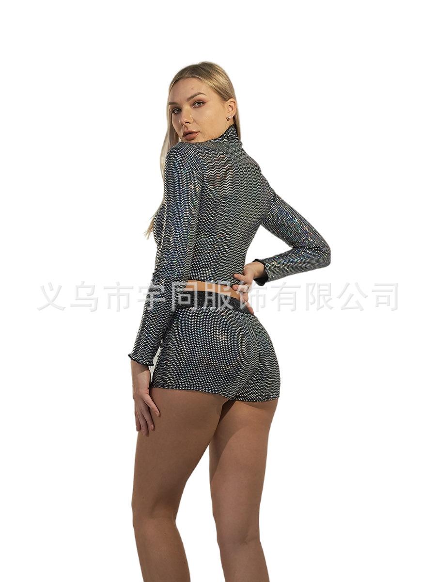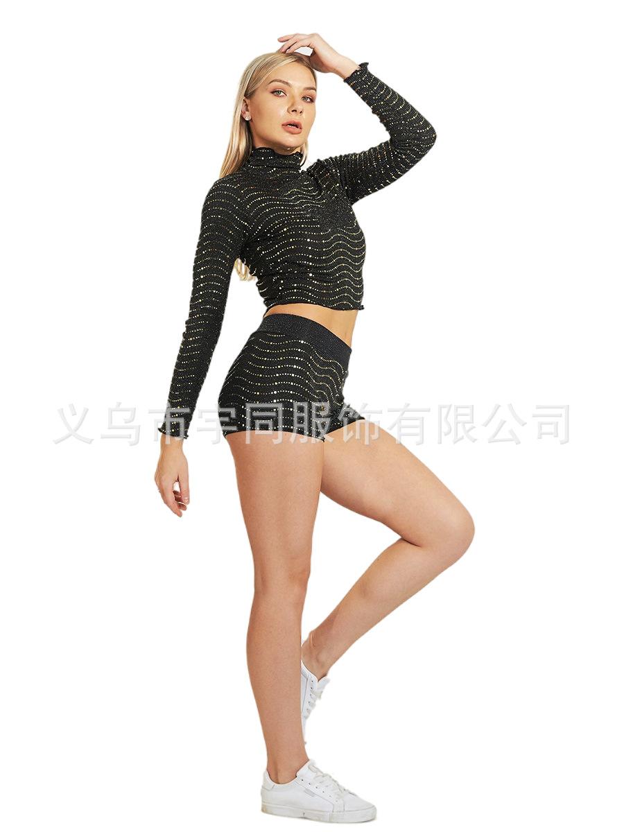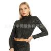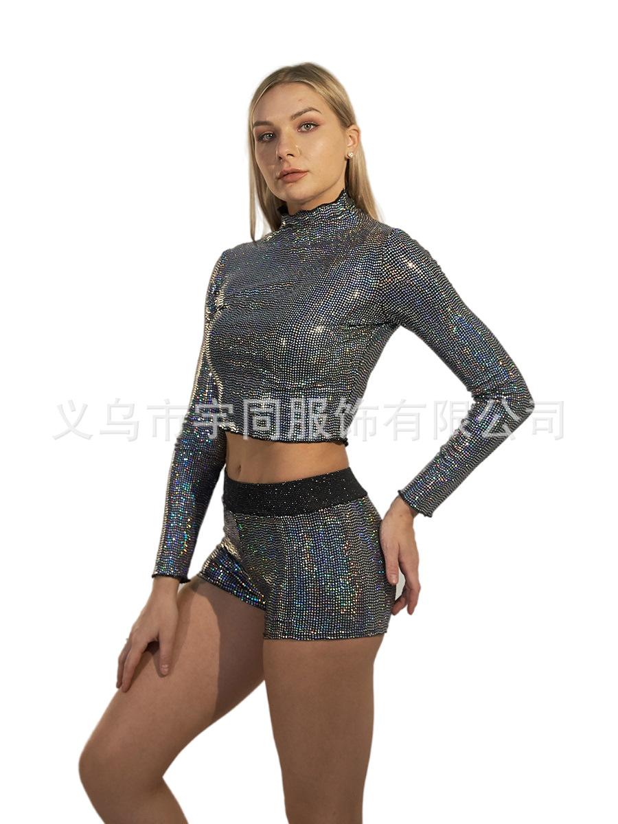 Camisa de manga larga con cuello alto para mujer, de moda de comercio exterior, con lentejuelas, para escenario, con incrustaciones de diamantes, camiseta corta ajustada hasta el ombligo.