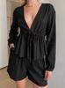 Traje de pantalón corto de manga larga de algodón y lino con cuello en V negro 2024 moda europea y americana otoño e invierno nueva venta al por mayor transfronteriza de dos piezas para mujer