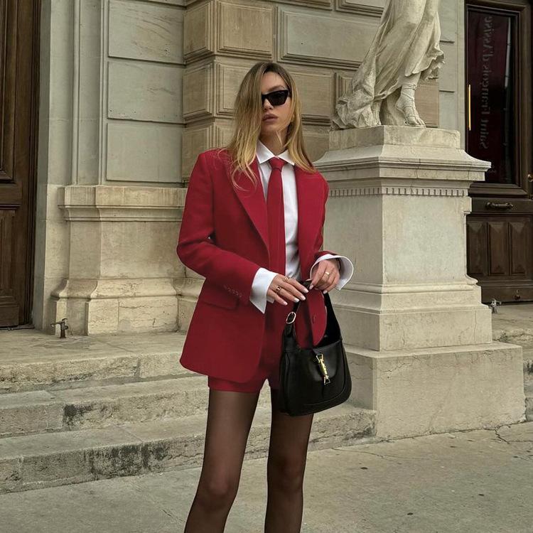 Transfronterizo Europa y Estados Unidos 2025 Primavera y Verano Nuevo Temperamento Ejecutivo Corbata Roja Traje Pequeño Traje Pantalones Cortos Chaqueta Conjunto de Dos Piezas