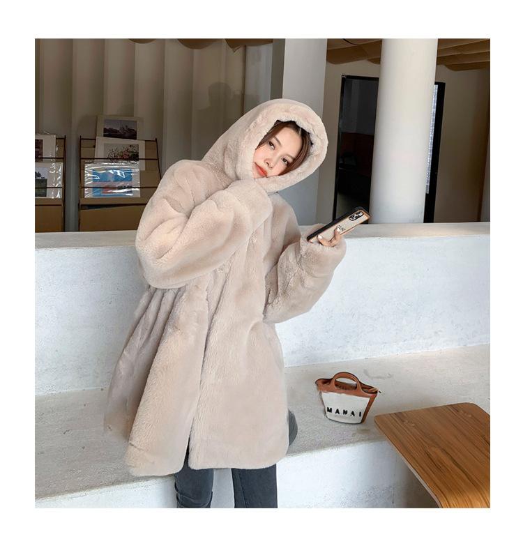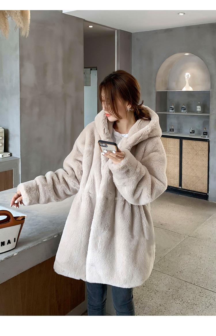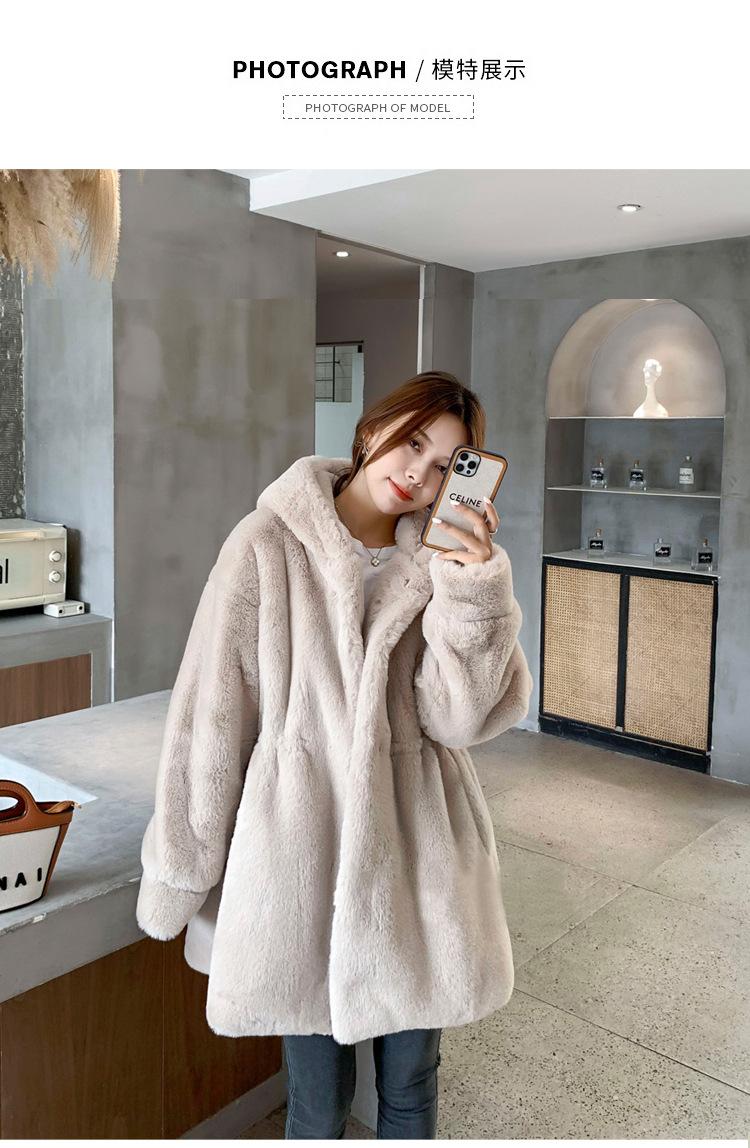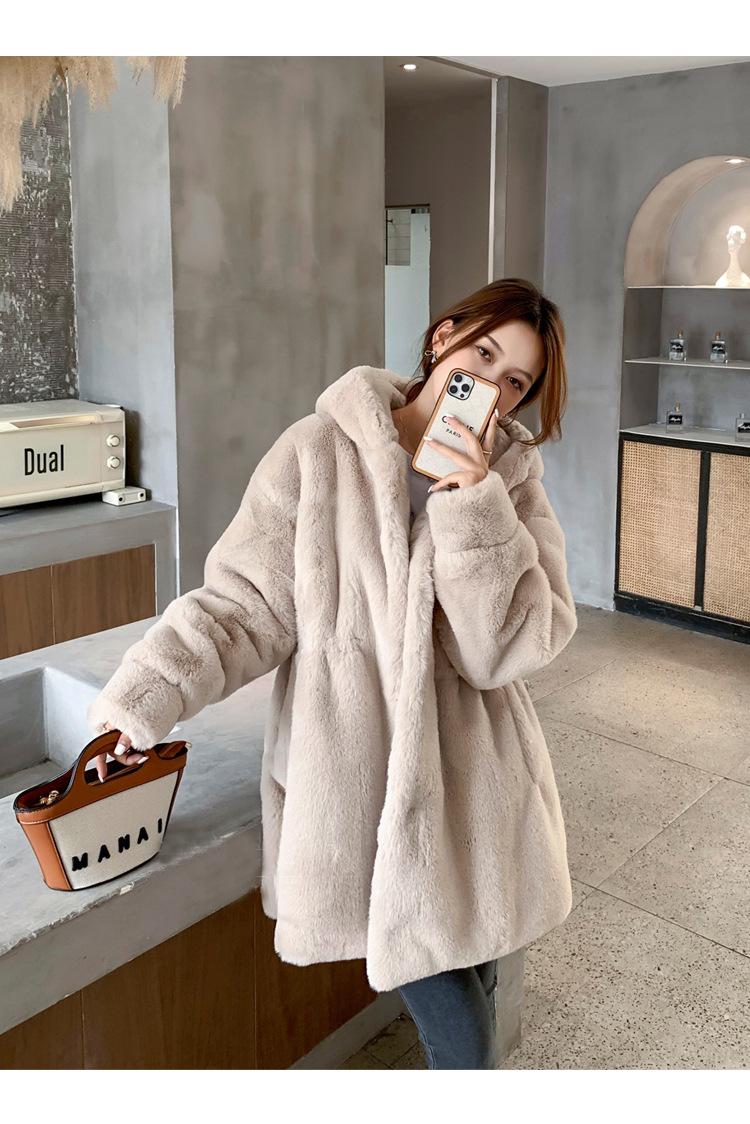 Abrigo de piel de conejo de cintura ajustada de invierno transfronterizo para mujer, gorro largo Dalian, abrigo grueso y cálido y esponjoso.