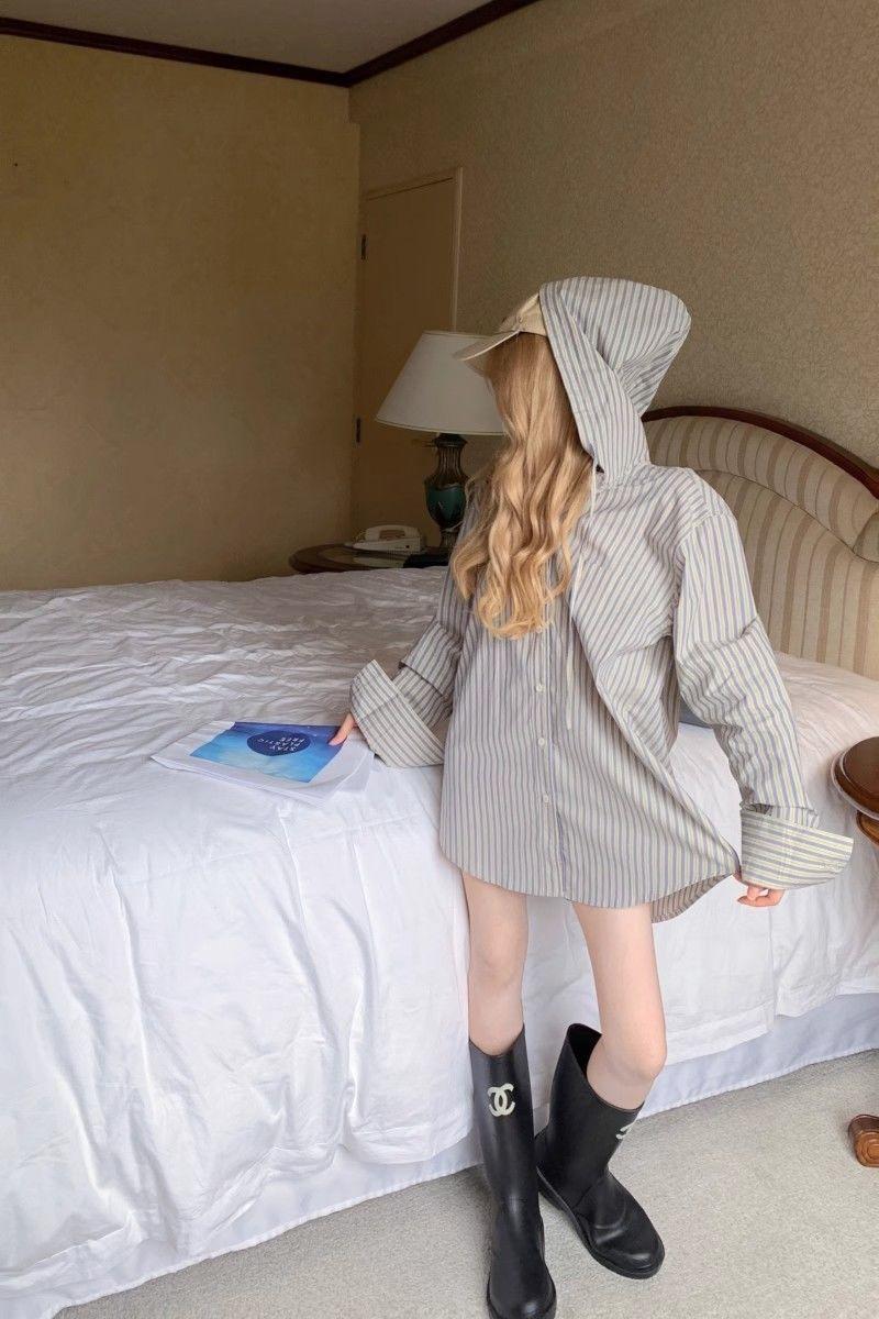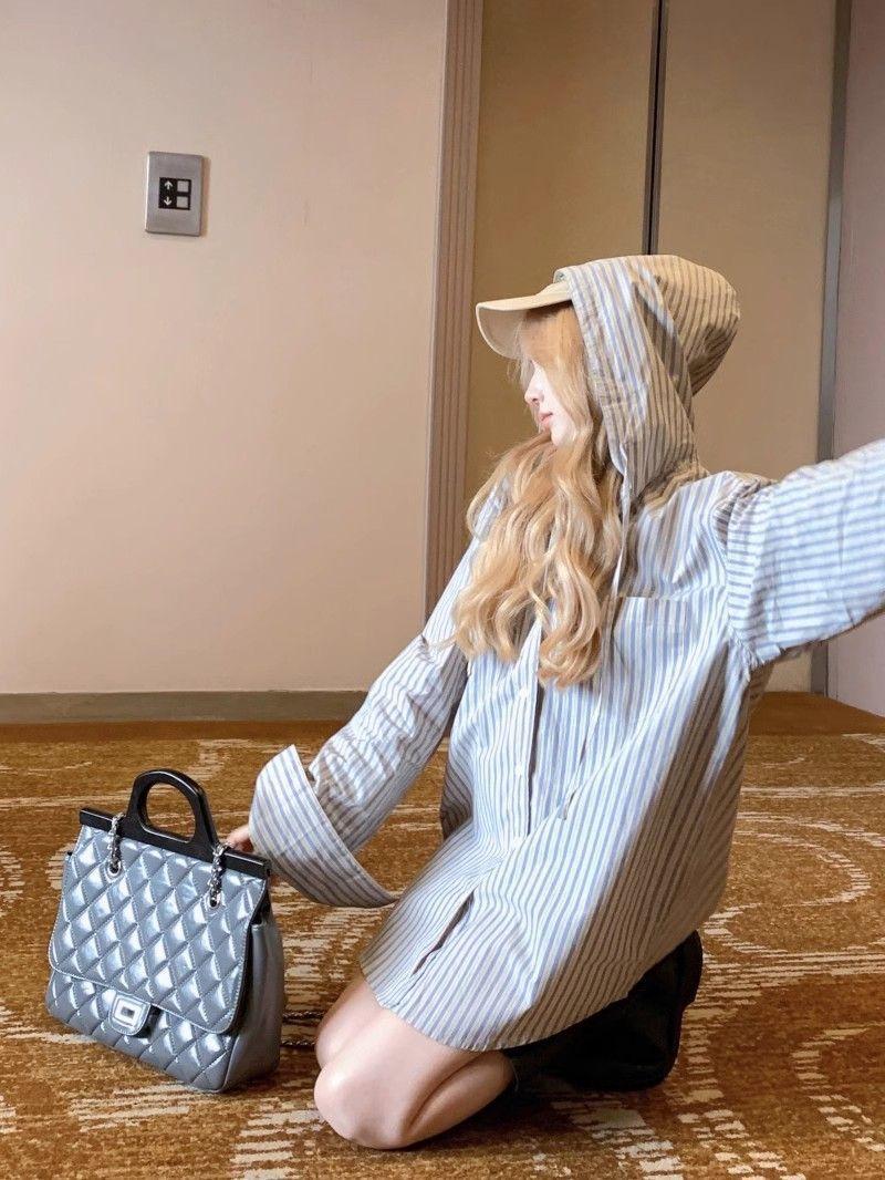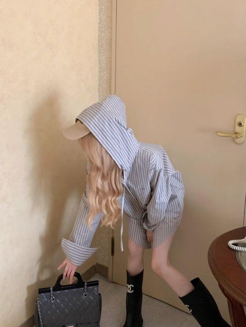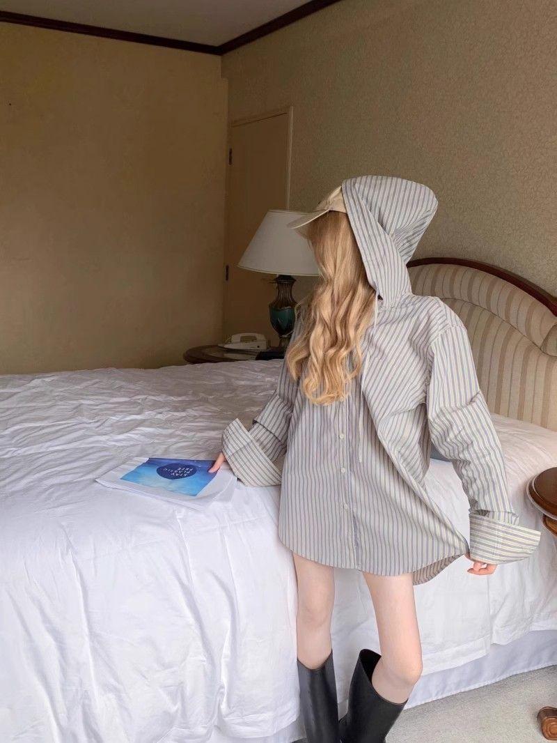 Chaqueta a rayas de manga larga con capucha Design Sense, camisa informal holgada de protección solar, top de longitud media