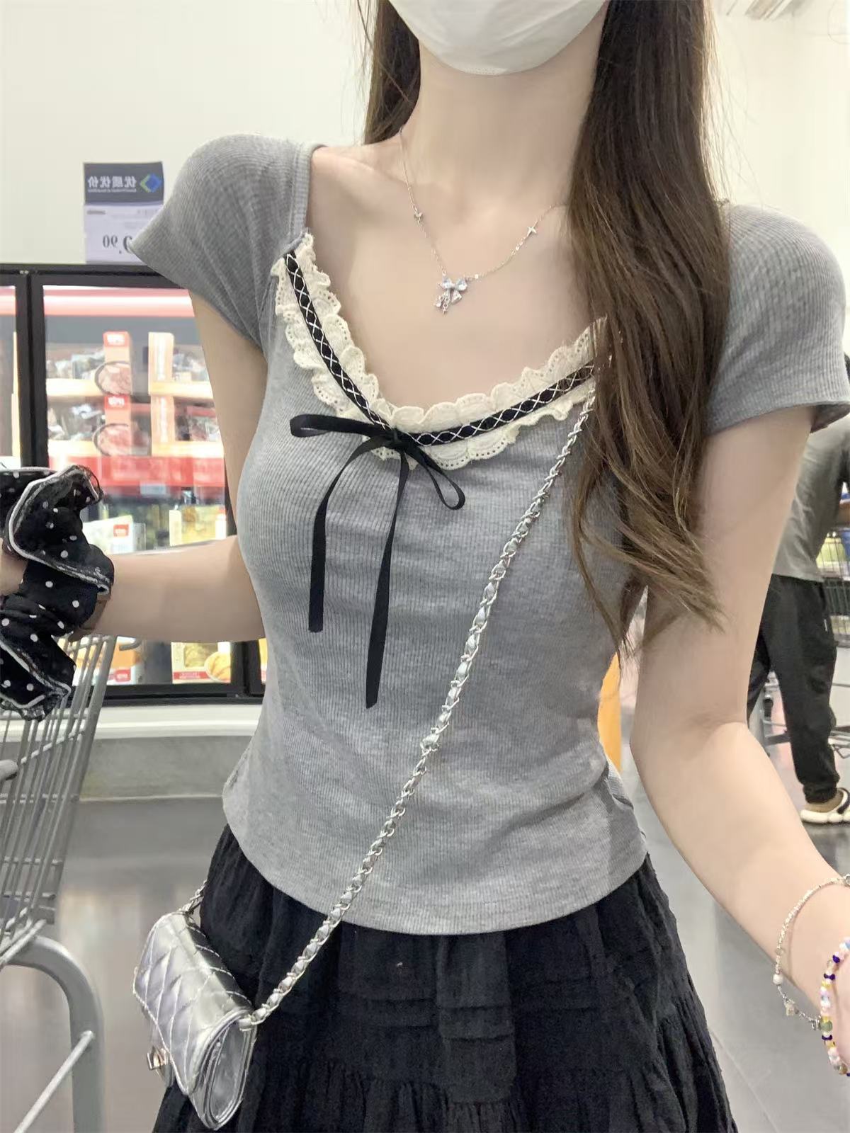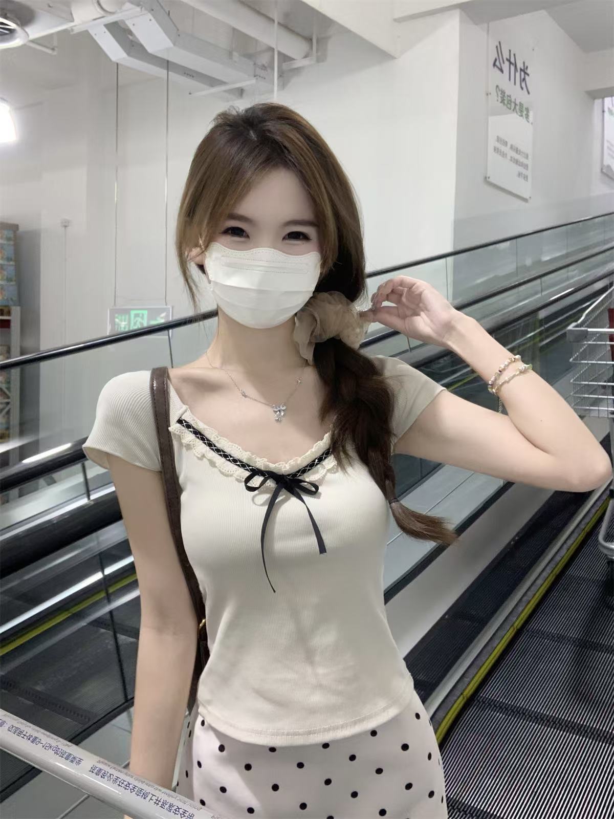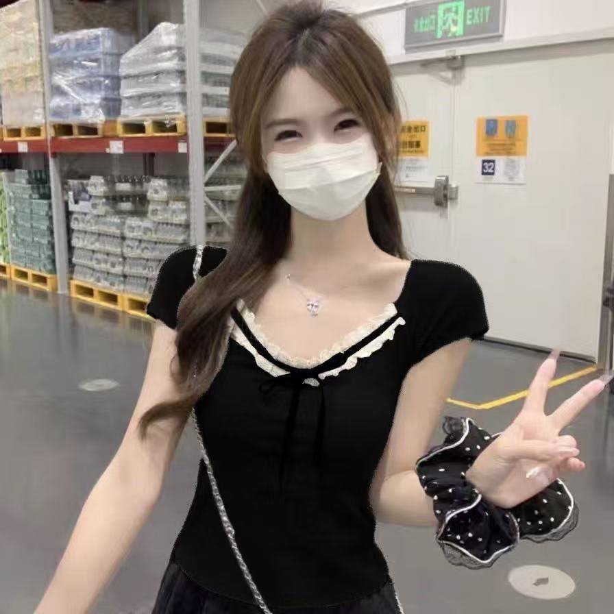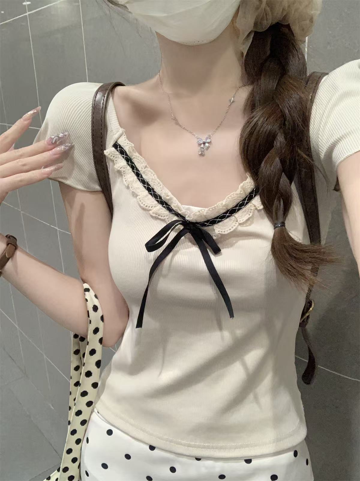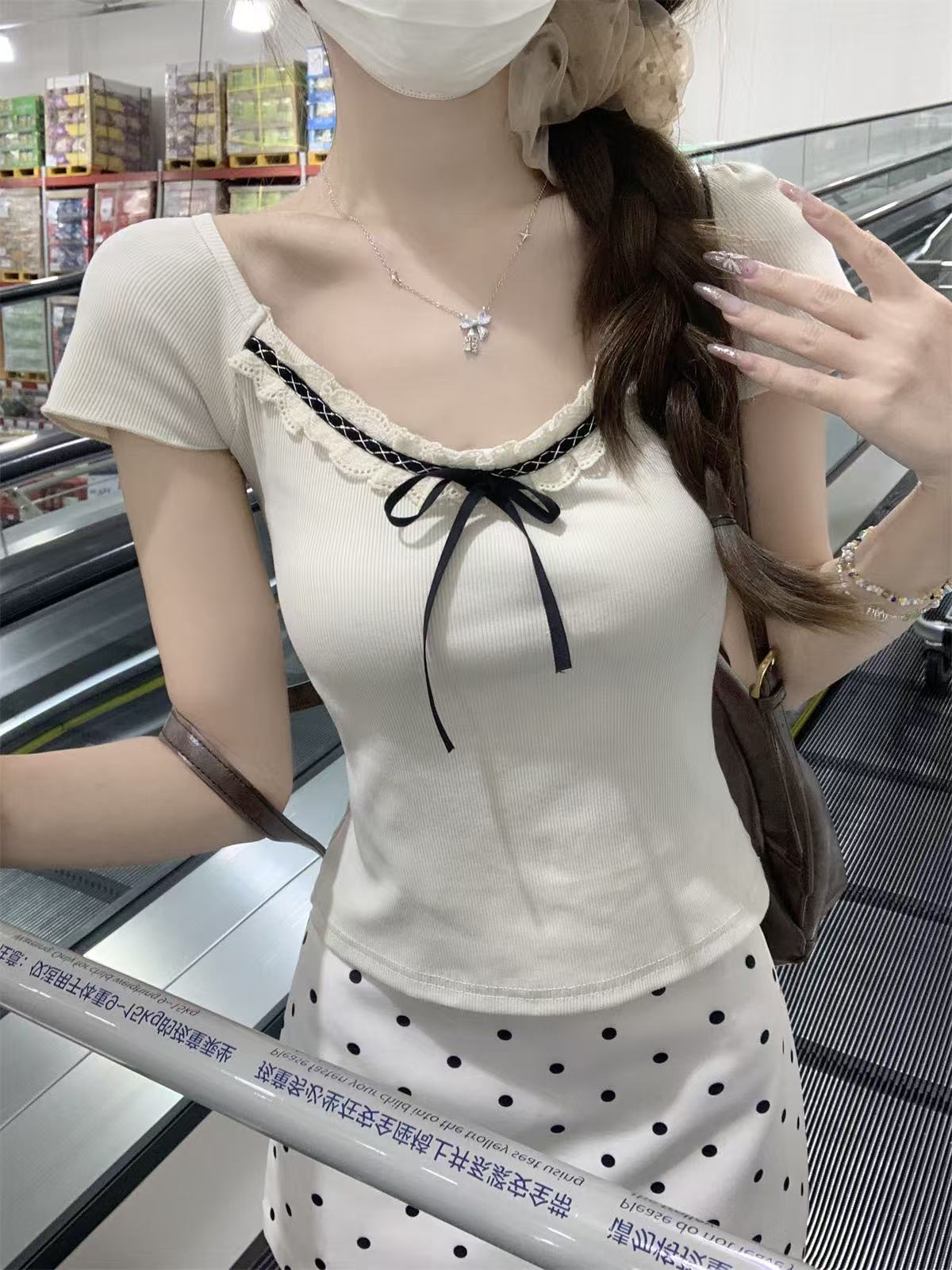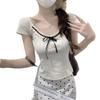 Camiseta de Encaje de Deseo Puro Francés Cuello Cuadrado Manga Corta Hombro Derecho Verano para Mujer Chica Caliente Lazo Ajustado Top Corto