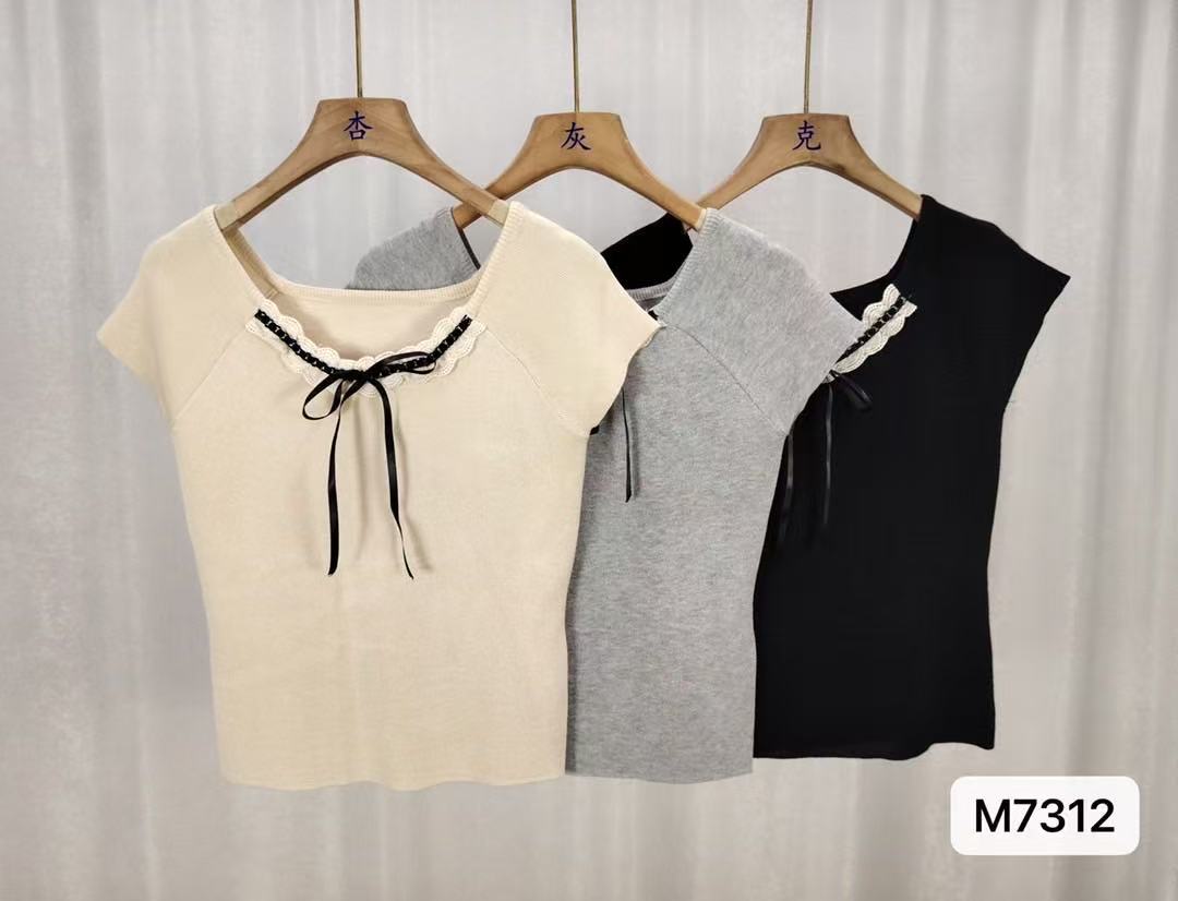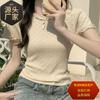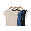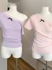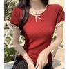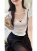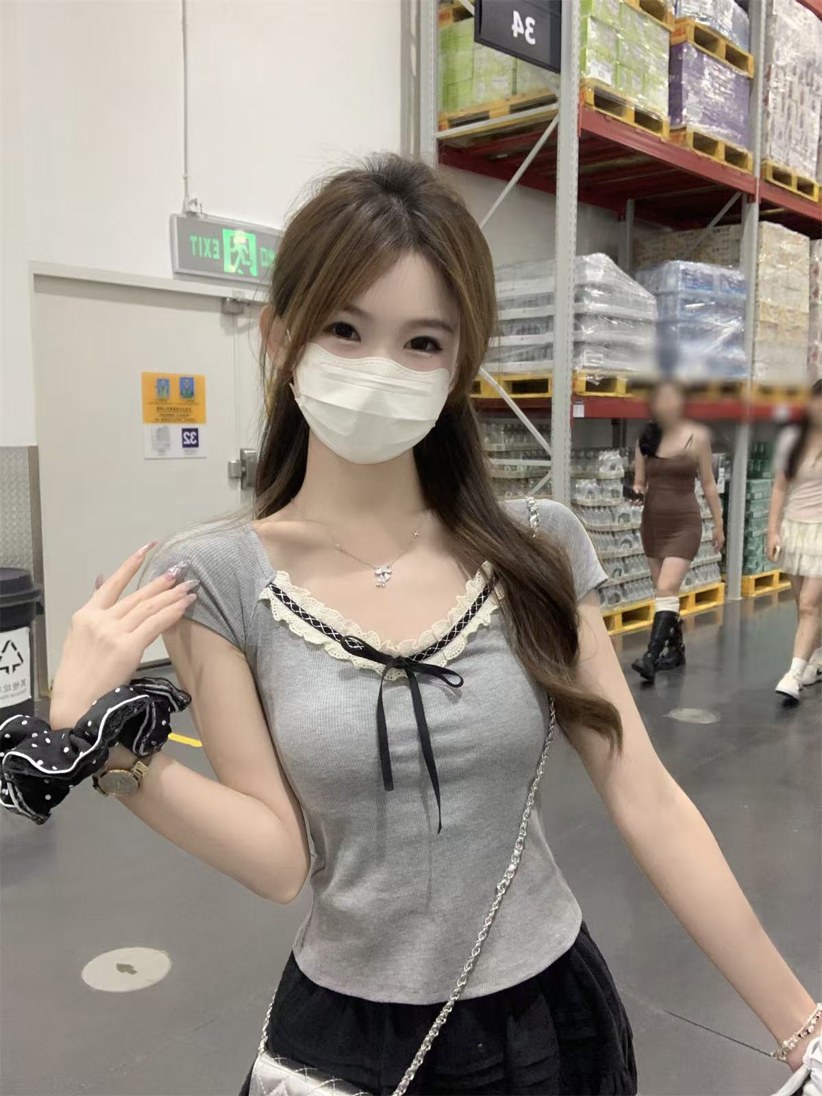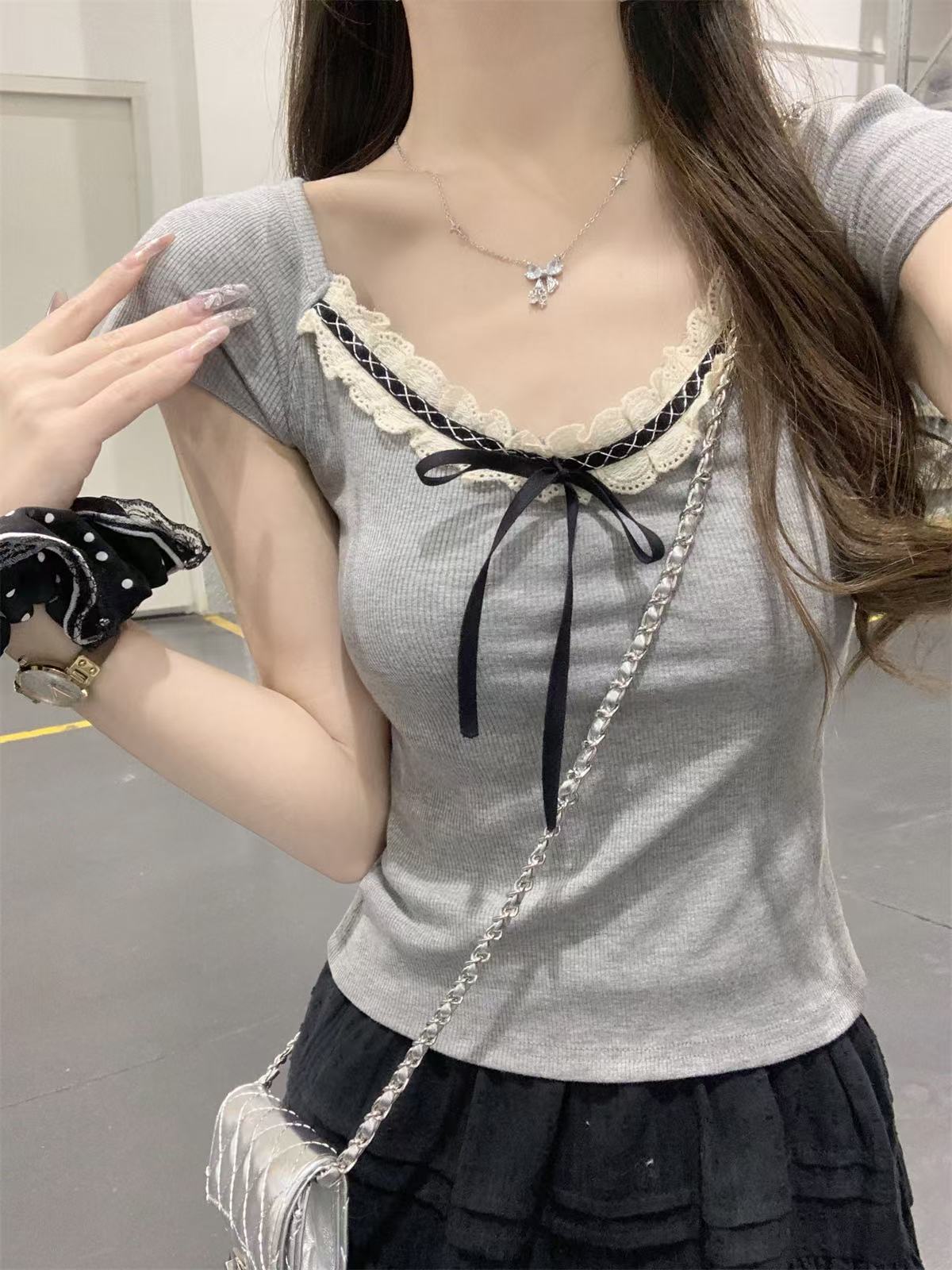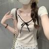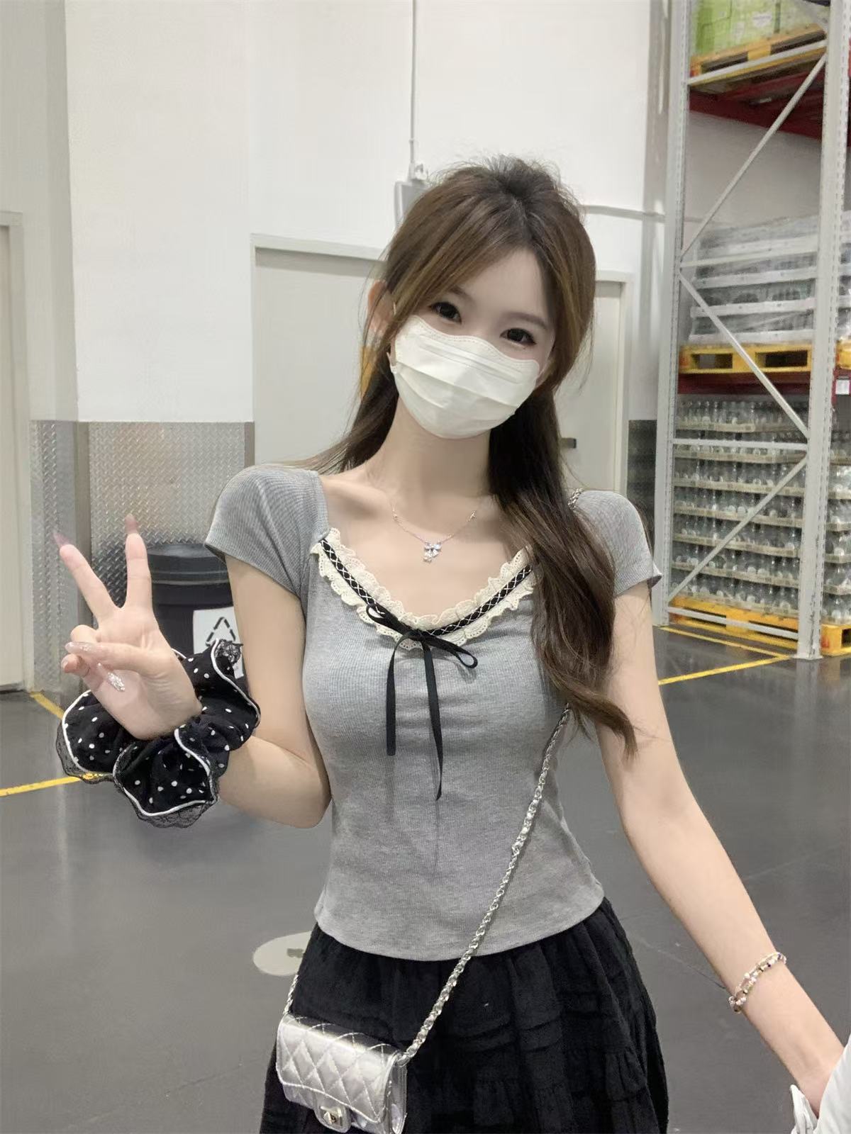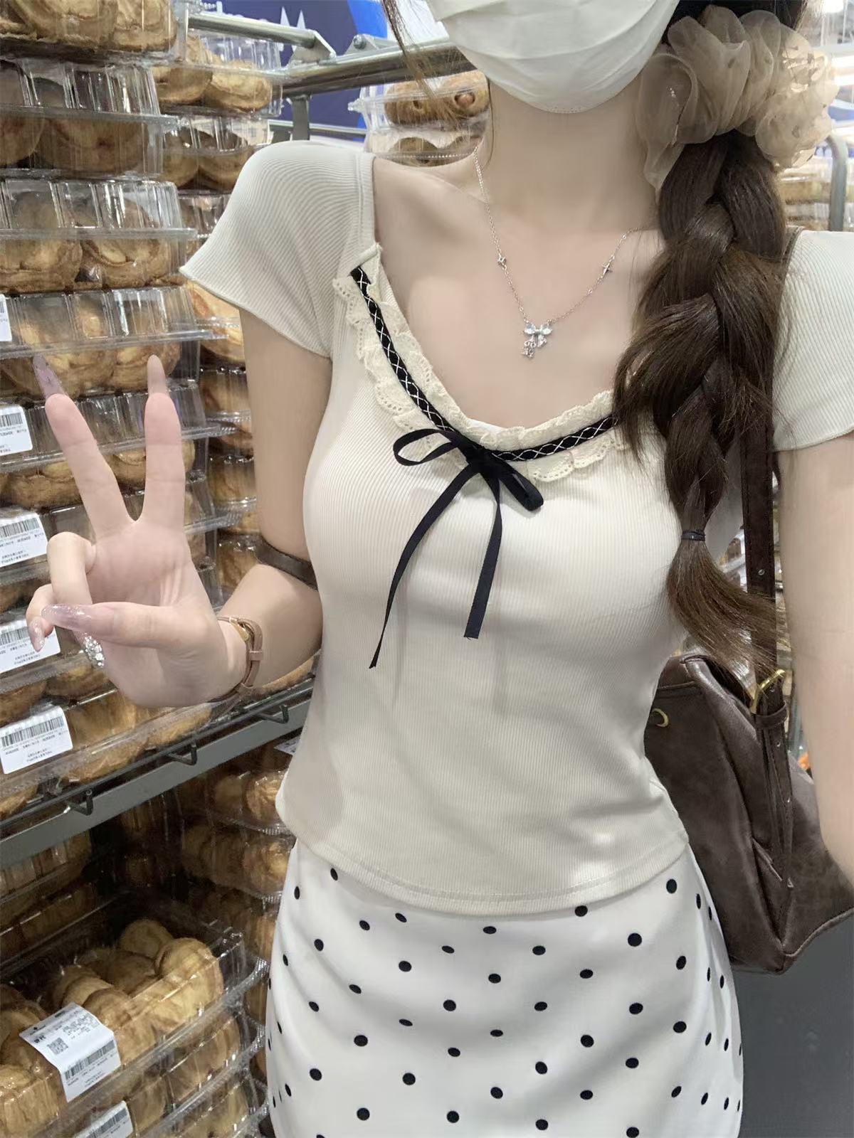 Camiseta de Encaje de Deseo Puro Francés Cuello Cuadrado Manga Corta Hombro Derecho Verano para Mujer Chica Caliente Lazo Ajustado Top Corto