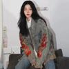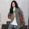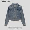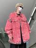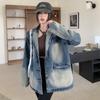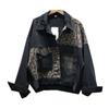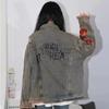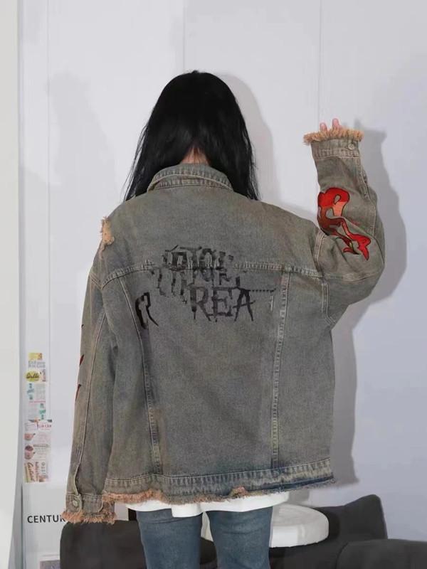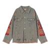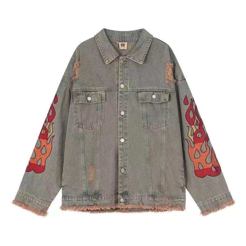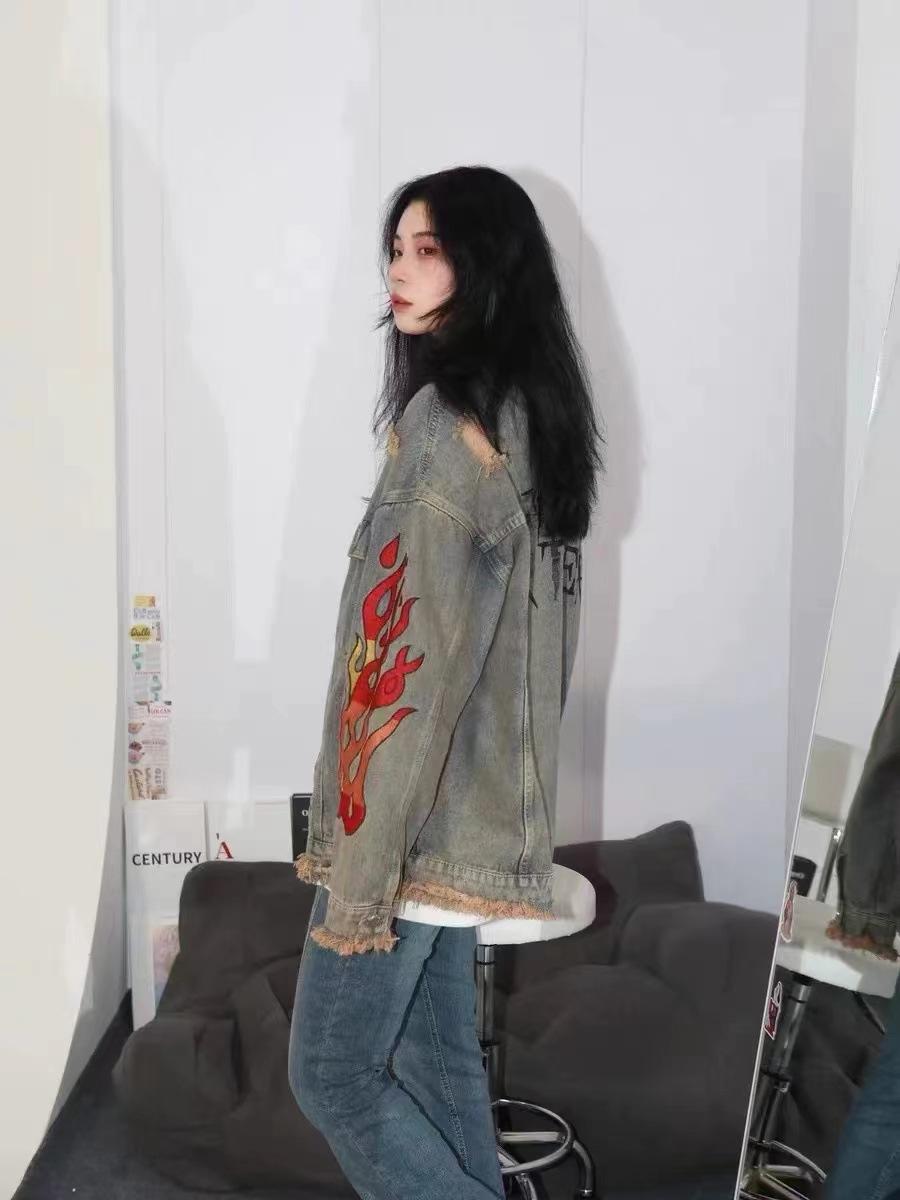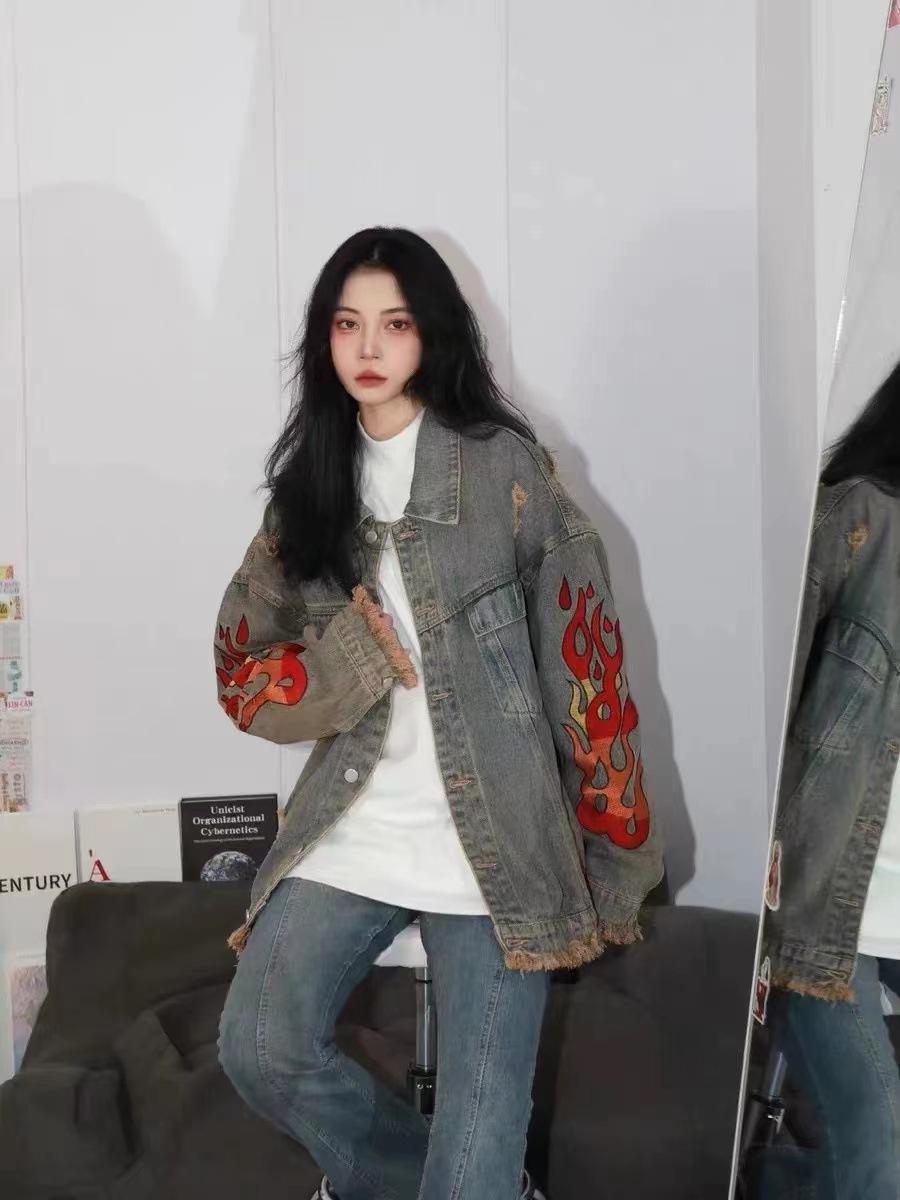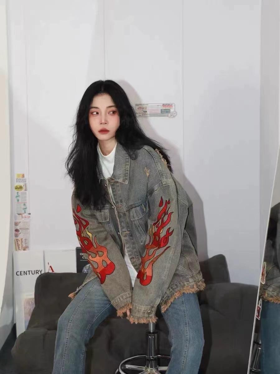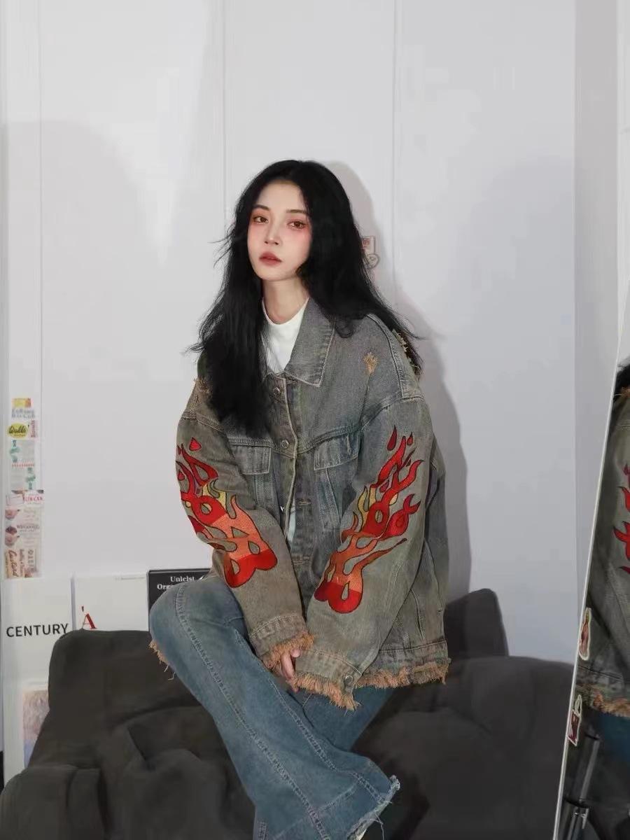 Chamarra de mezclilla tie-dye desgastada lavada para mujer, largo medio, primavera y otoño, rasgada, con borde crudo, bordado de llamas, chamarra superior para pareja