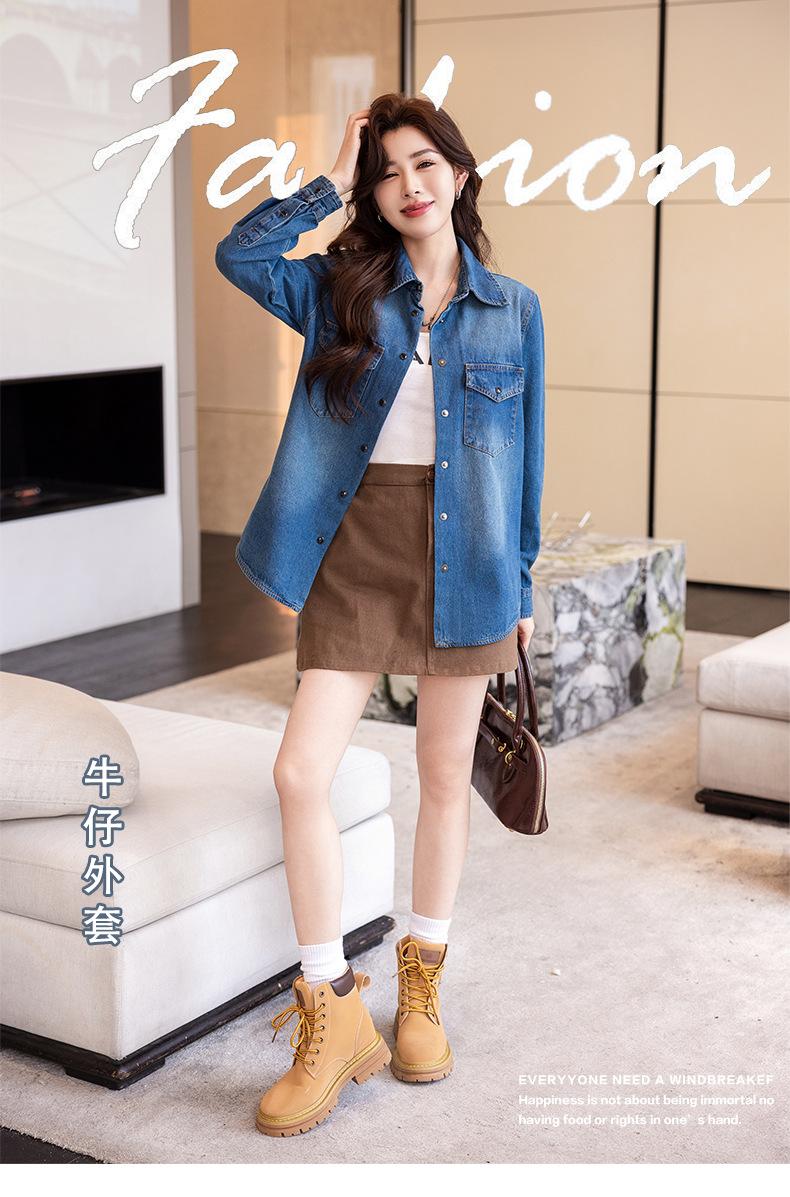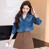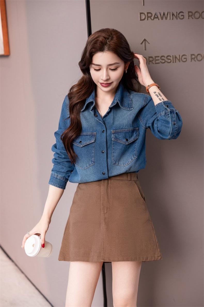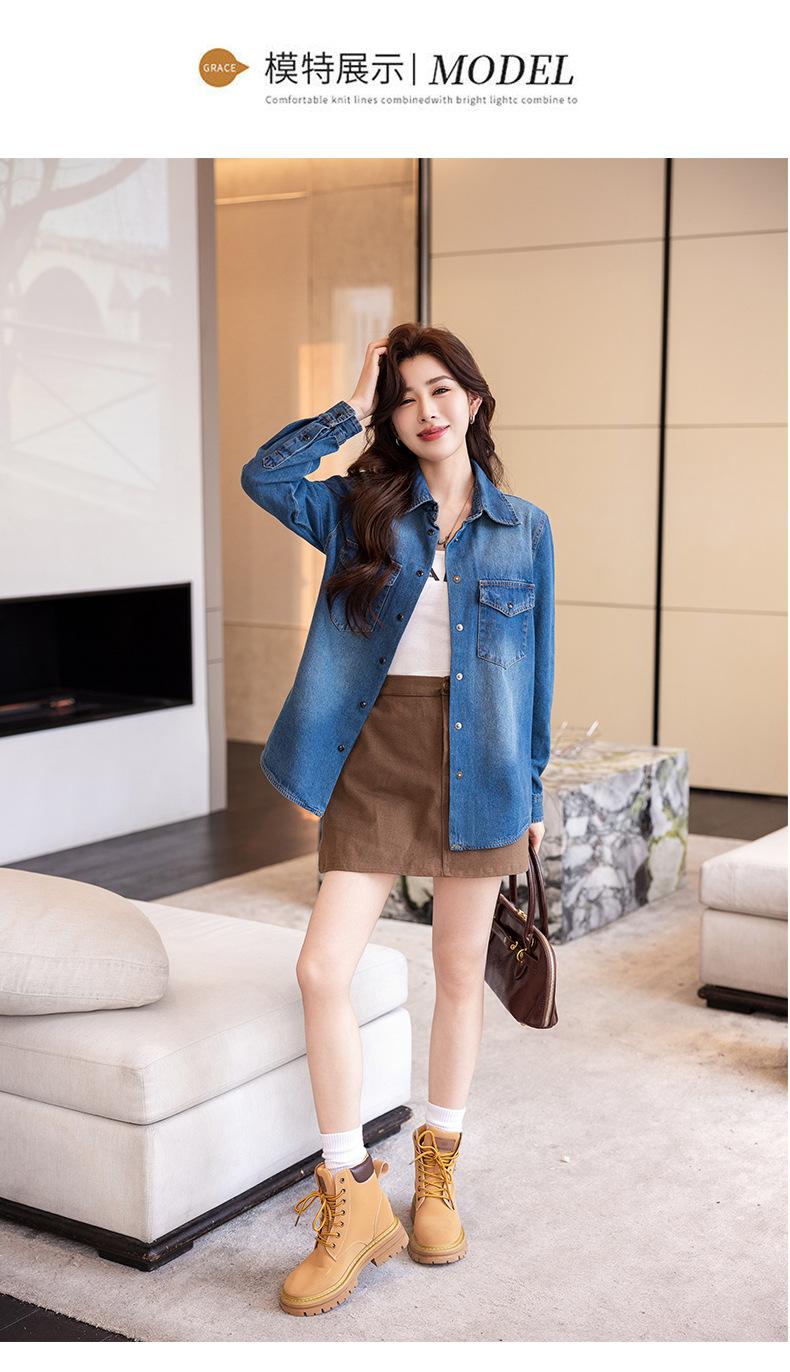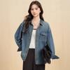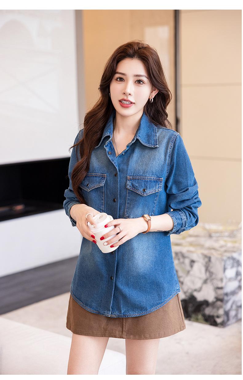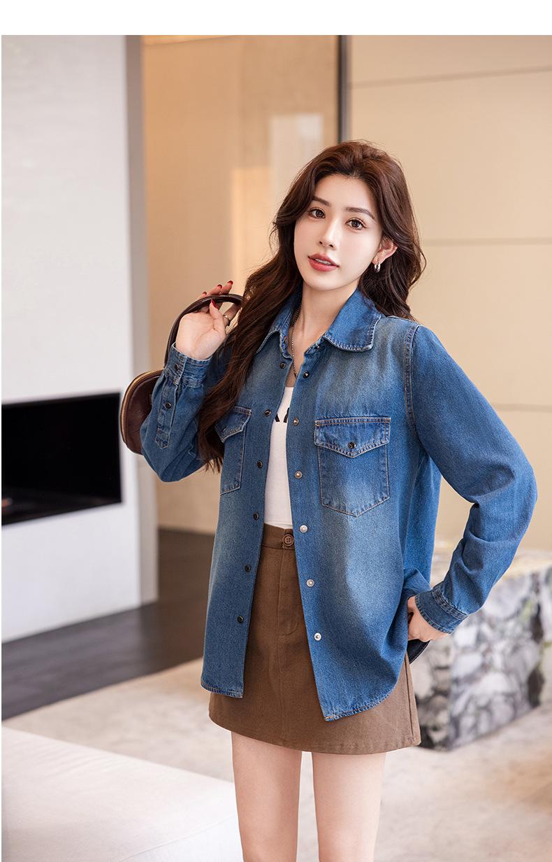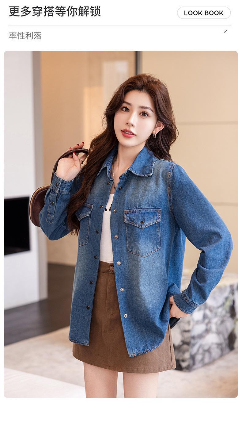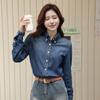 Foto Real de Camisa de Mezclilla Retro para Mujer Primavera y Otoño 2025 Nuevo Estilo en Capas con Top Básico de Hombro Derecho Ropa Exterior Holgada para Mujer