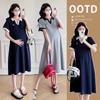 2024 Ropa de Maternidad Nueva Moda Temperamento Rayado en Contraste Manga Corta Verano Falda de Maternidad Bordada de Largo Medio