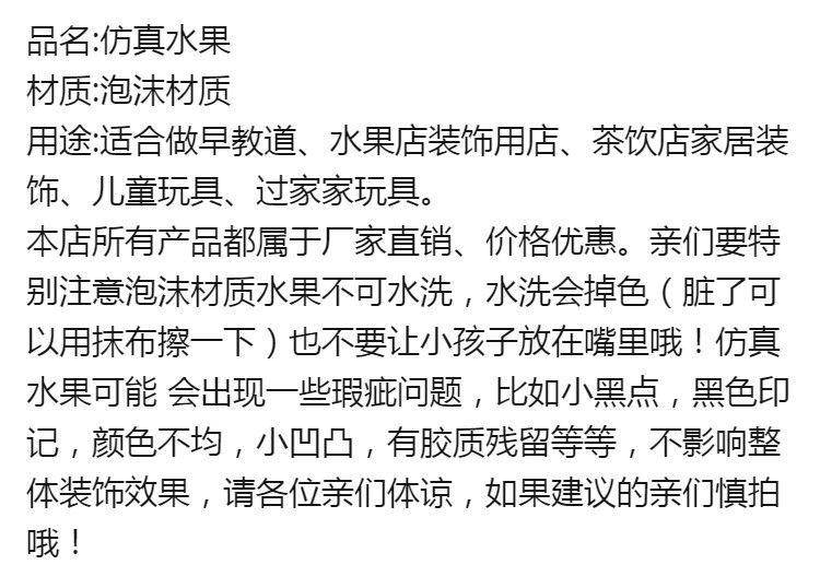 Estimados amigos, tengan en cuenta que estos son modelos de mini frutas y verduras. Por favor, miren el tamaño cuidadosamente y no confíen en su imaginación. El material de espuma no se puede remojar en agua ni lavar, de lo contrario se decolorará. Cuando los niños jueguen con ellos, necesitan estar acompañados por adultos. ¡Son accesorios de educación temprana y no se pueden morder ni lavar!!!