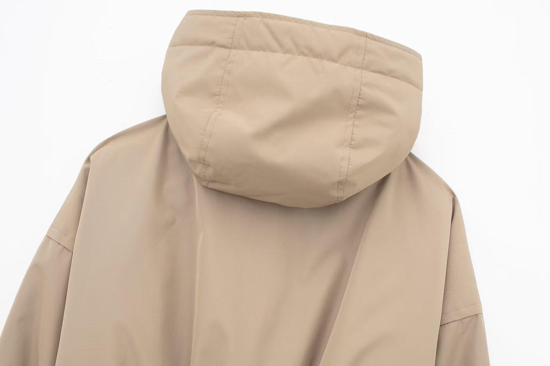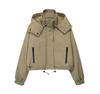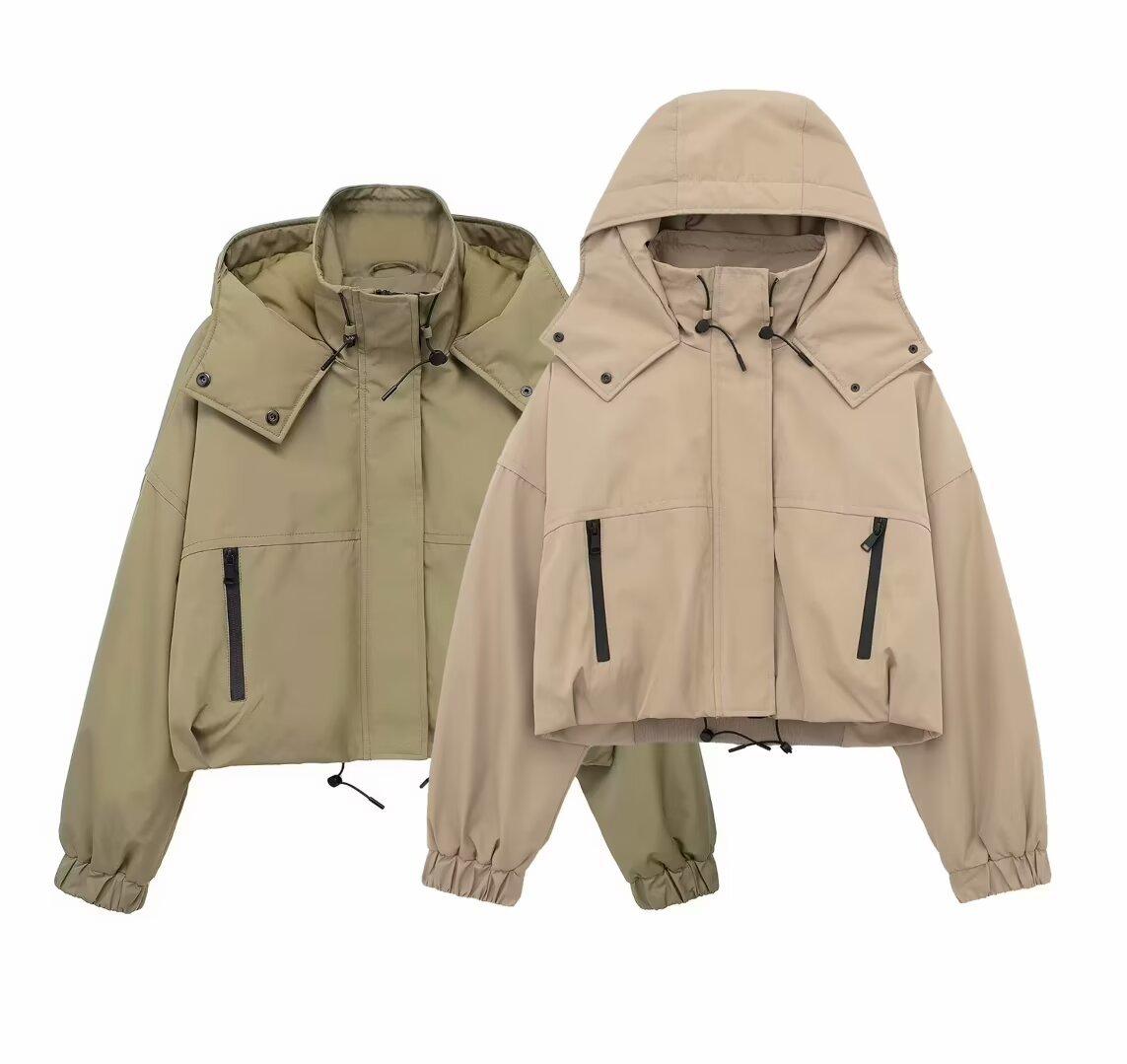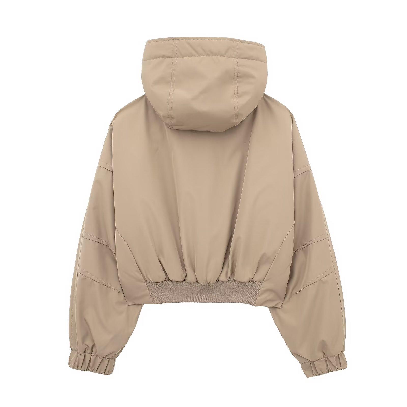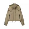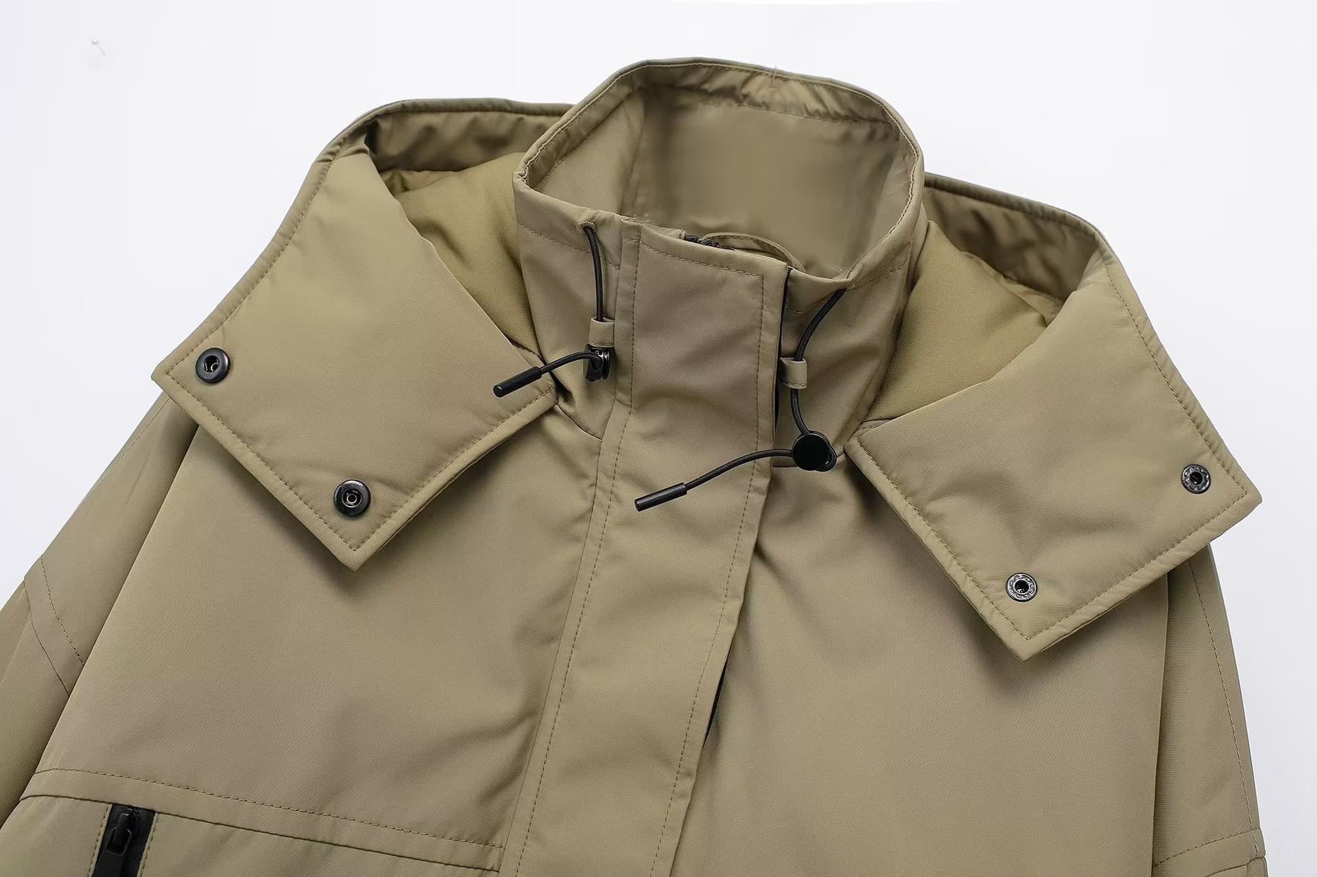 Chaqueta corta con capucha color caqui para mujer, estilo europeo y americano, moda urbana 2024, color liso, chaqueta holgada de invierno con borde cruzado, nuevo producto