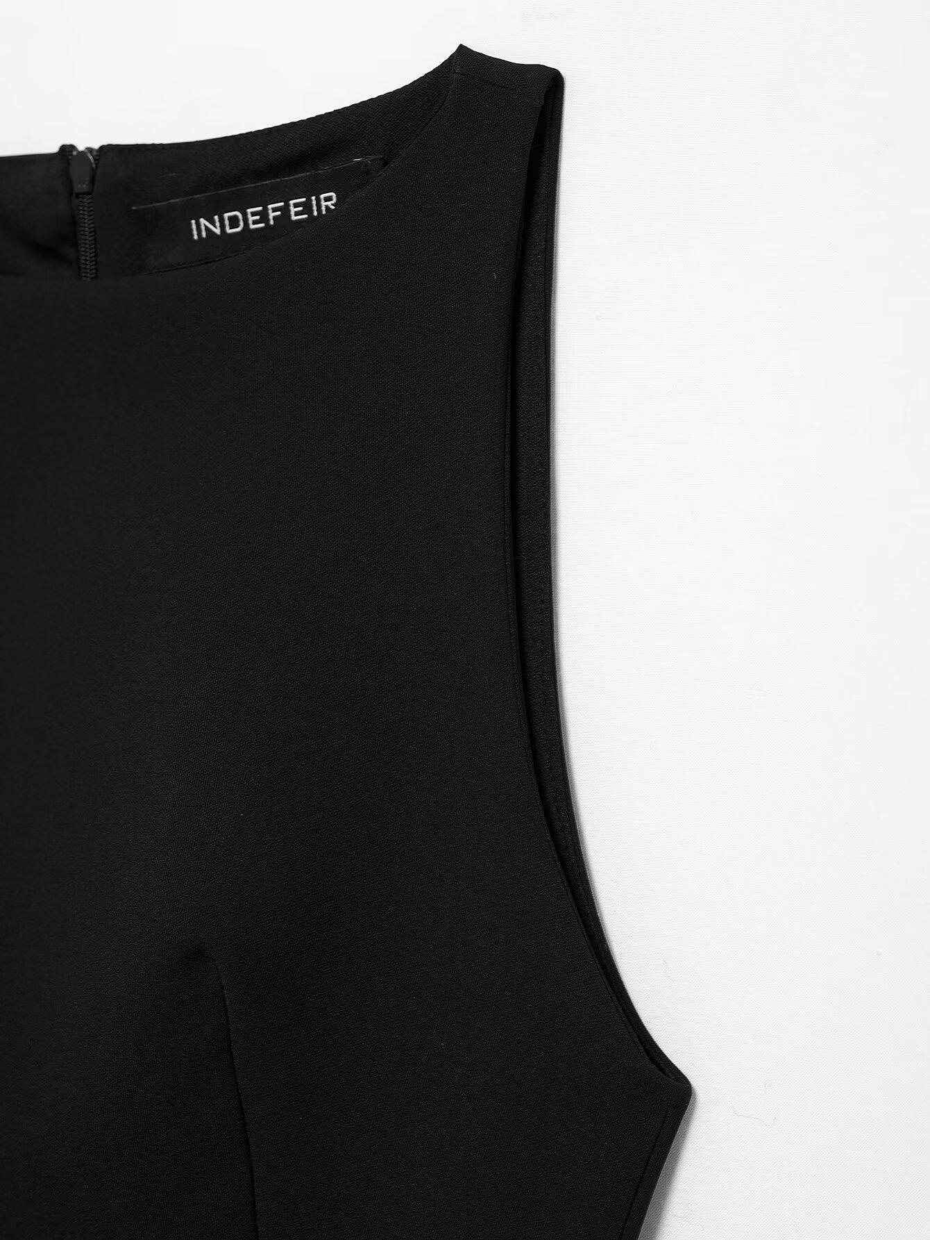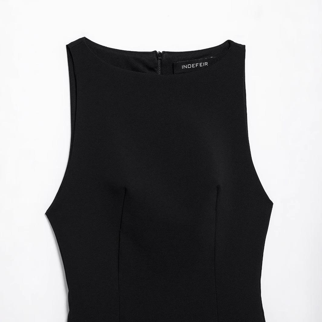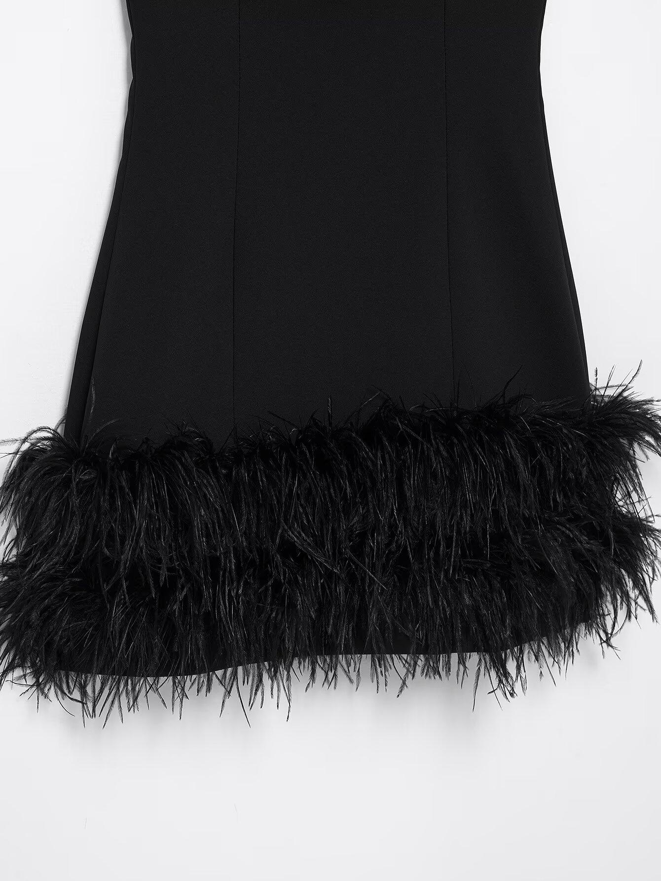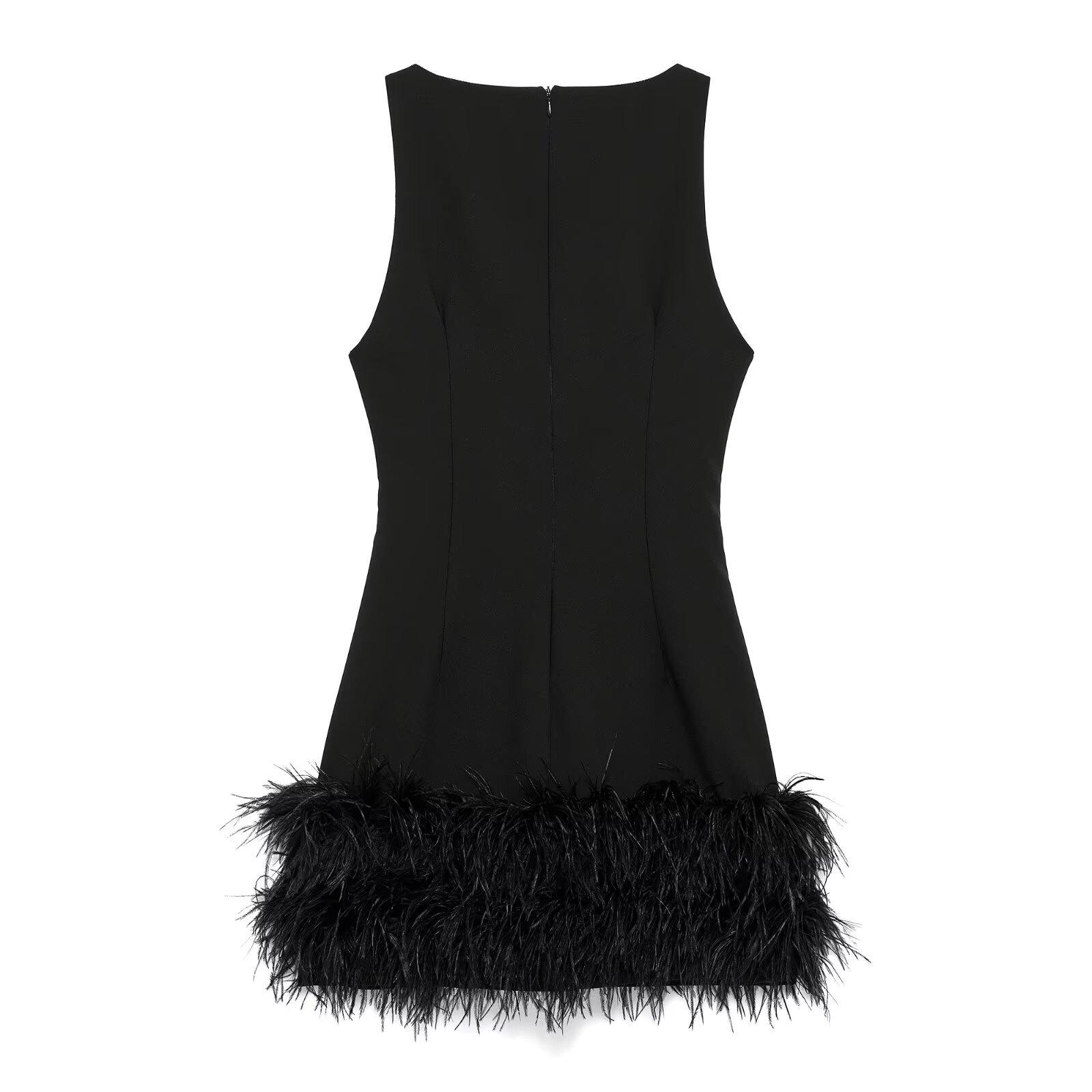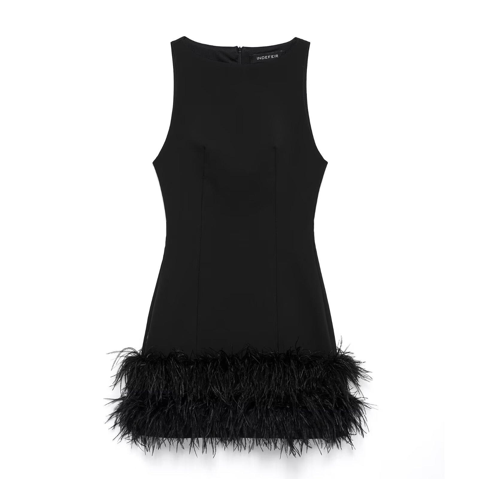 Vestido negro sin mangas ajustado sexy con adornos de plumas elástico de cuello redondo sin mangas para primavera y verano, nuevo estilo europeo y americano