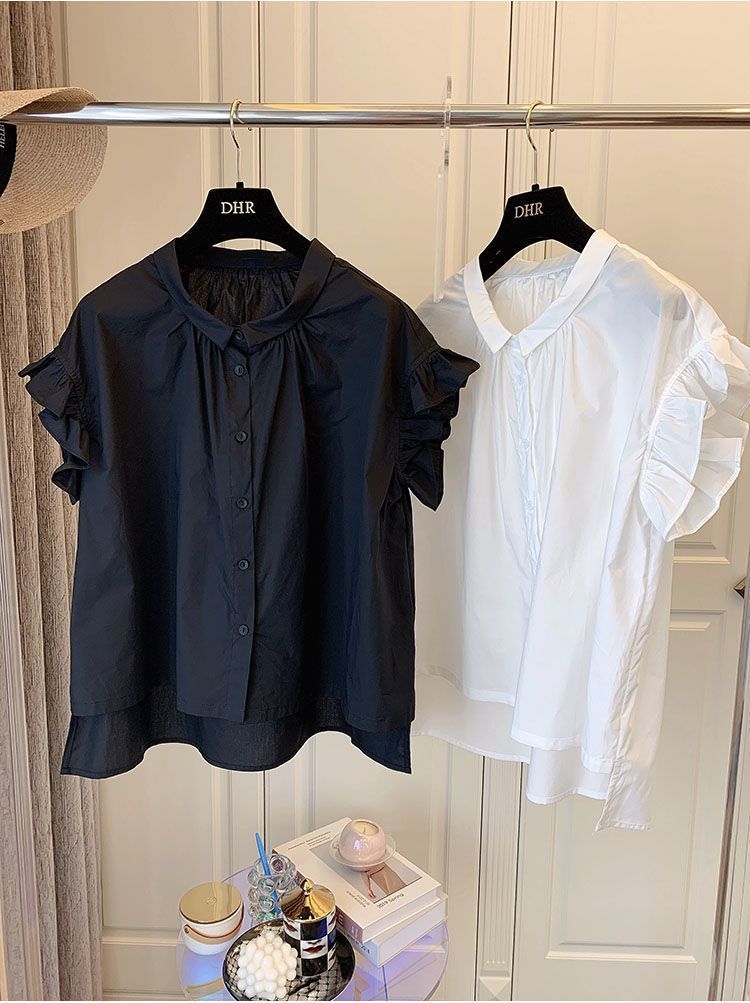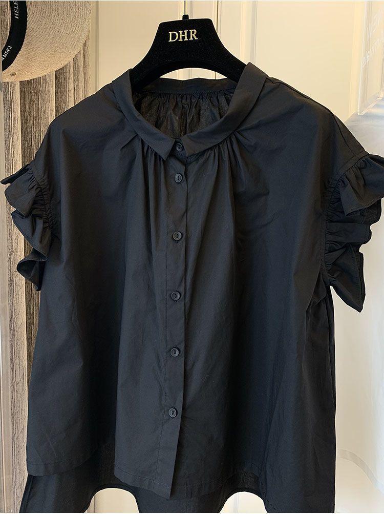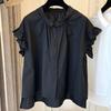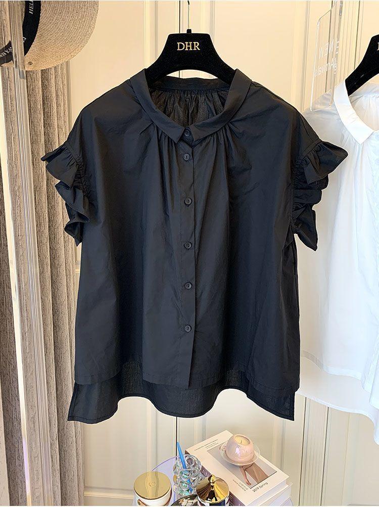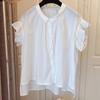 Camisa de manga corta con volantes para mujer, nuevo diseño de verano, estilo francés, holgada, informal, con cuello pequeño y ribete en las orejas.