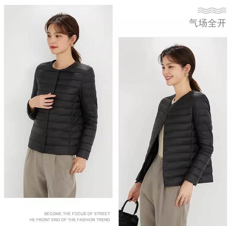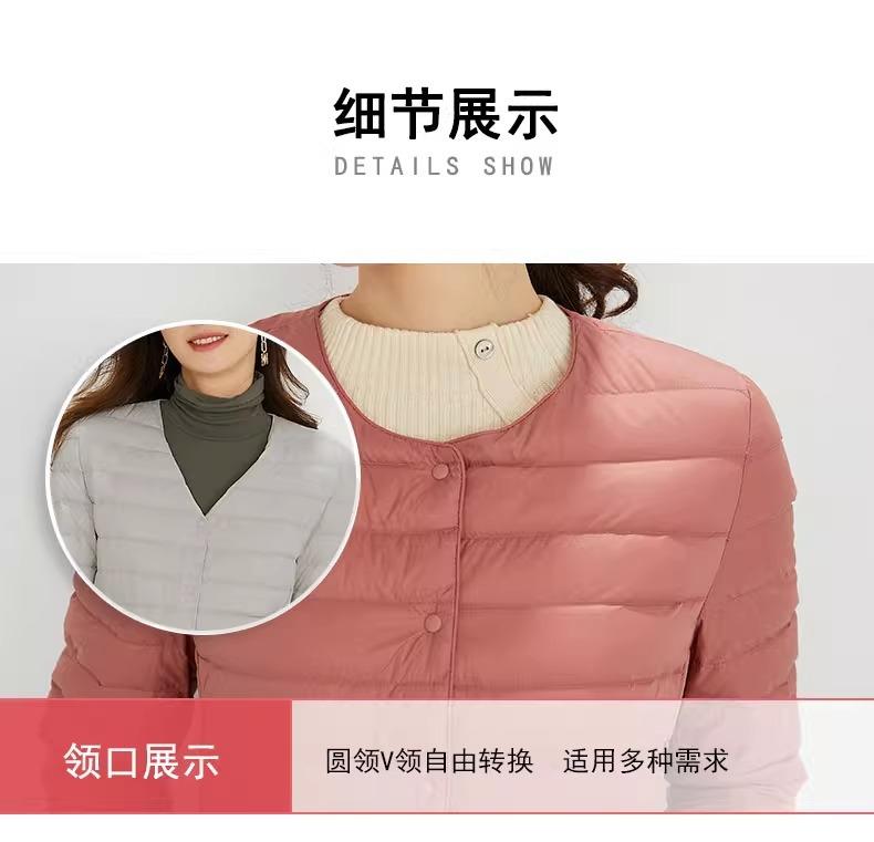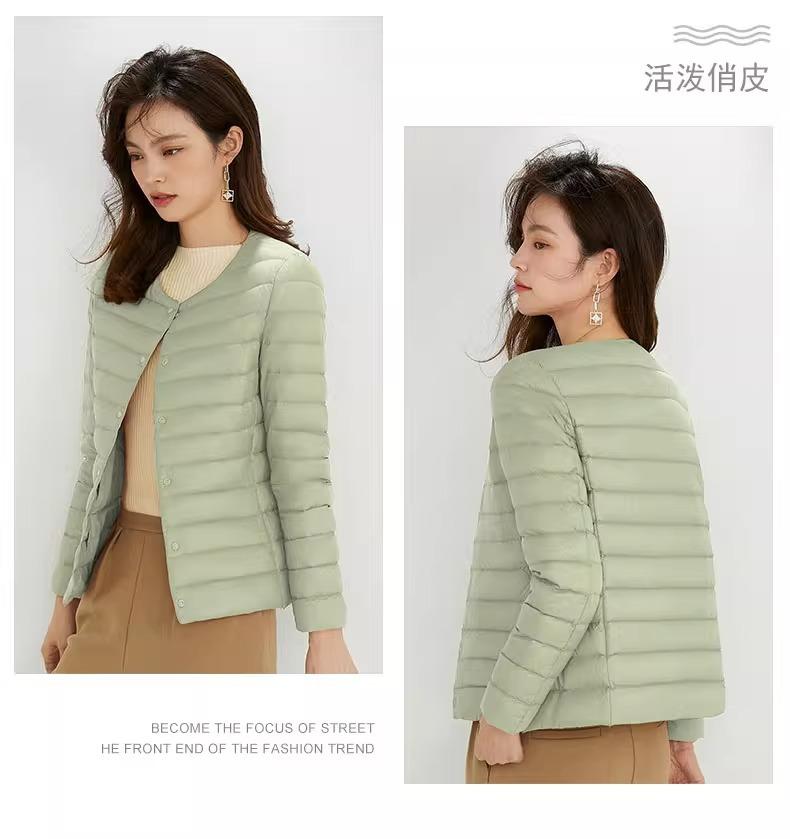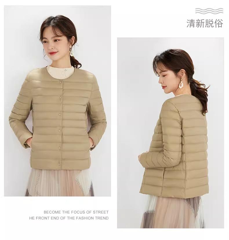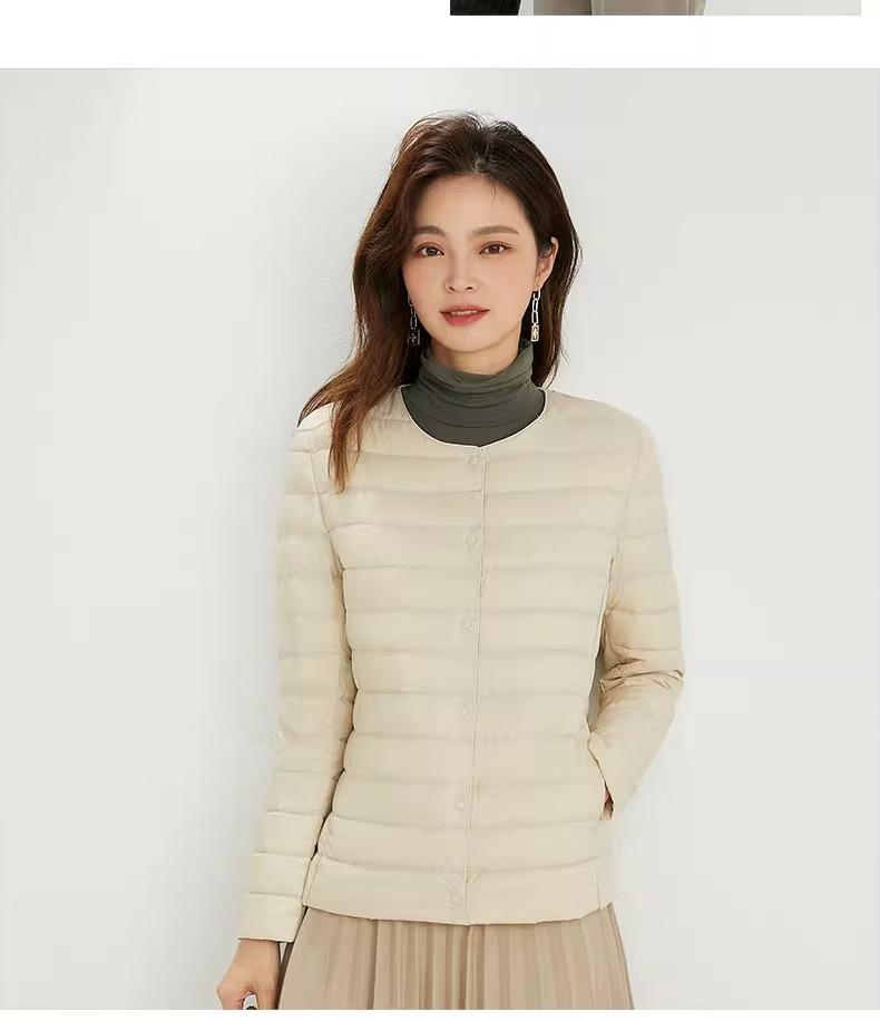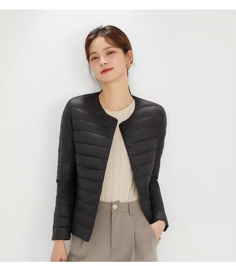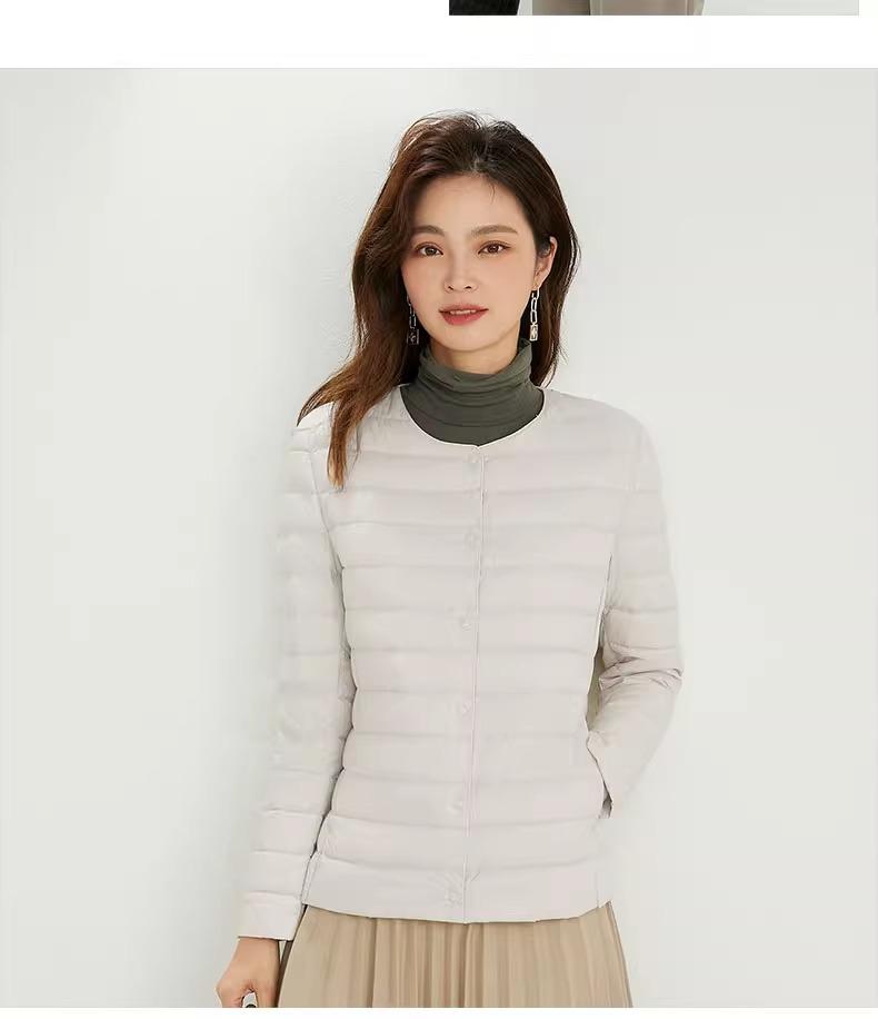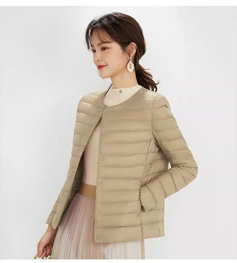 2025 Nuevo Chaqueta de Plumón Ligera 90 para Mujer Cuello Redondo Cálido Forro Corto Cuello en V Ropa de Otoño e Invierno para Mujer Sin Cuello