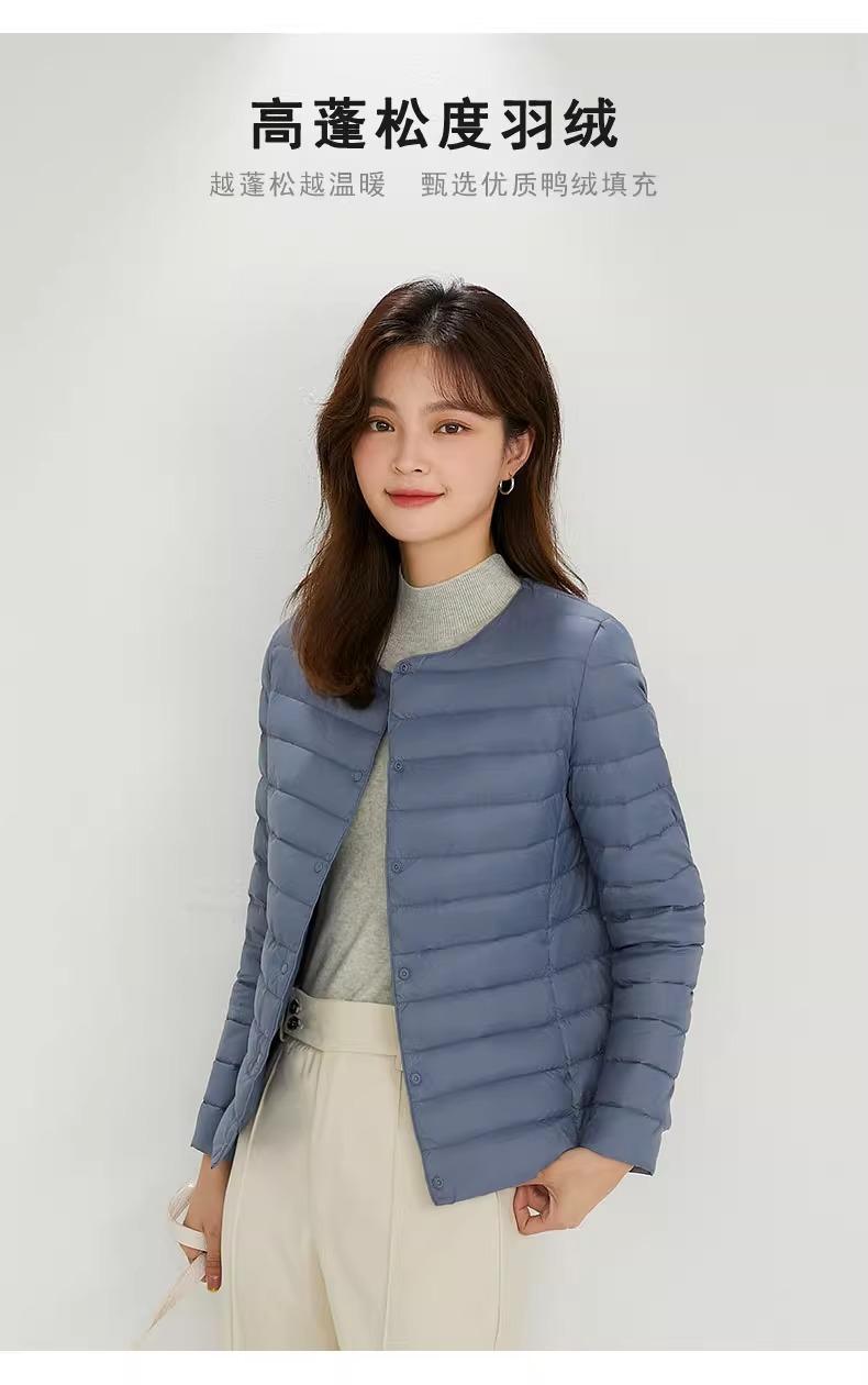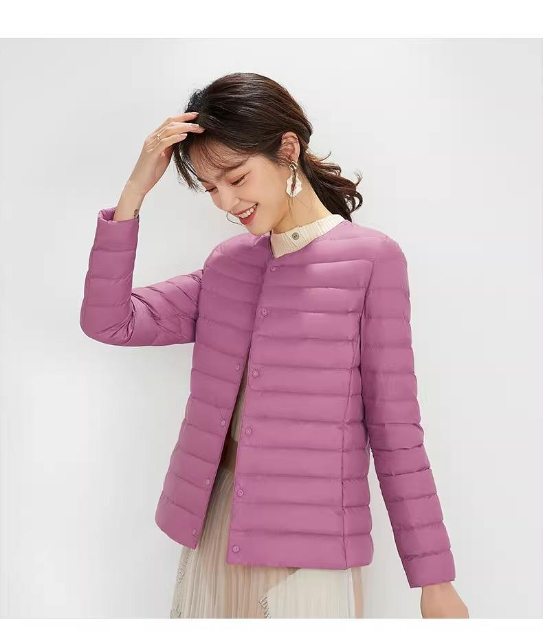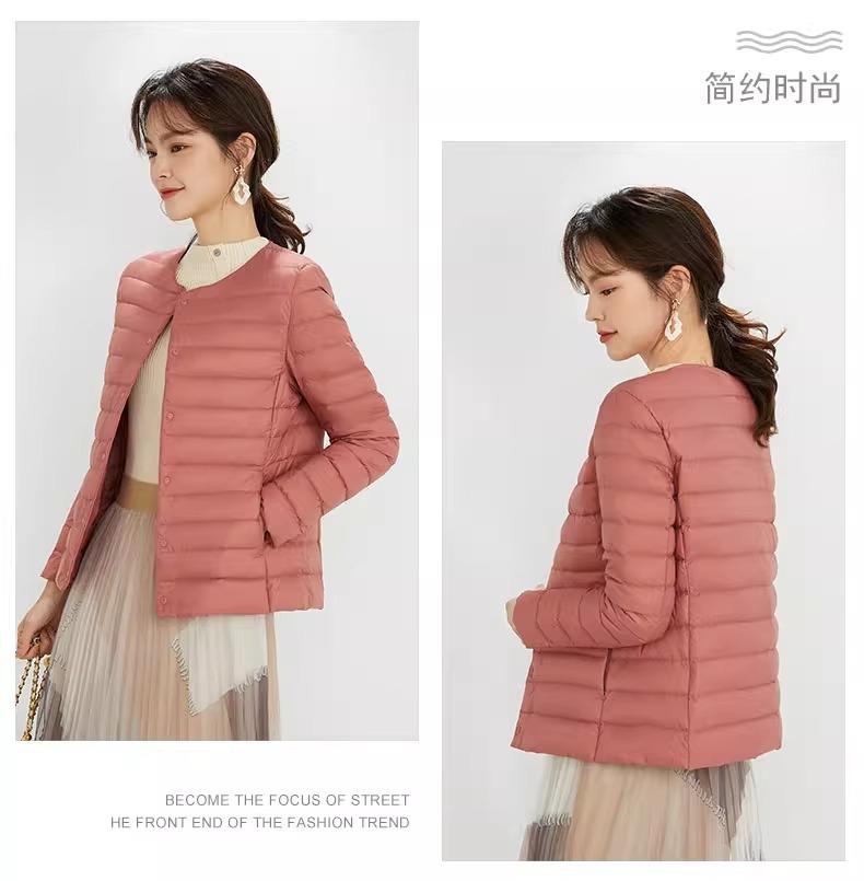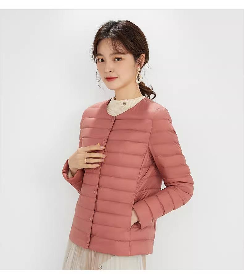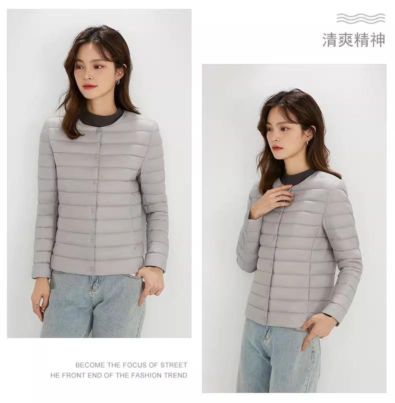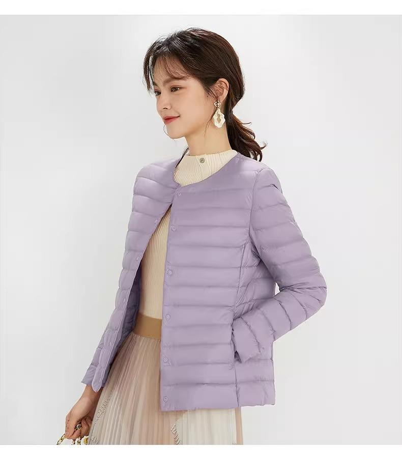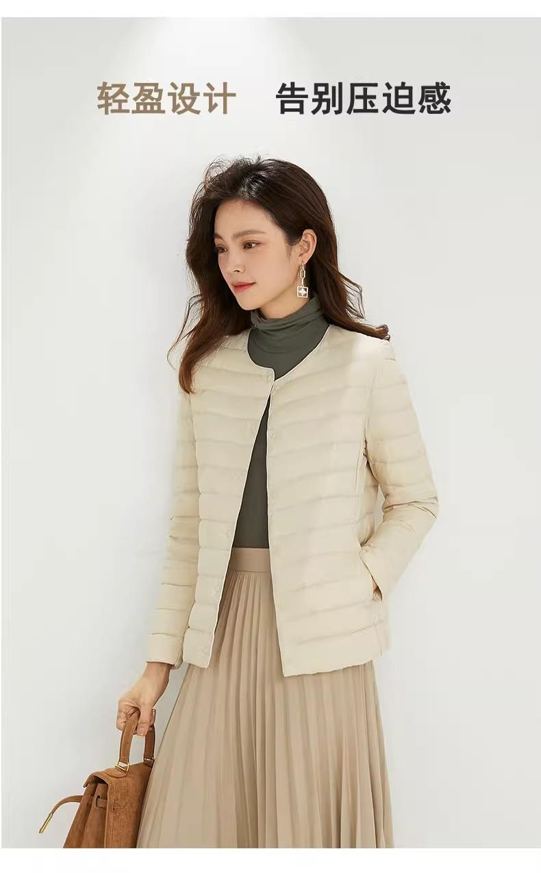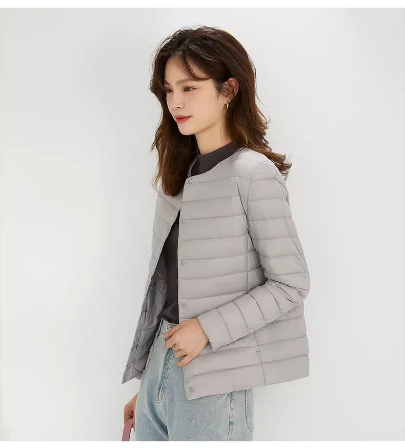 2025 Nuevo Chaqueta de Plumón Ligera 90 para Mujer Cuello Redondo Cálido Forro Corto Cuello en V Ropa de Otoño e Invierno para Mujer Sin Cuello