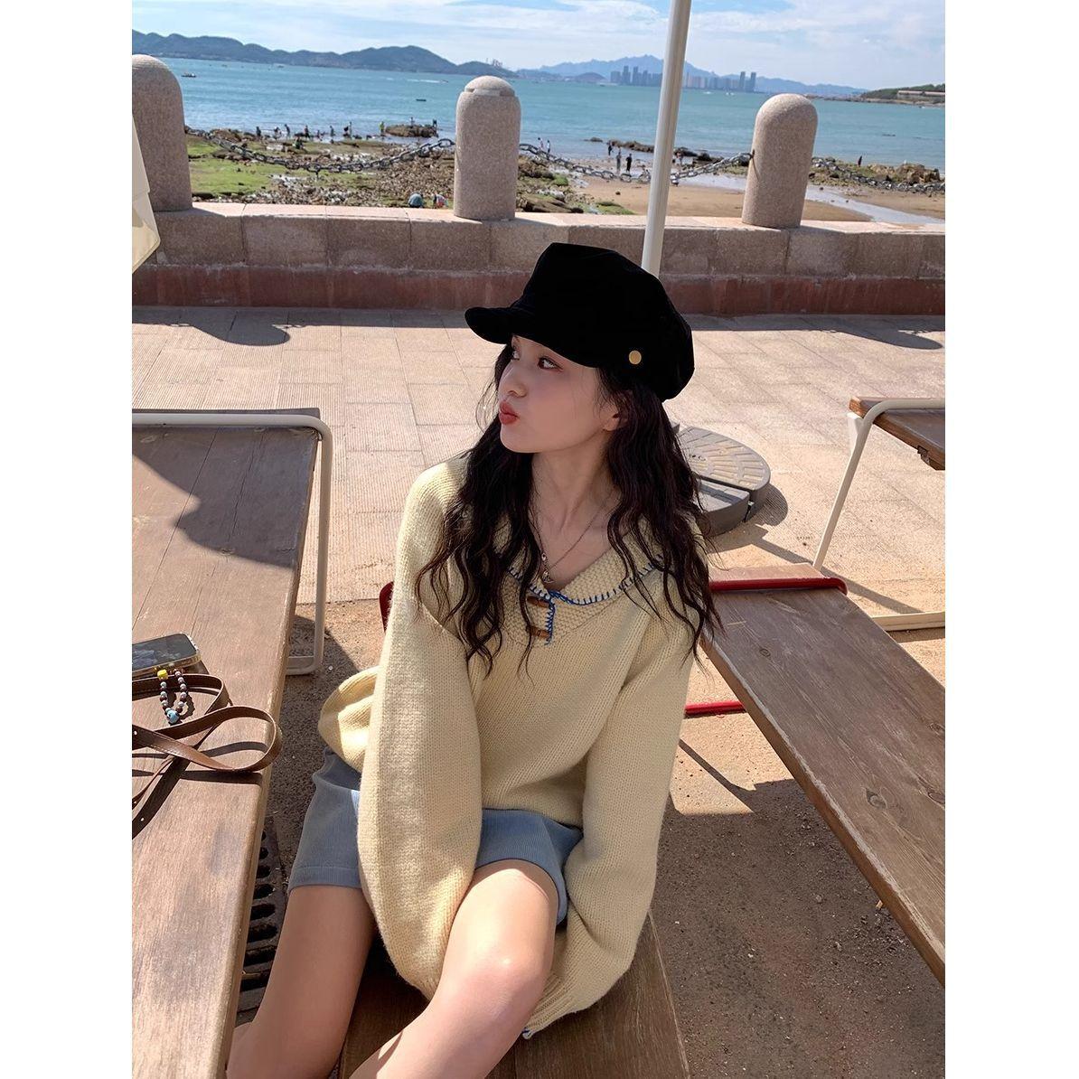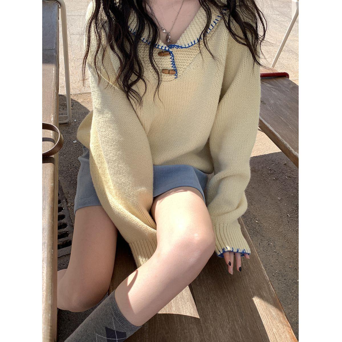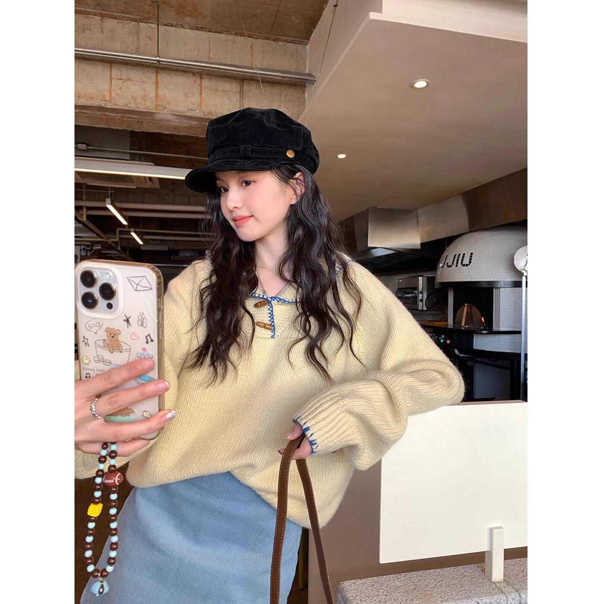 Suéter Dulce de Manga Larga Estilo Coreano Camiseta Otoño Nuevo Suelto Suave Deseo Puro Nicho Ceroso Contraste de Color Top ins