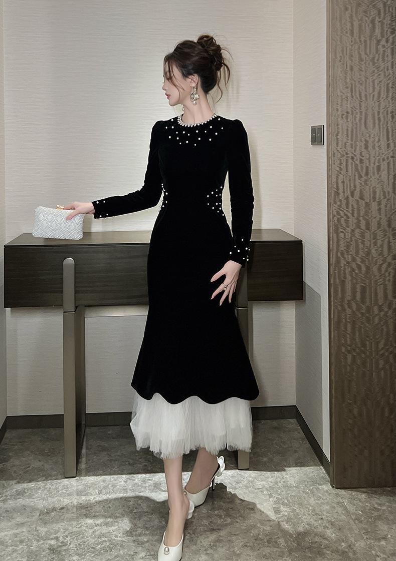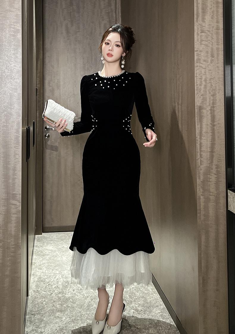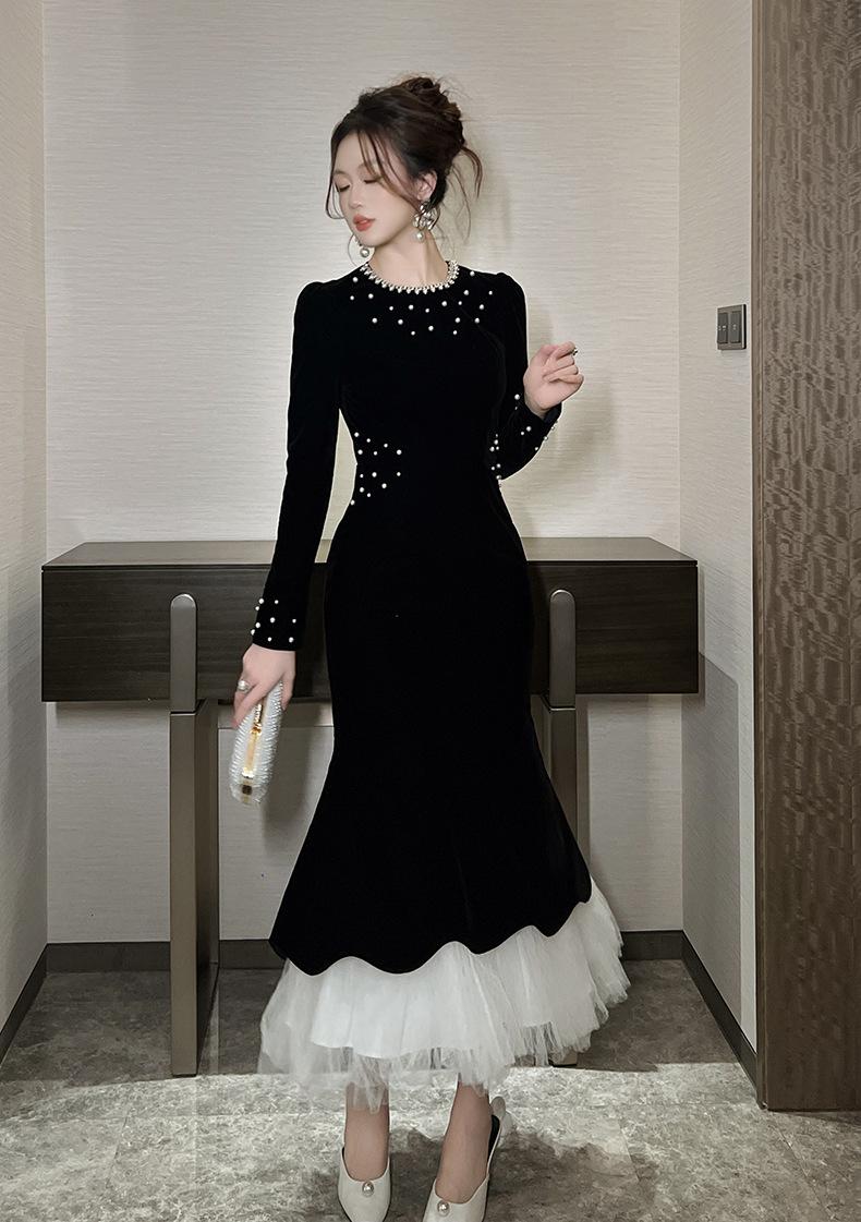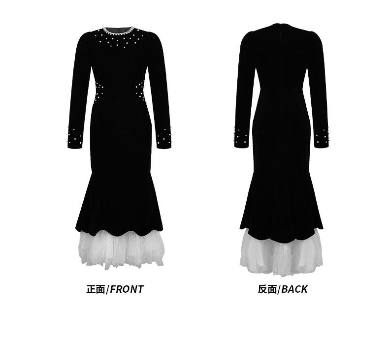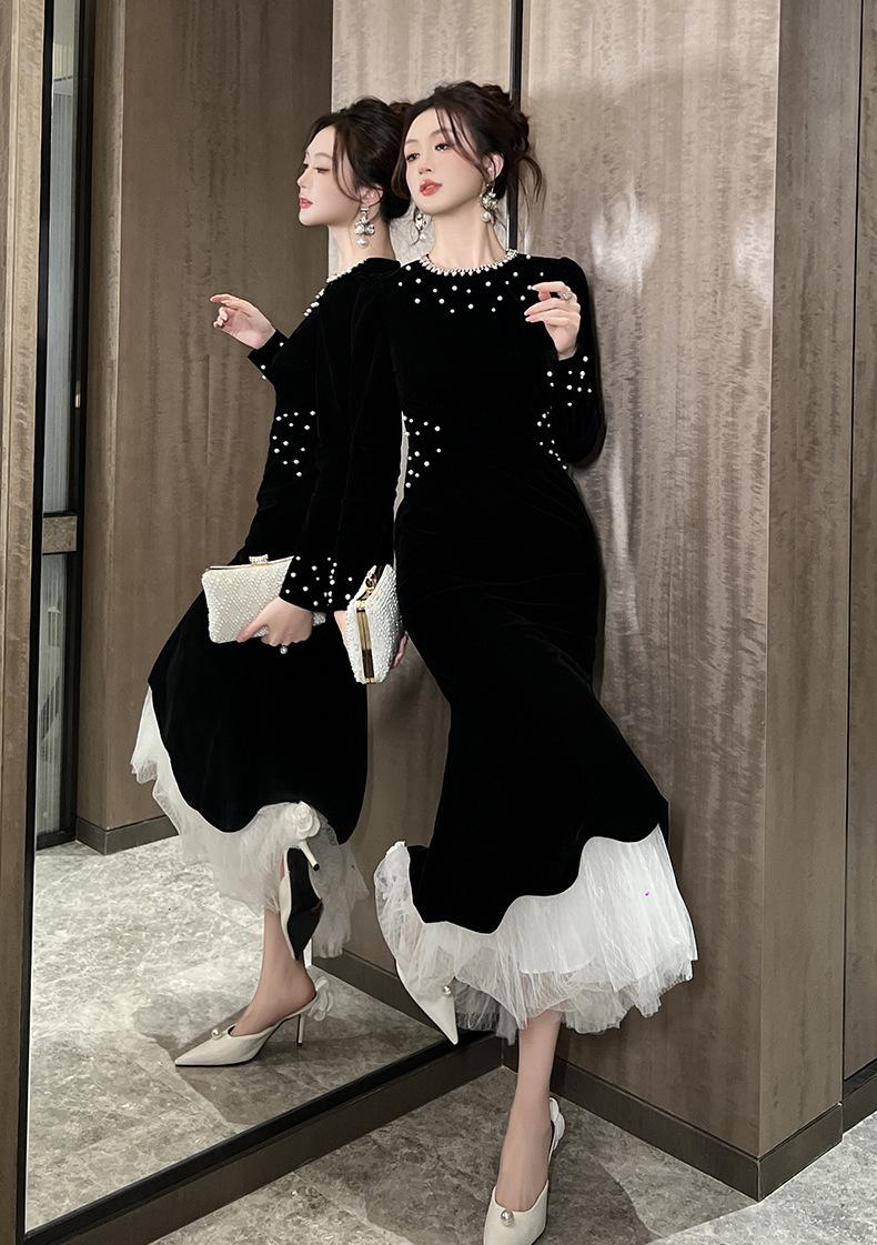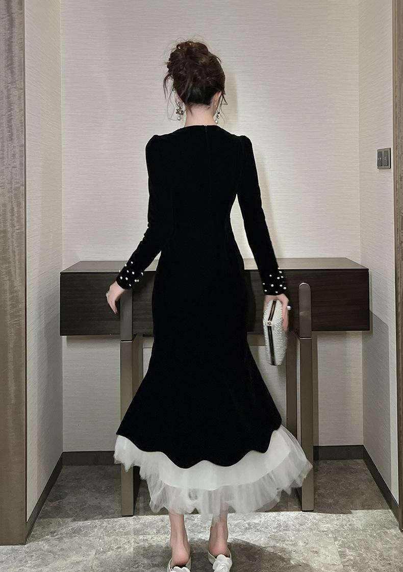 2025 Nuevo Otoño Vestido de Terciopelo de Cola de Pez Asimétrico Ajustado de Cuello Redondo con Cuentas Francesas para Mujer 21630