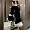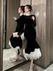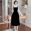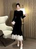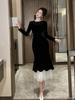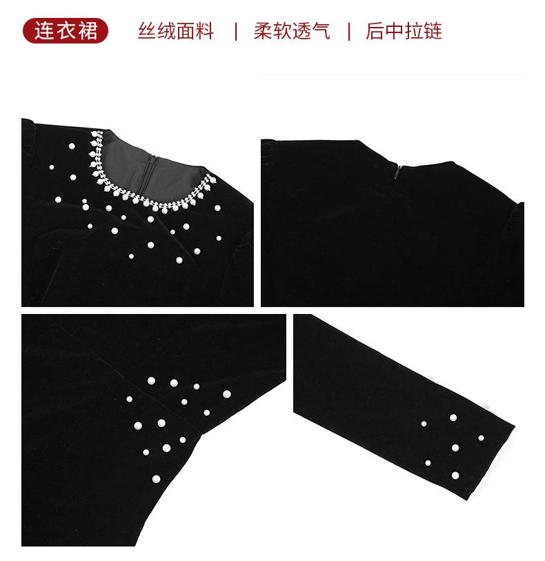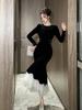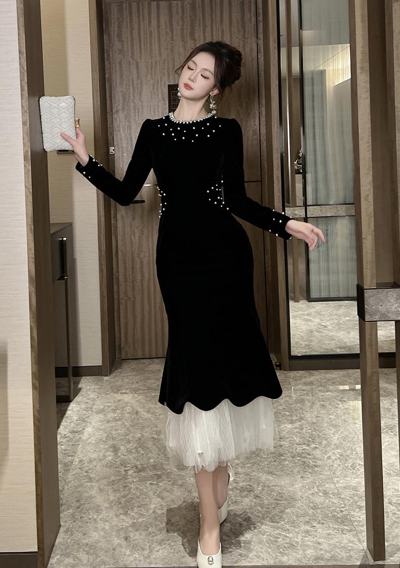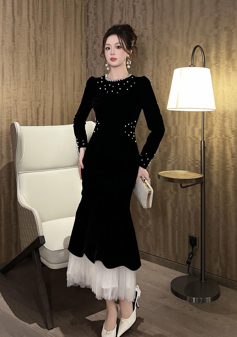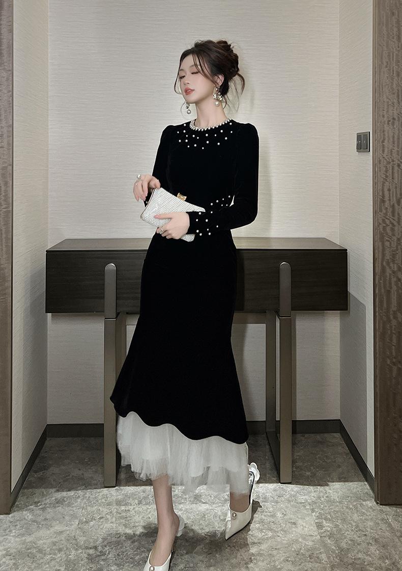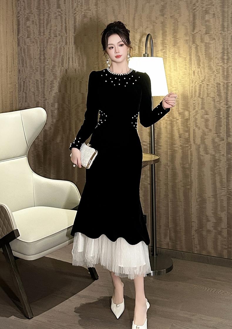 2025 Nuevo Otoño Vestido de Terciopelo de Cola de Pez Asimétrico Ajustado de Cuello Redondo con Cuentas Francesas para Mujer 21630