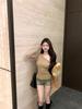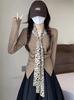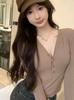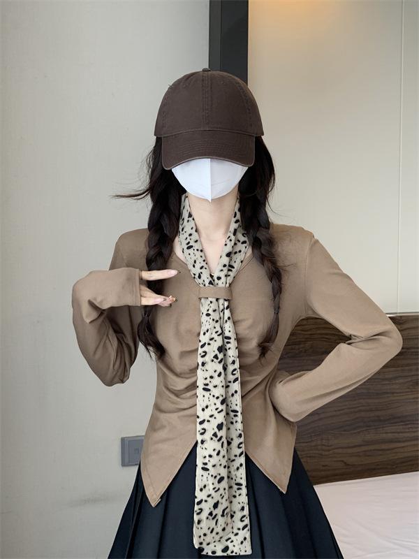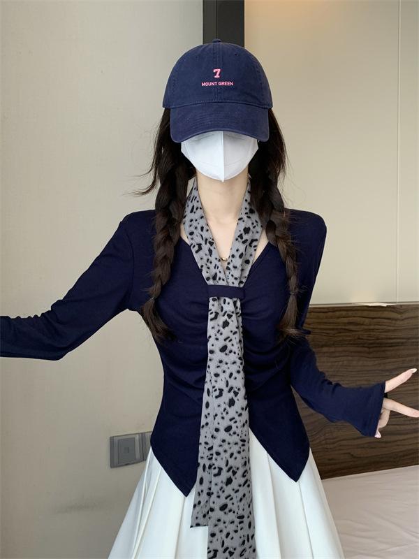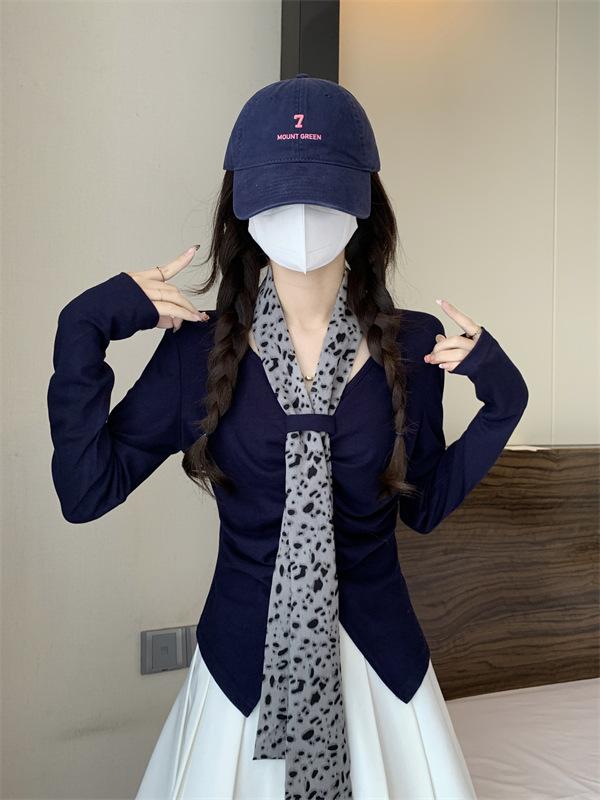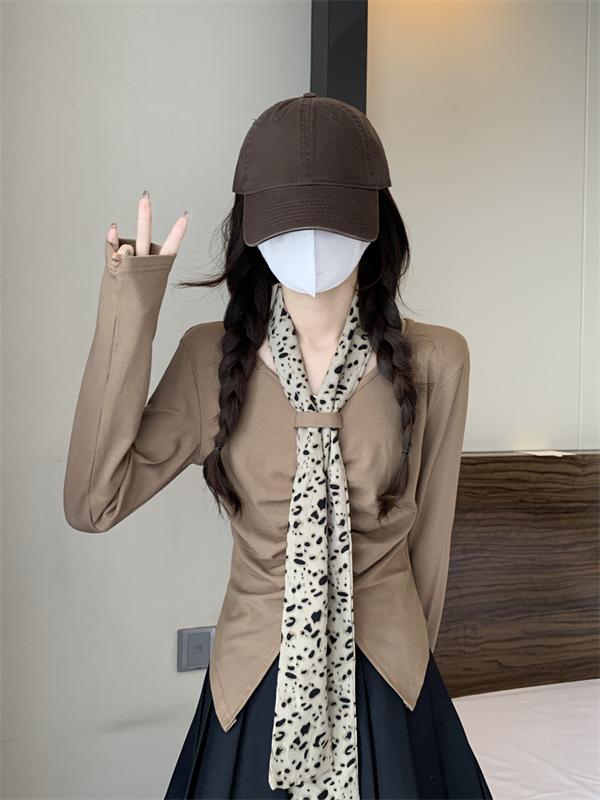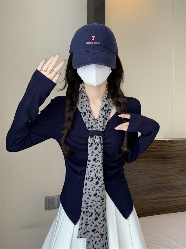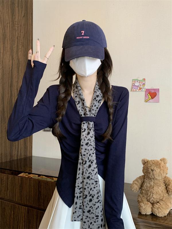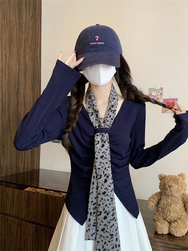 Otoño 2024 Nuevo Estilo Puro Deseo Cuello en V Spice Girls Sexy Camiseta Manga Larga Ajustada Adelgazante Bufanda de Seda Top Combinable Ins