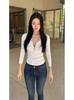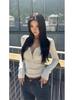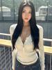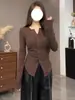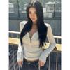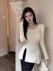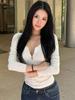 Camiseta de estilo chic de principios de otoño para chica, con botones, cuello medio abierto, hombros descubiertos, manga larga, corte entallado y adelgazante.