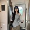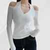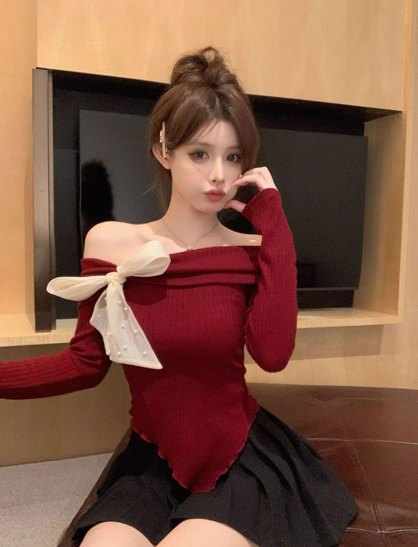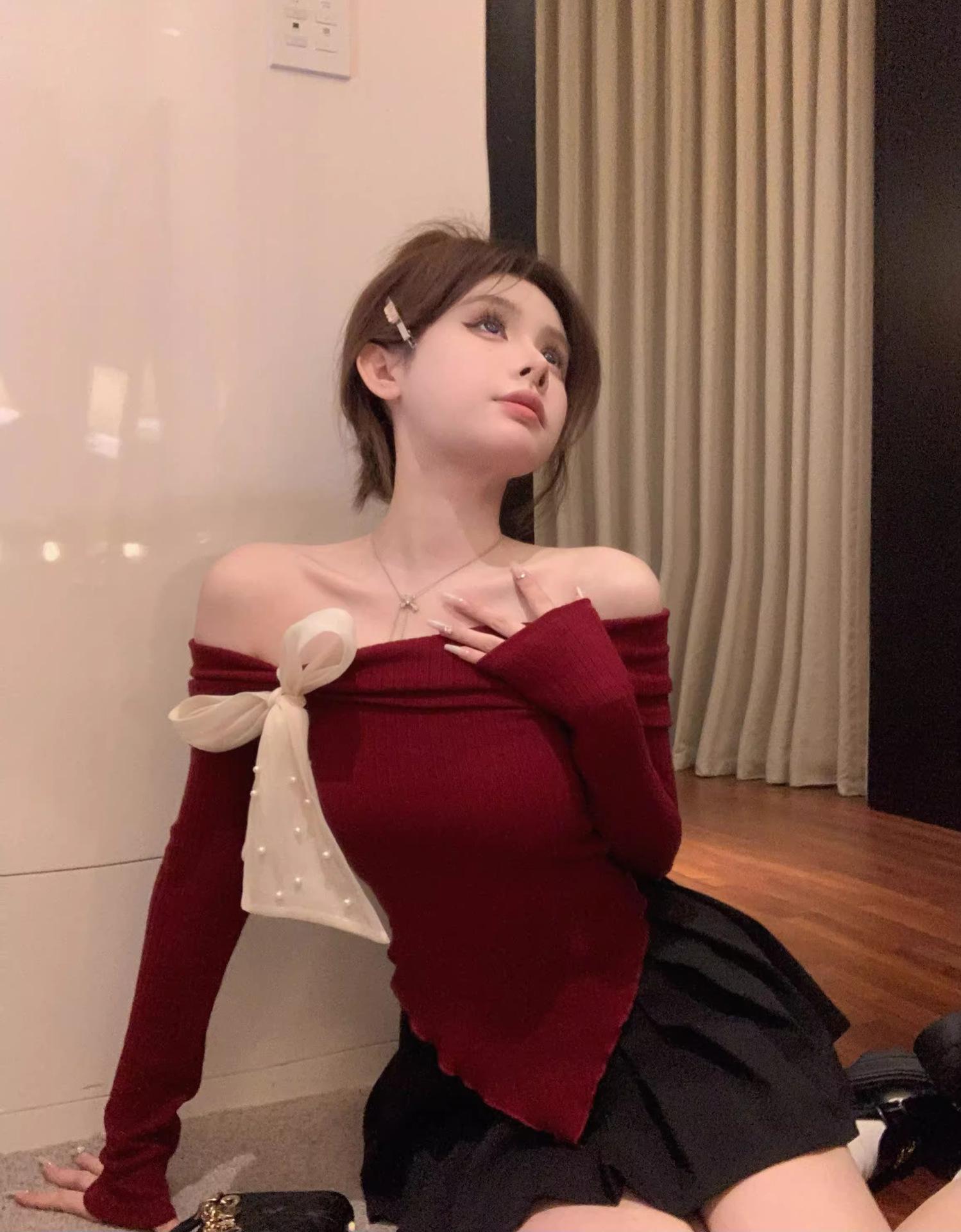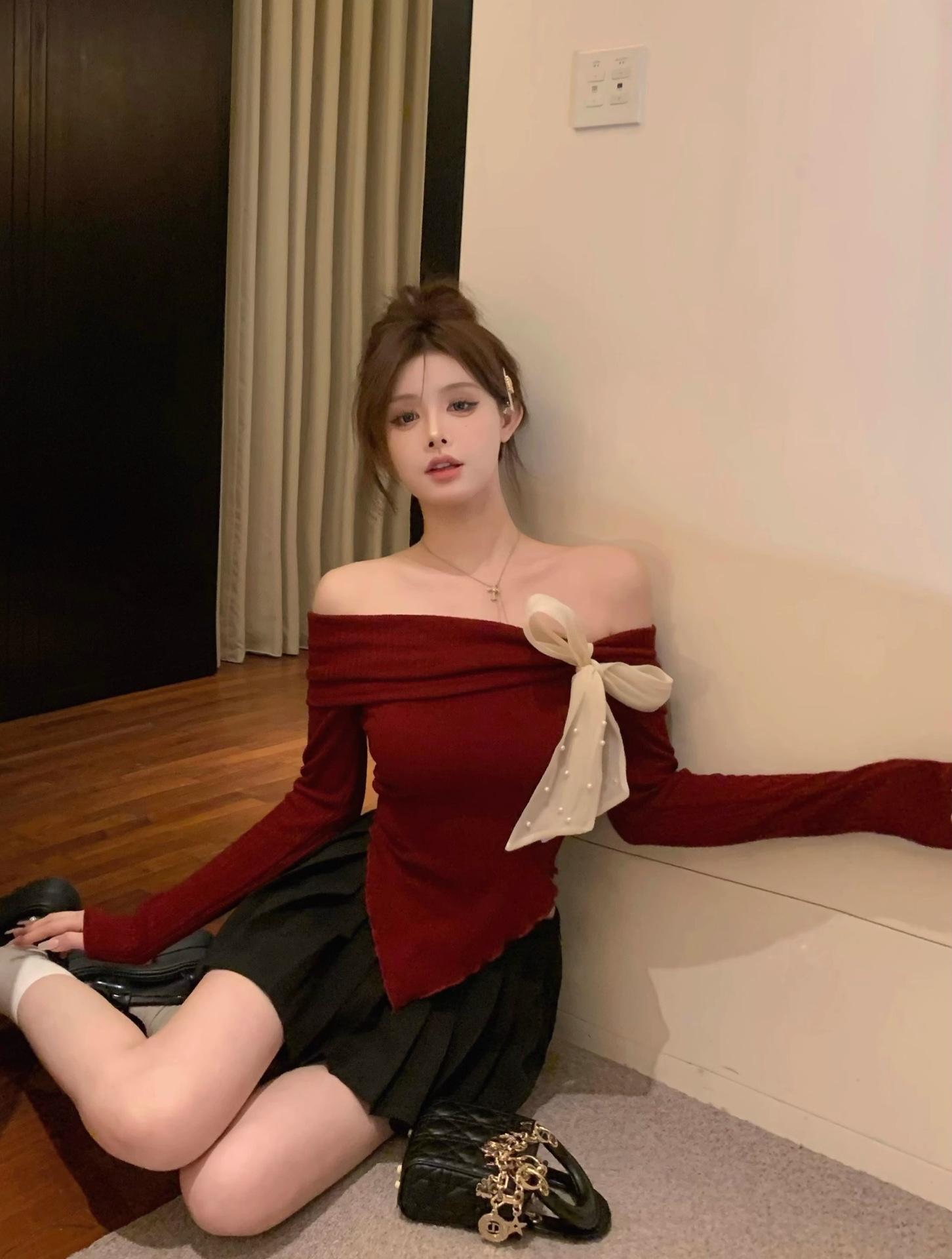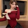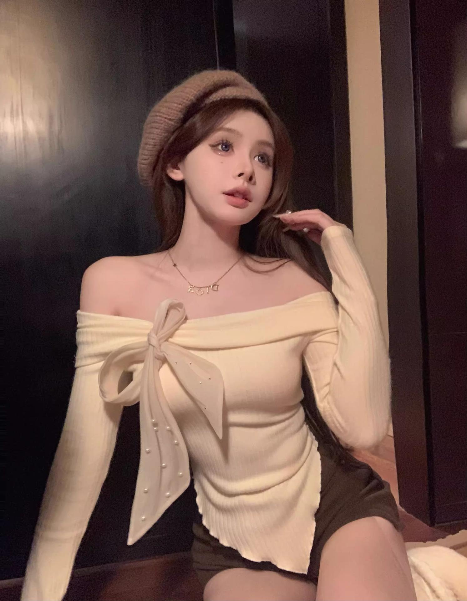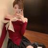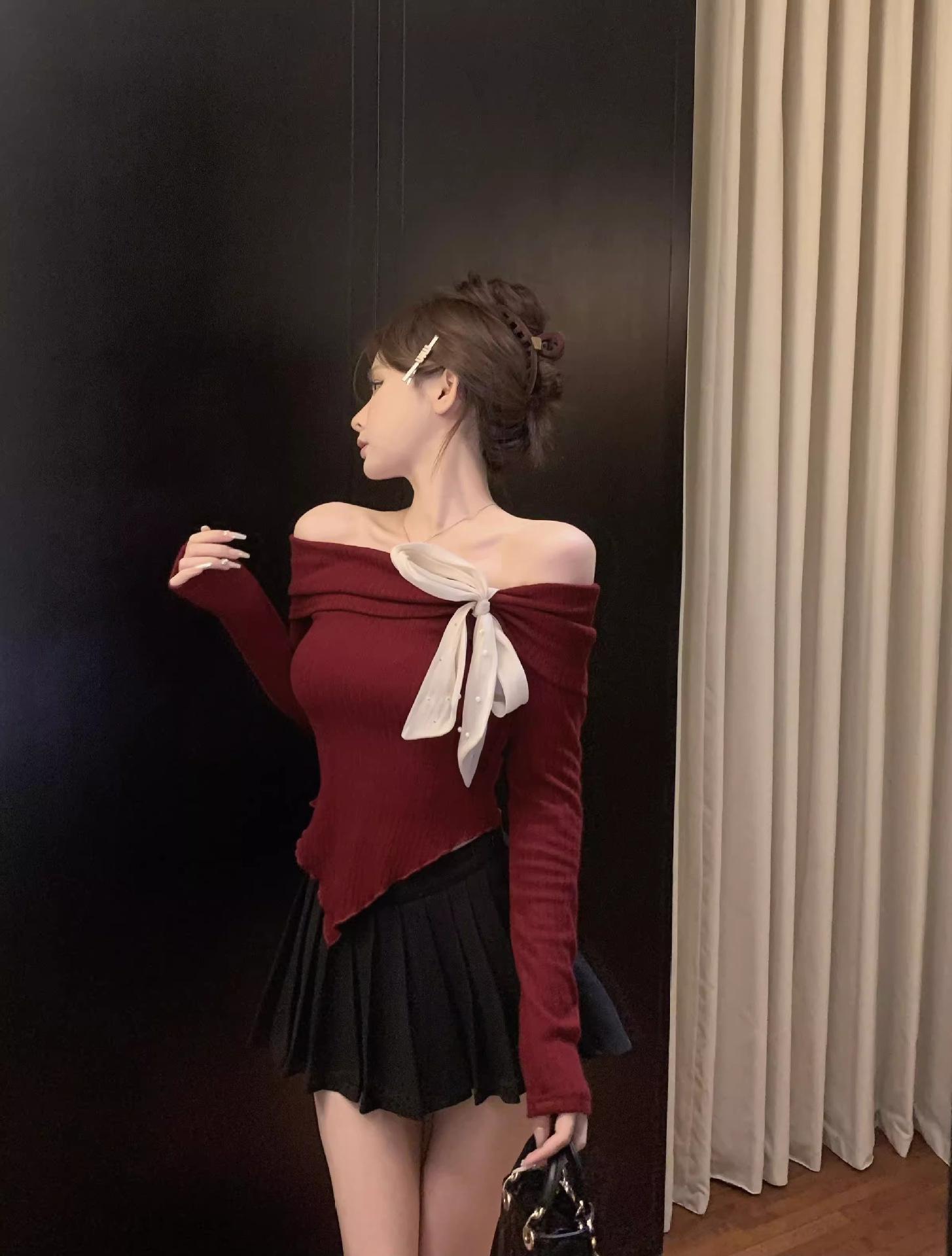 Camiseta Otoño Cuello Lazo Hombro Descubierto Manga Larga Spice Girls Ajustada Adelgazante Cintura Ceñida Nicho Top Único Ins Mujeres