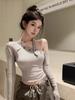 Camiseta de Invierno Irregular con Hombro Descubierto y Cuello Halter de Manga Larga para Chicas Hot Sexy Ajustada Adelgazante Ins Nicho Top de Hombro Descubierto para Mujer