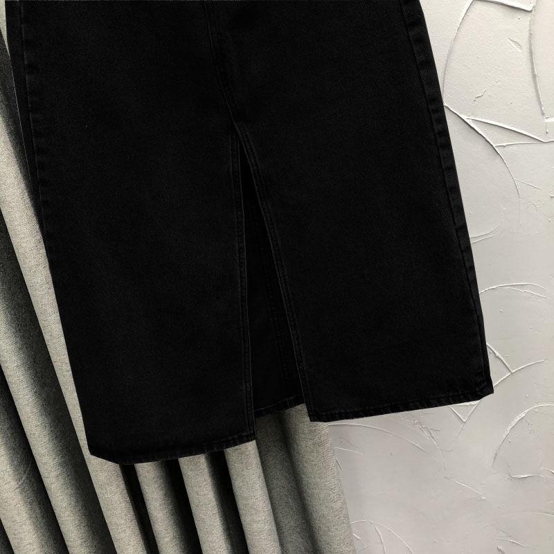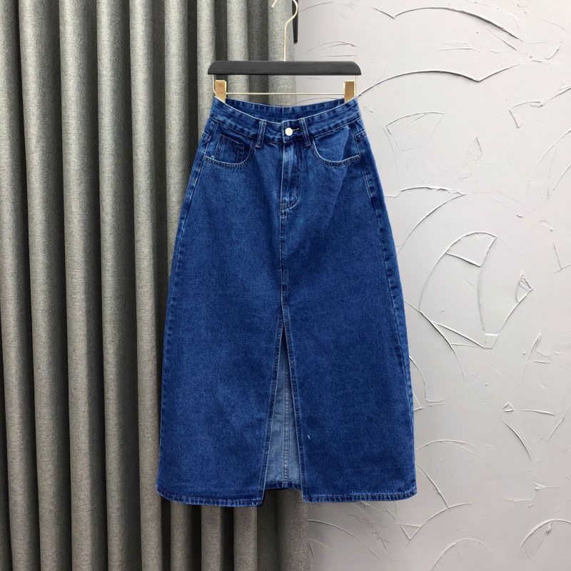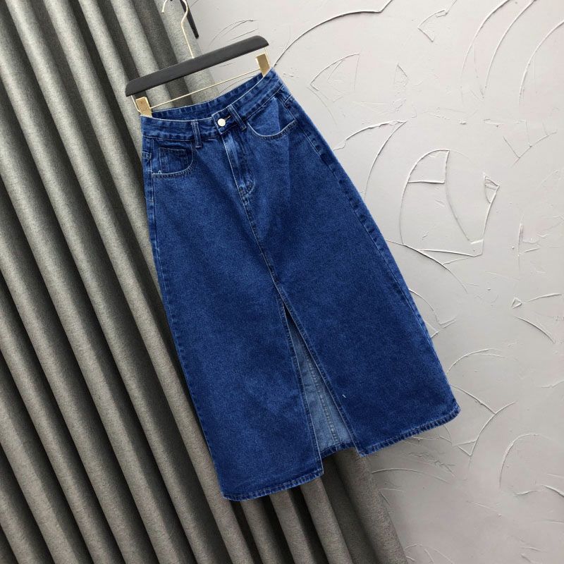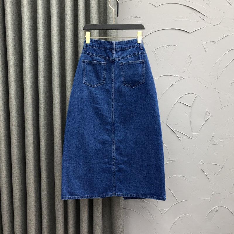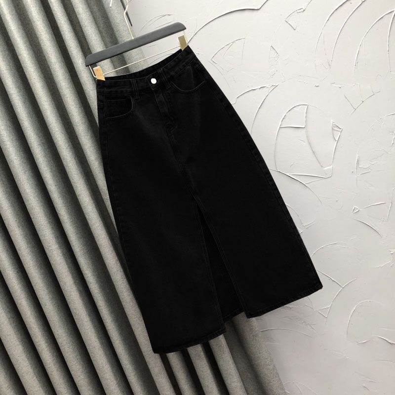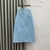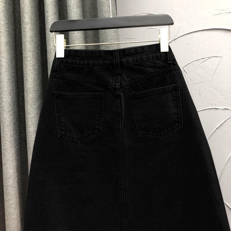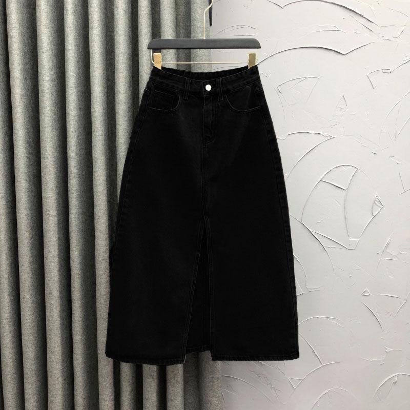 2025 Falda A-line elástica de cintura alta para cadera, adelgazante, para ir al trabajo, falda de mezclilla, belleza dulce, diseño de abertura delantera, ropa exterior