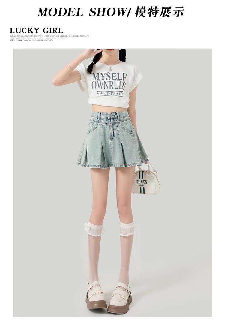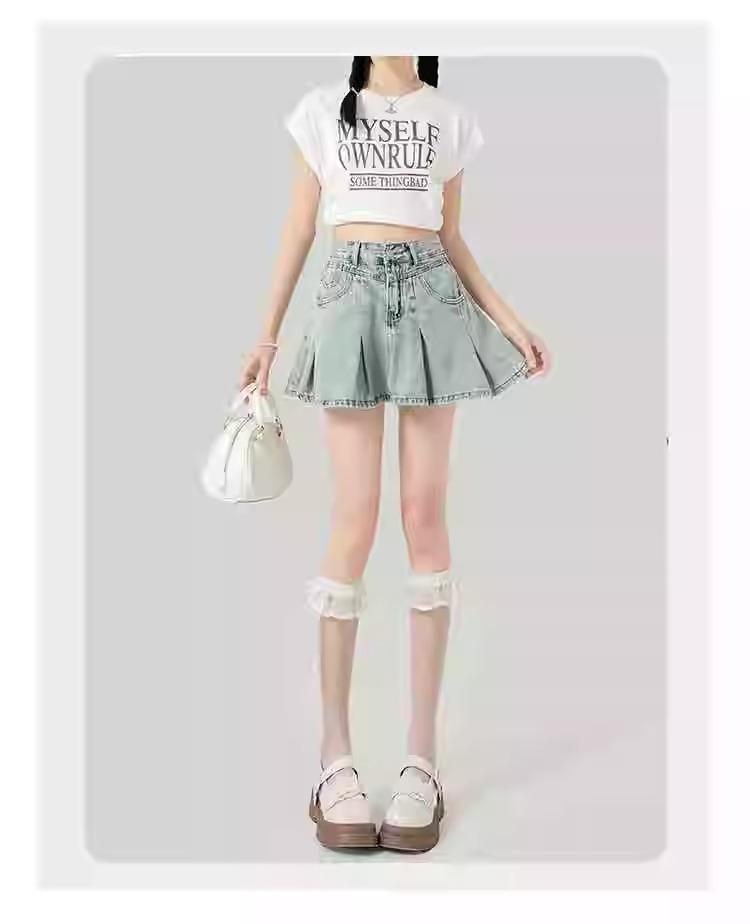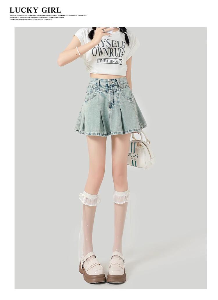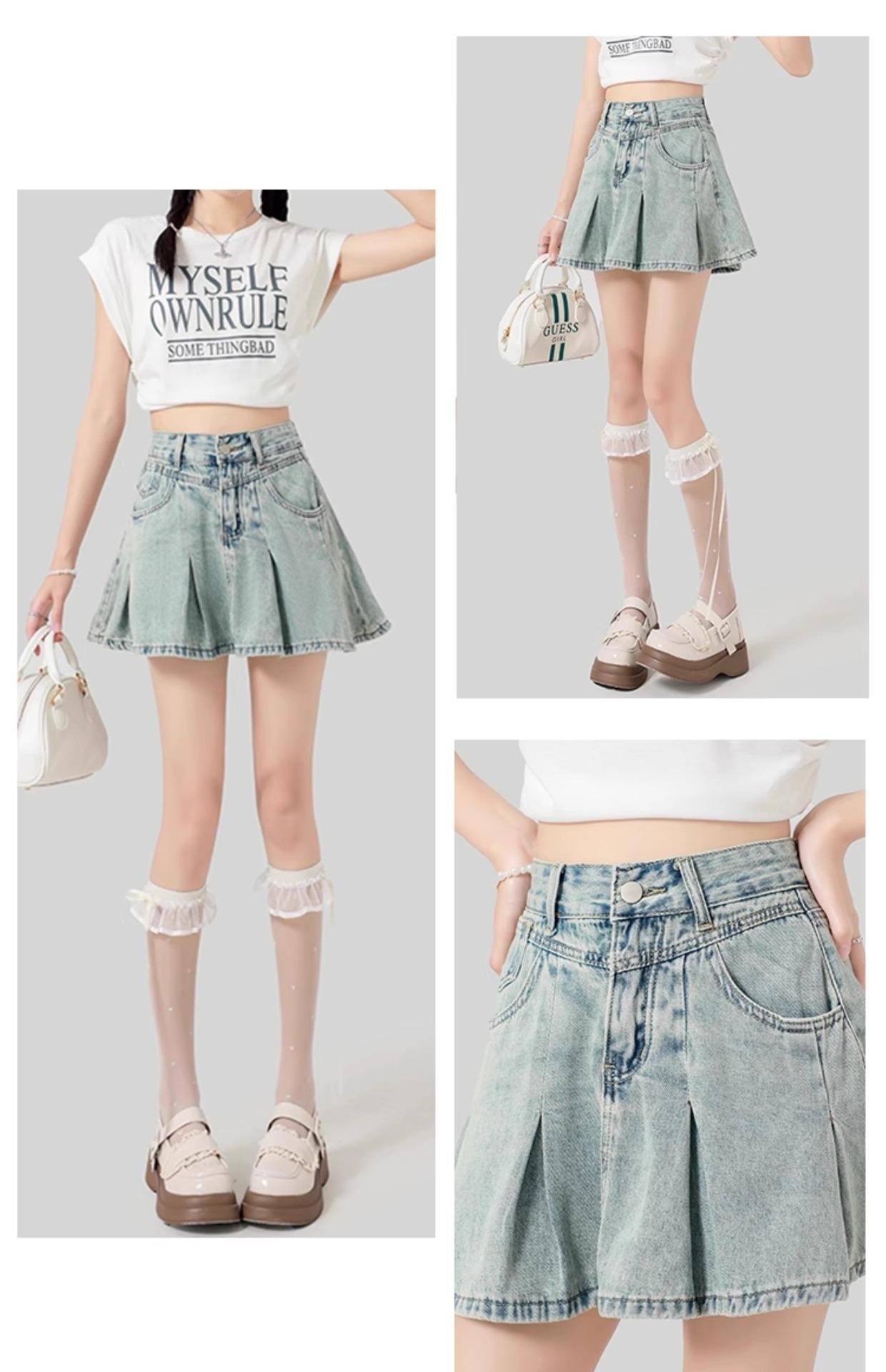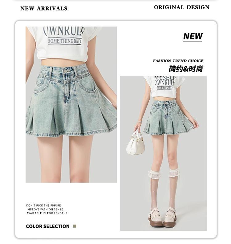 Falda de mezclilla plisada lavada vintage para mujer, estilo Spice Girl que reduce la edad, color claro, falda línea A, cintura alta, adelgazante, falda plisada