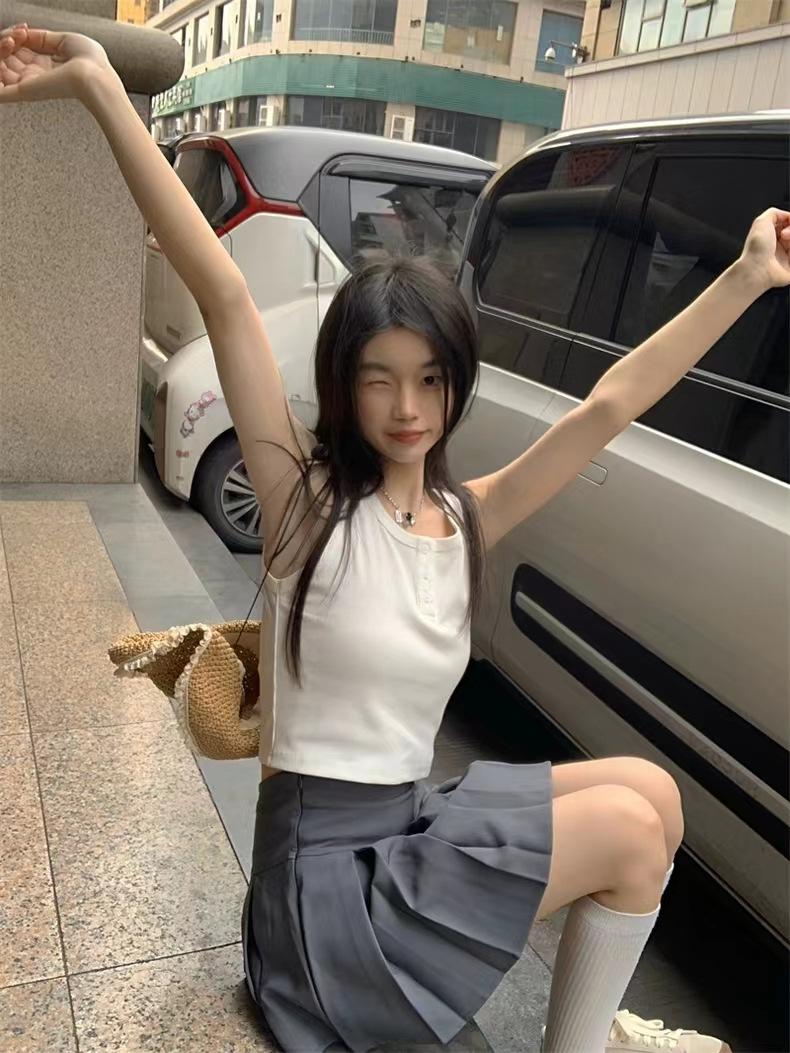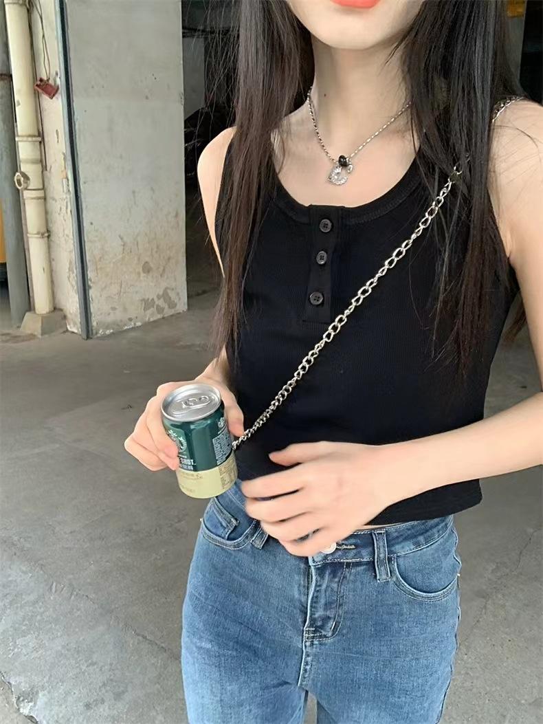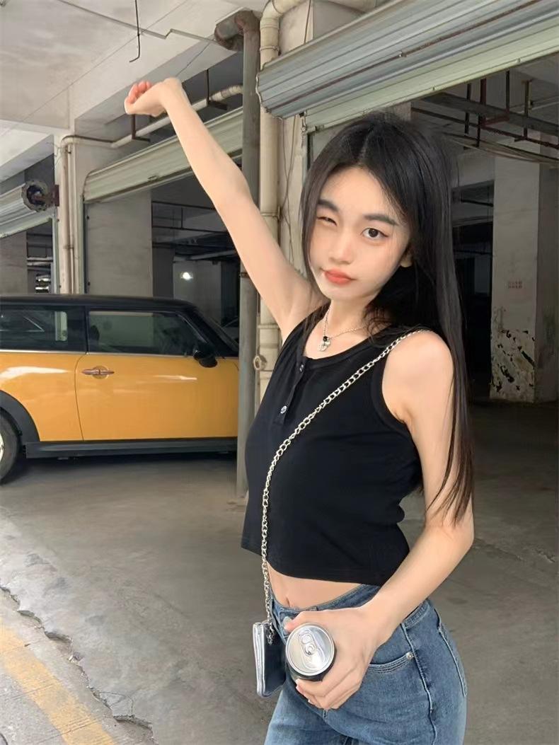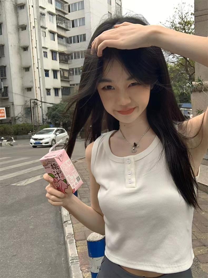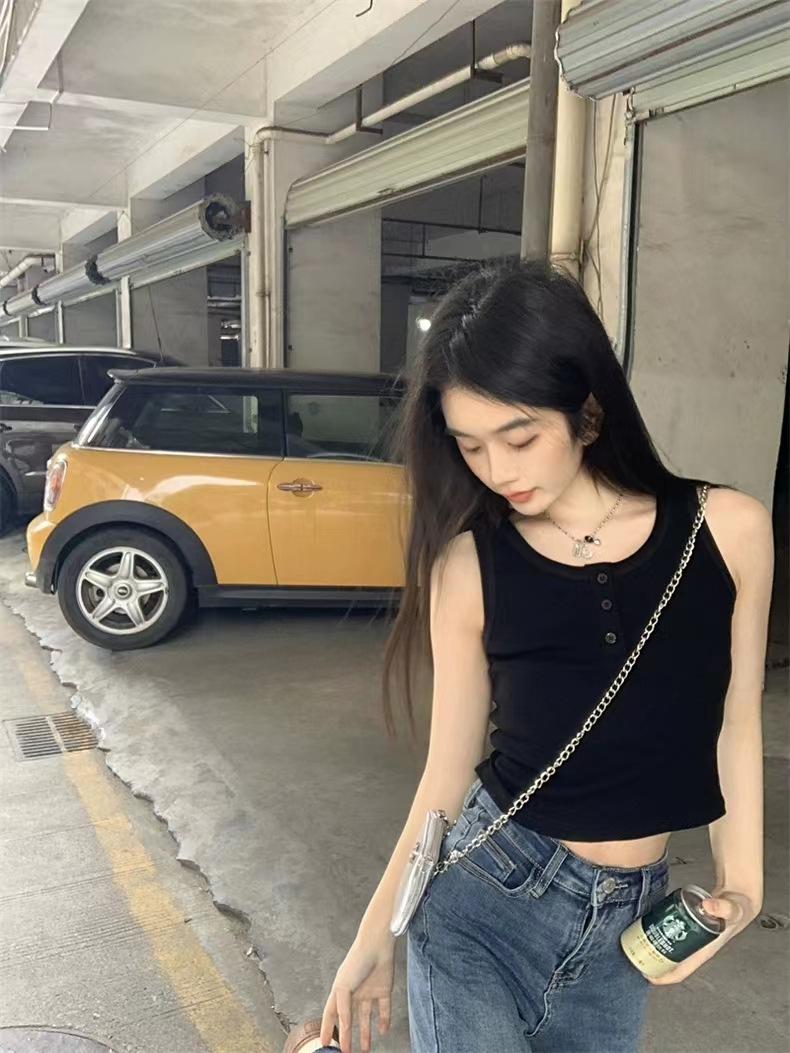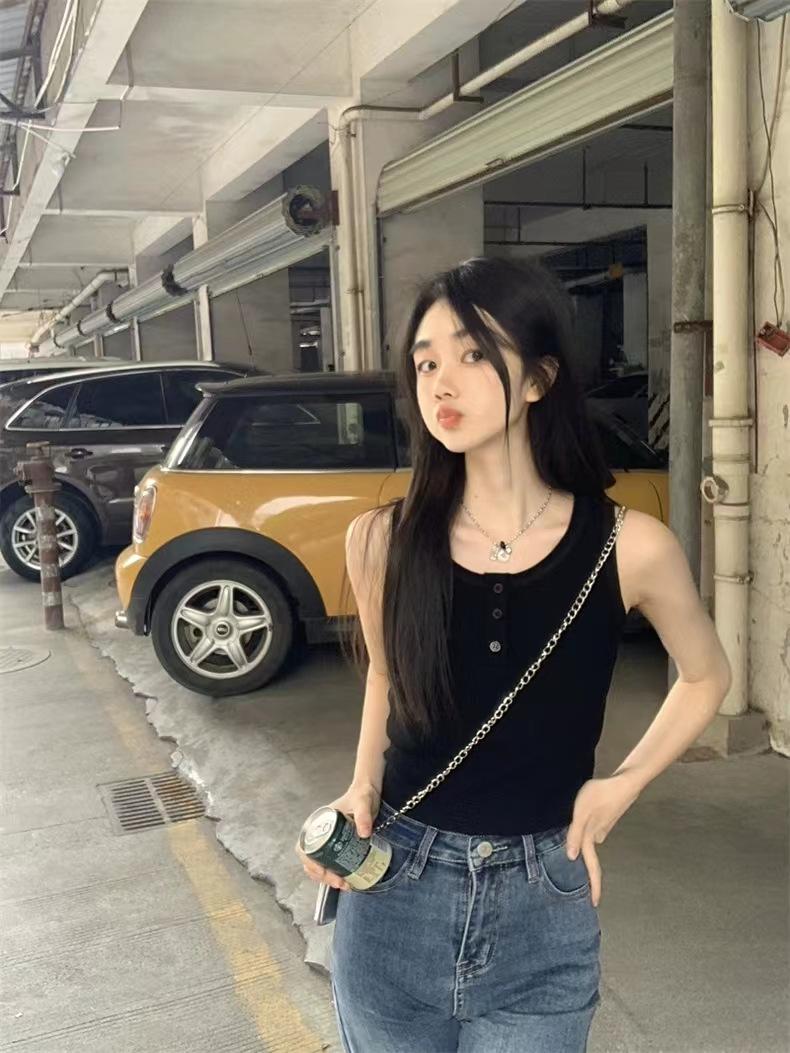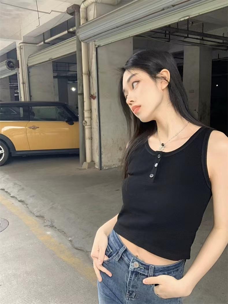 Camisola de Botones sin Mangas de Verano Nueva Ajustada Corta Camiseta Básica Top Nicho Ins